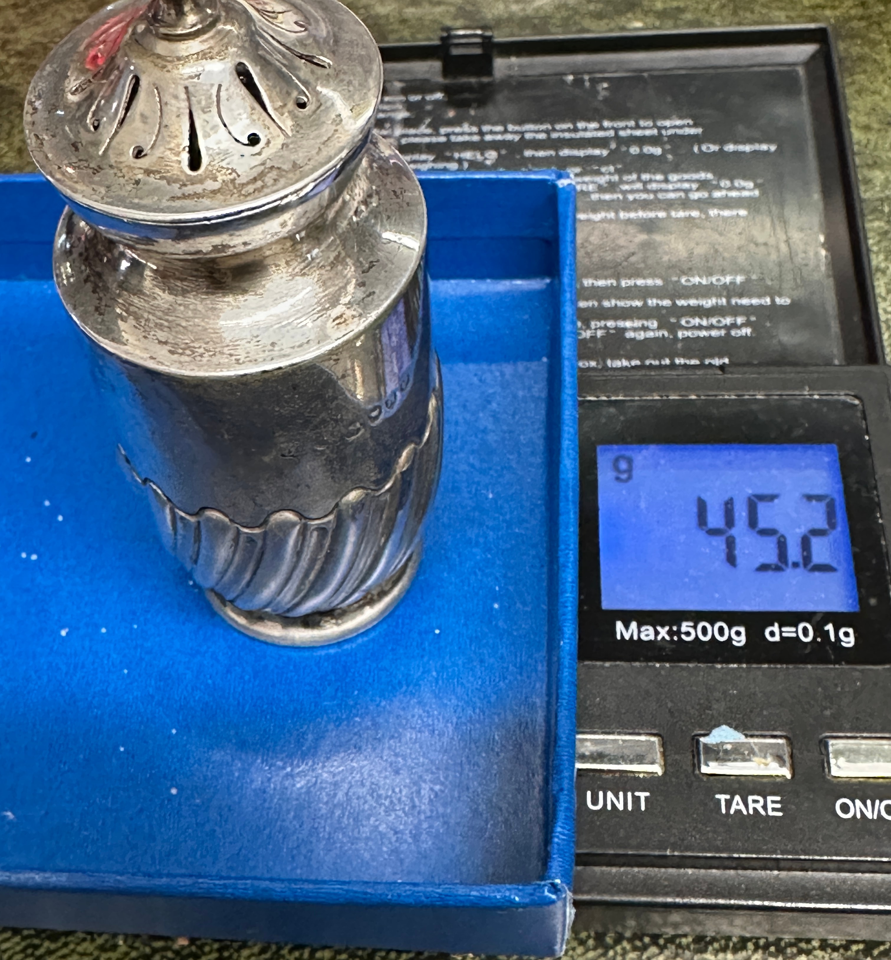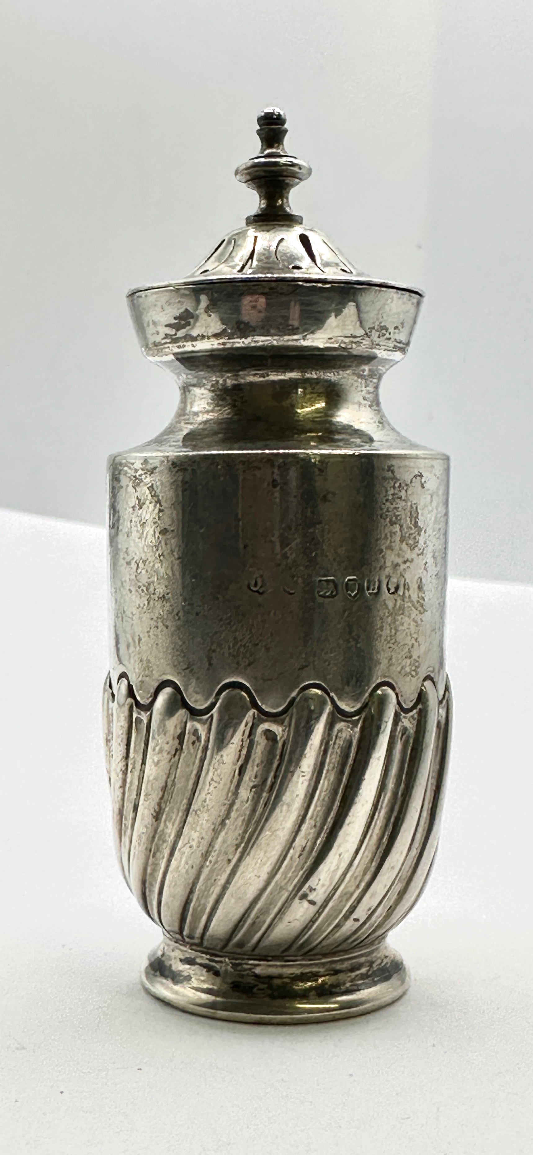 A 925 silver sugar caster, featuring a cylindrical upper body above a twisted, fluted lower section. It is topped with a domed, pierced lid culminating in a small finial. Visible markings on the upper body include the letters “W.J.” followed by an unclear symbol and then “OUGH”.