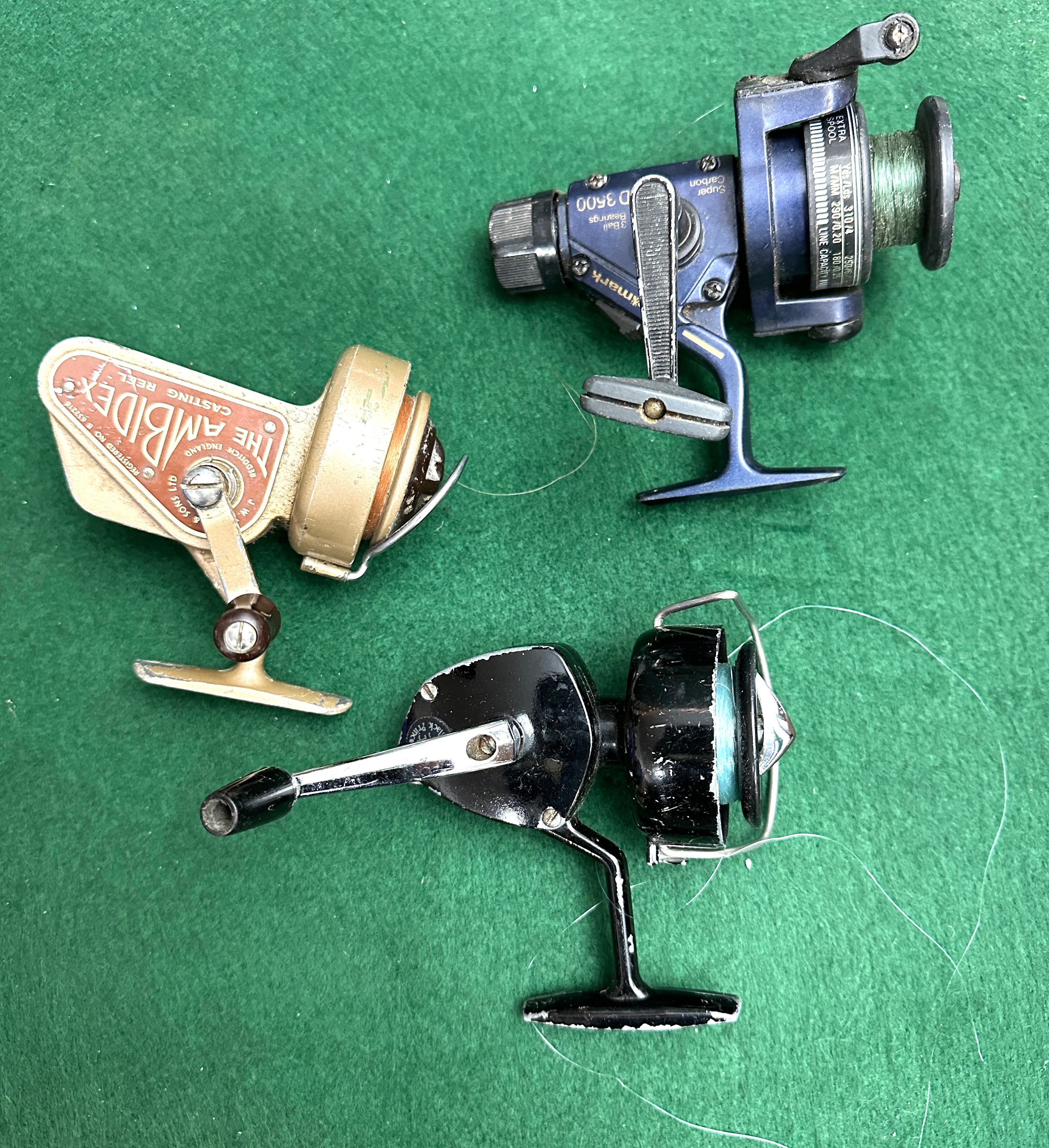 This lot comprises three vintage fishing reels, primarily constructed from metal with some plastic components. The top-right reel is a blue spinning type, marked “DAMARK D 3500” with “3 Ball Bearings” and “EXTRA SPOOL,” detailing line capacities, and is spooled with green fishing line. The top-left reel is a cream and gold-toned closed-face casting reel, clearly labeled “THE AMBIDEX CASTING REEL,” “J.W. & SONS LTD REDDITCH ENGLAND,” and “REGISTERED NO. B 652218.” The bottom reel is a black spinning reel, with partial visible marking “Black Prince,” and is spooled with light blue fishing line.