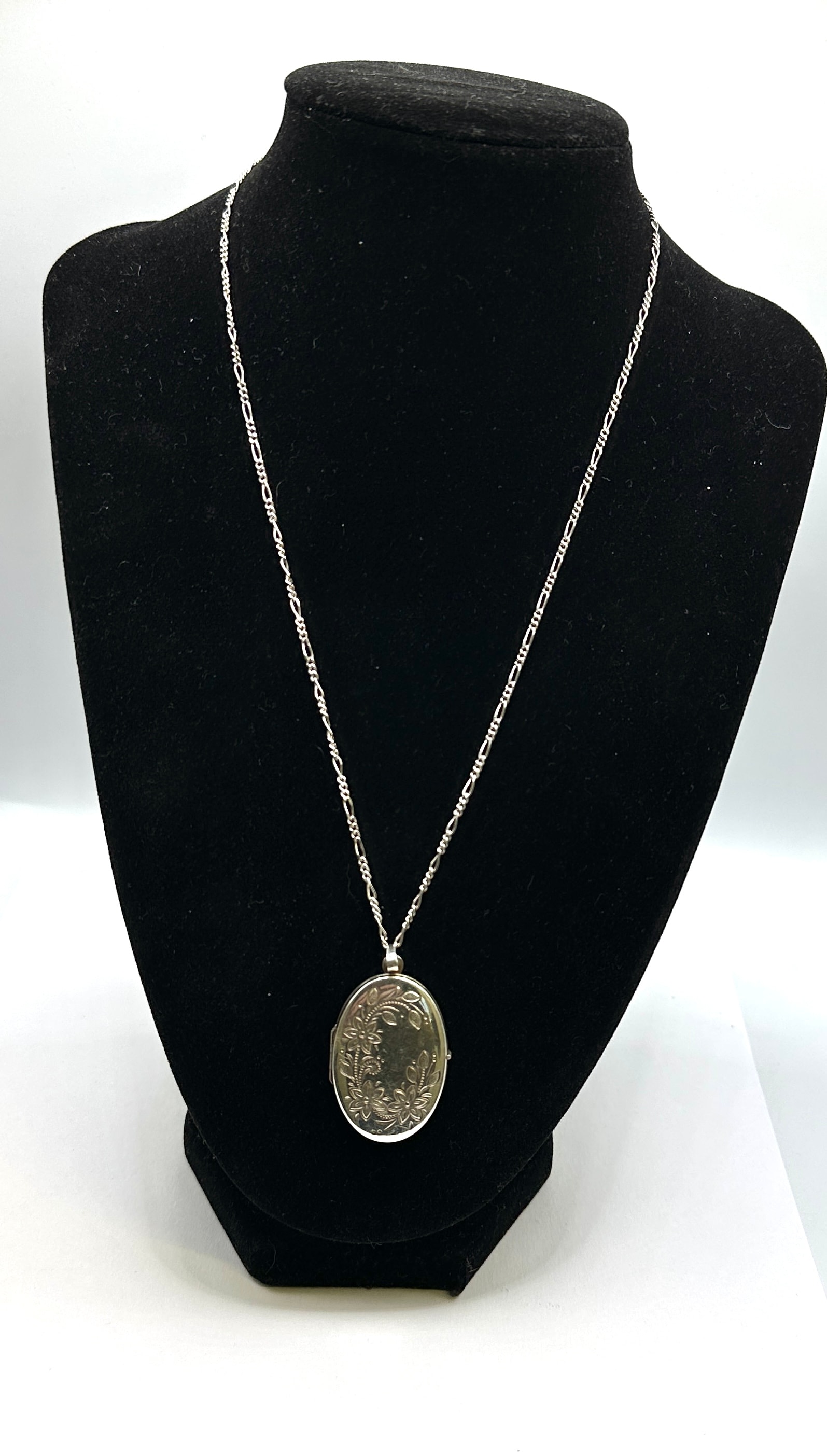 This vintage 925 silver necklace features an oval locket suspended from a Figaro link chain with a lobster clasp. The front of the locket is adorned with an intricate etched or engraved floral motif, depicting leaves and blossoms. The back of the locket is plain and unadorned. No discernible text, hallmarks, or maker’s marks are visible on either the locket or the chain.