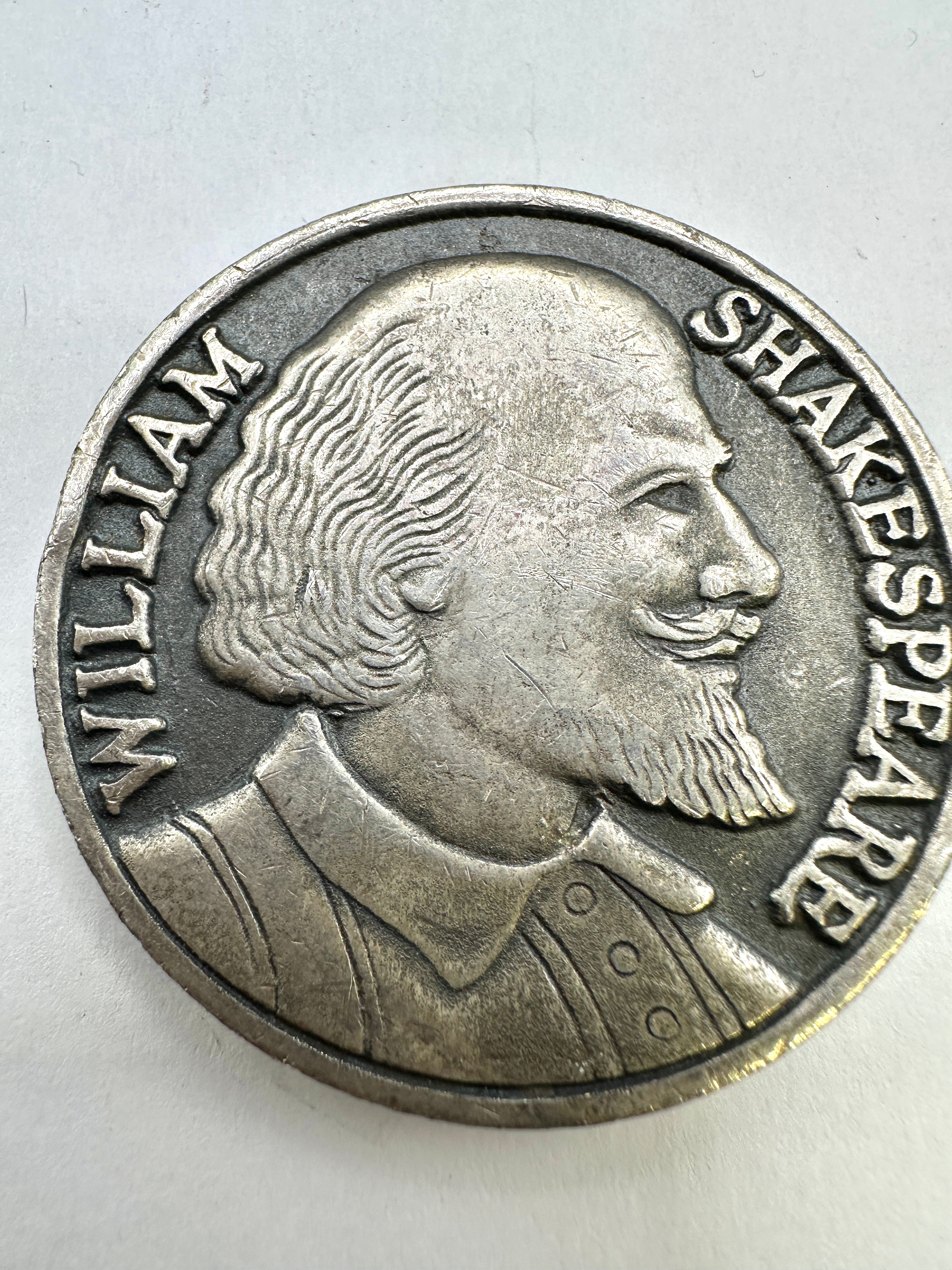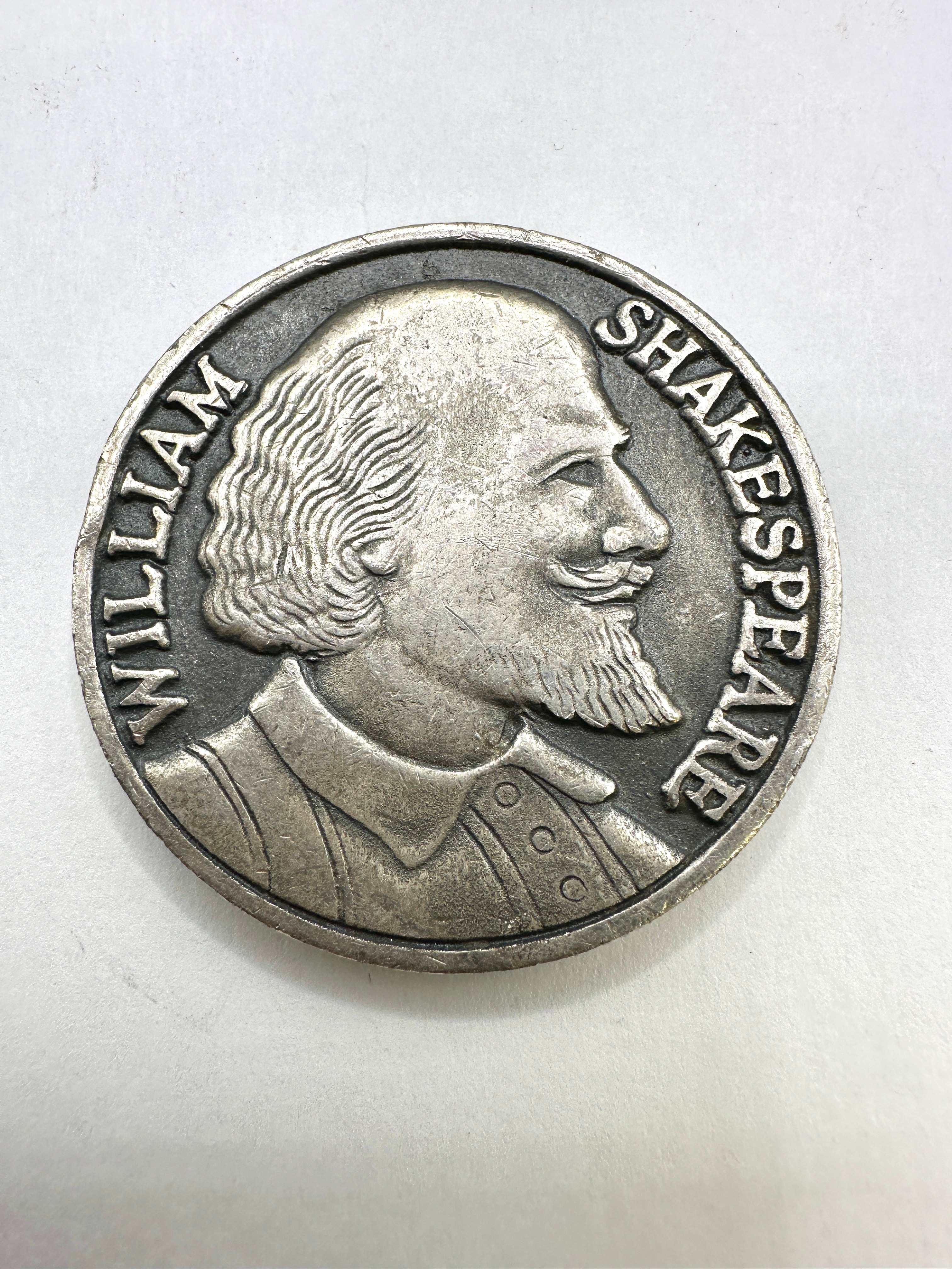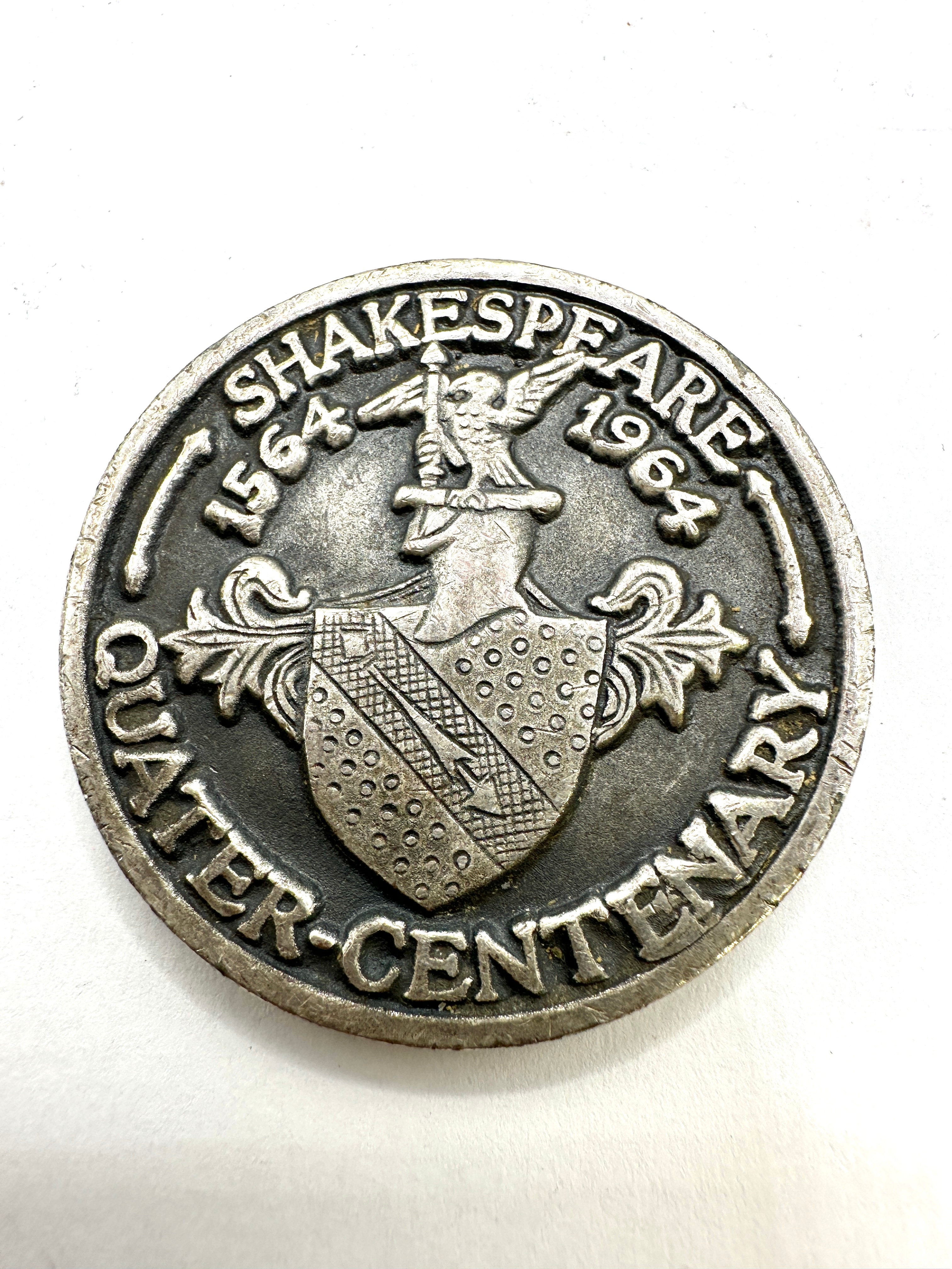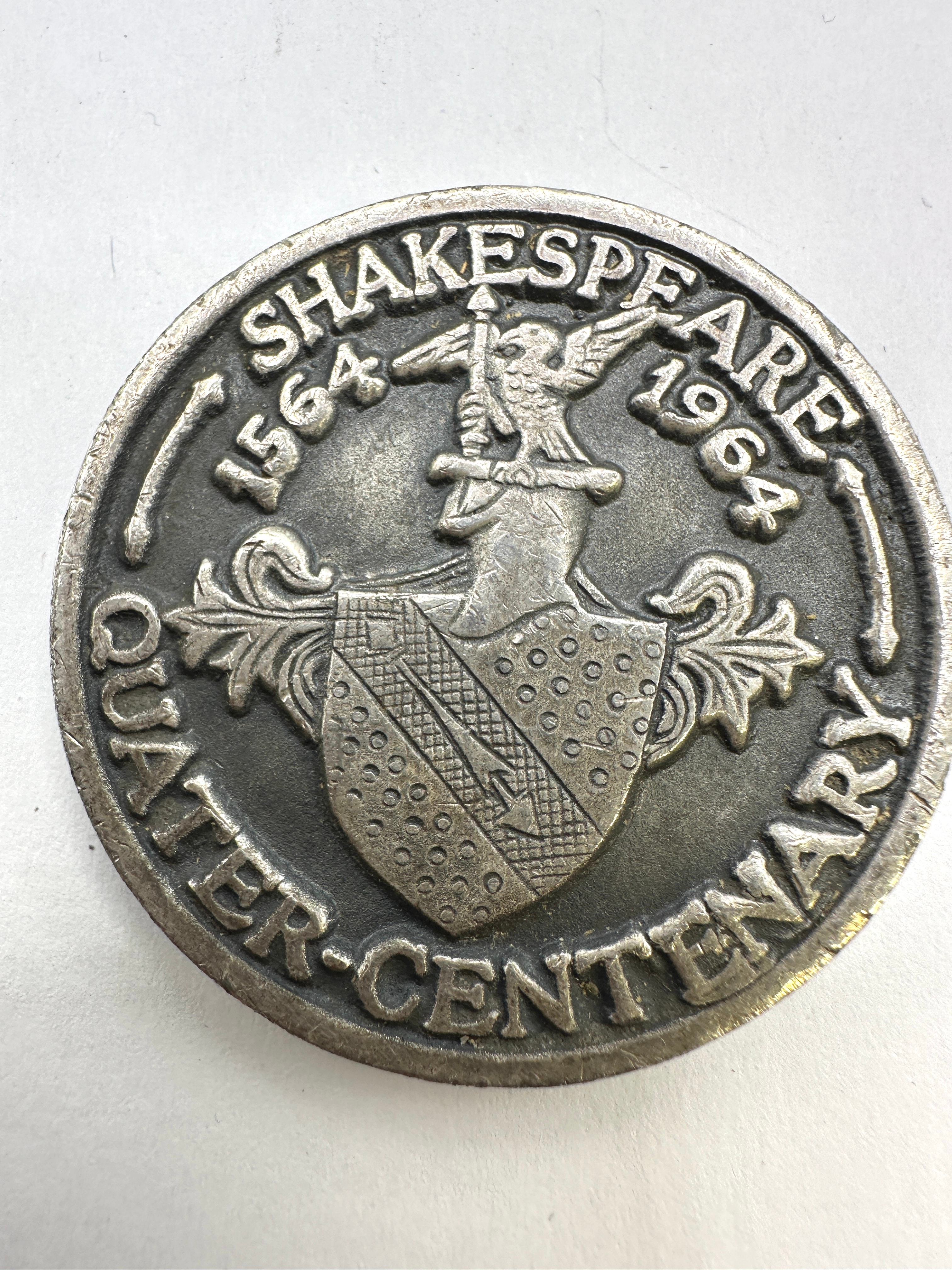 This double-sided, circular commemorative medallion, likely cast in a base metal such as pewter or a similar alloy, dates to 1964, marking the 400th anniversary of William Shakespeare’s birth. The obverse features a relief profile bust of William Shakespeare, facing left, encircled by the text “WILLIAM SHAKESPEARE.” The reverse displays a heraldic shield design with a bend and stippled fields, surmounted by a bird, possibly an eagle or falcon, grasping an object. This design is framed by the inscription “SHAKESPEARE 1564 1964” above and “QUATER-CENTENARY” below.
