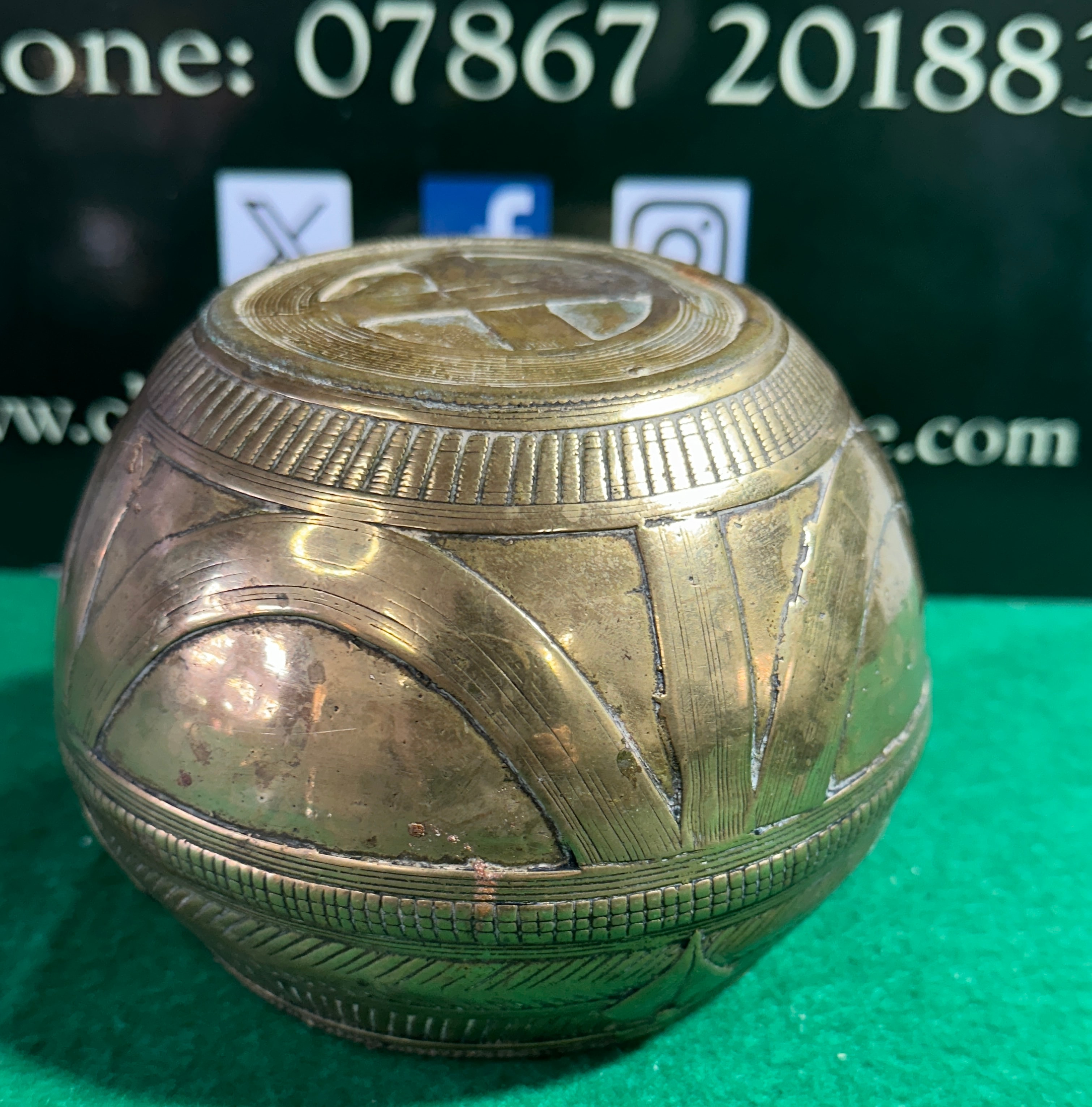 A Dhokra Lost Wax Bronze/Brass Rice Measure Bowl, originating from India. This small, round-bodied metallic vessel is crafted using the lost wax technique, featuring intricate geometric decoration across its surface. The design includes parallel hatched lines, cross-hatching, and prominent stylized shield or leaf-like motifs arranged in vertical panels around the body and horizontal bands near the rim and base. It has a slightly constricted neck leading to an open rim and a flattened base. No specific maker’s marks or textual inscriptions are visible.