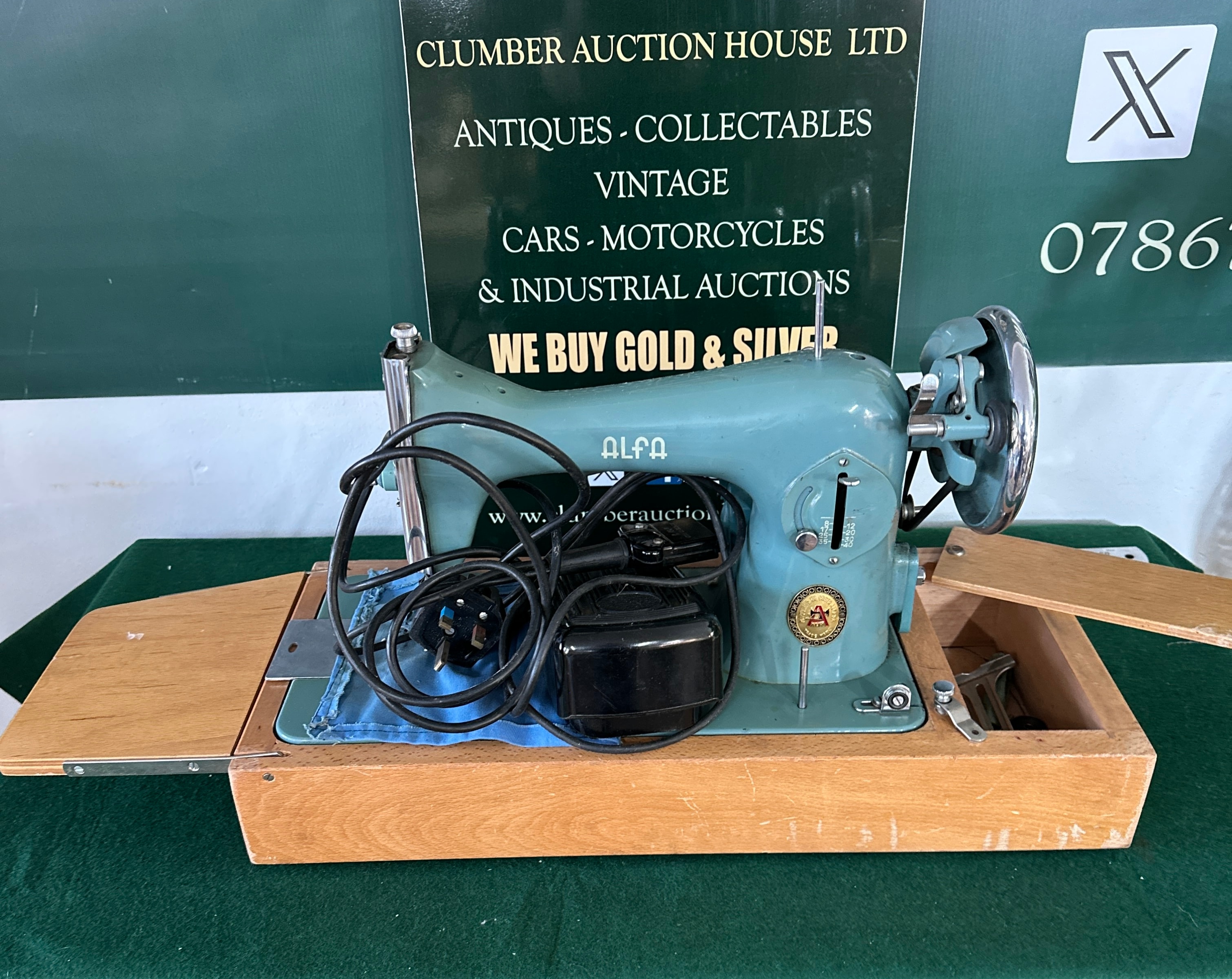 A vintage Alfa sewing machine, featuring a light blue/aqua green cast metal body mounted into a natural wooden base. The machine is prominently marked “ALFA” on its arm and includes a gold-colored medallion with a red “A” and the text “MÁQUINAS DE COSER ALFA” (ALFA SEWING MACHINES) and “TRADE MARK”. It is equipped with an external motor, power cord, handwheel, and adjustment dials displaying numerical settings. A wooden compartment integrated within the base contains various metal and plastic sewing accessories, including bobbins. The entire unit is accompanied by a separate, shaped brown carrying case, appearing to be made of leatherette or faux leather. The item is consistent with a mid-20th century period.