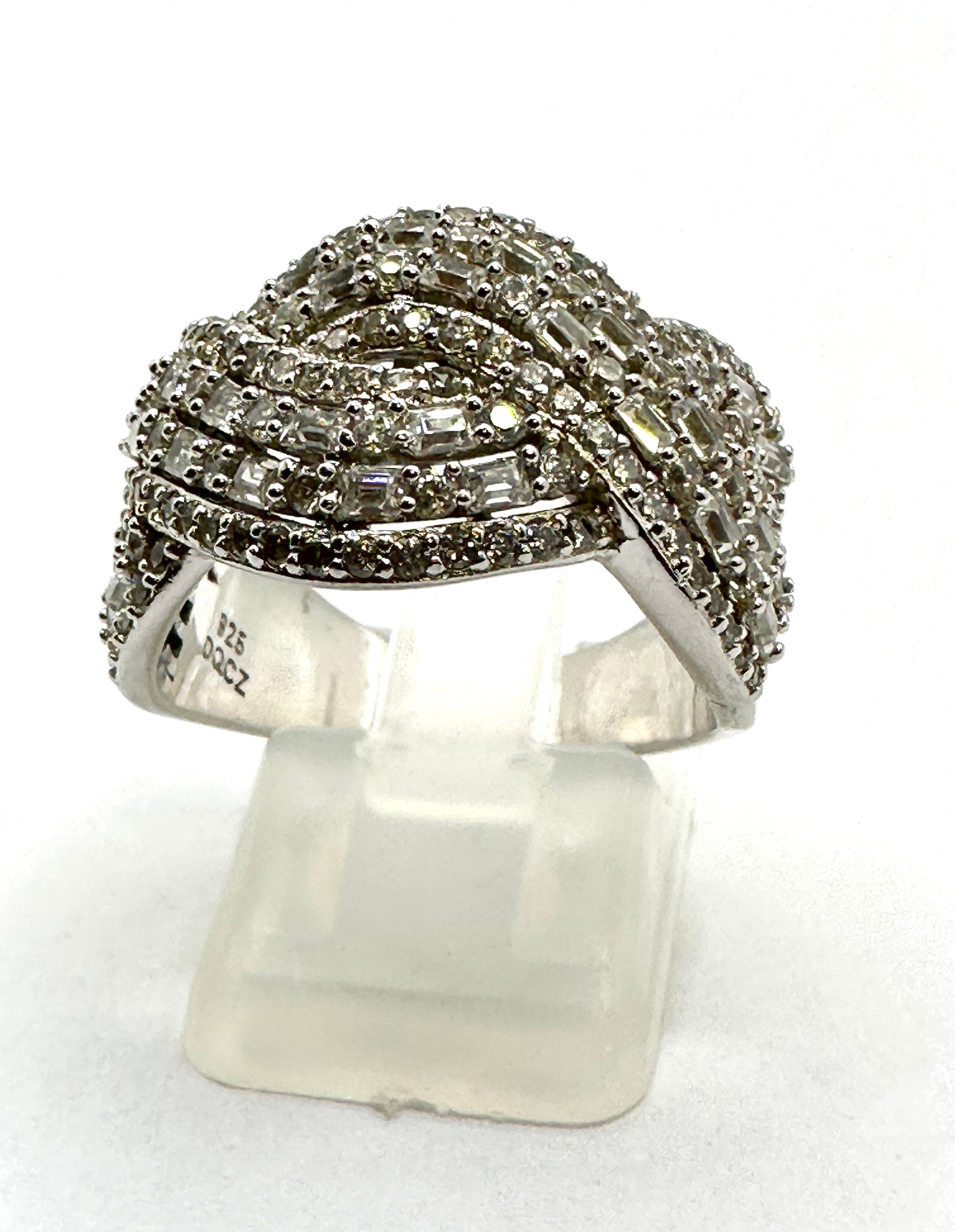 A JTV Diamonique sterling silver ring, featuring a contemporary-style wide, domed band with intertwined rows densely set with numerous clear, faceted cubic zirconia stones. The stones comprise both baguette and round cuts, creating a sparkling, pavé-like surface. The interior shank is marked ‘925’ for sterling silver and ‘DQCZ’, a hallmark commonly associated with Diamonique, JTV’s brand of cubic zirconia.