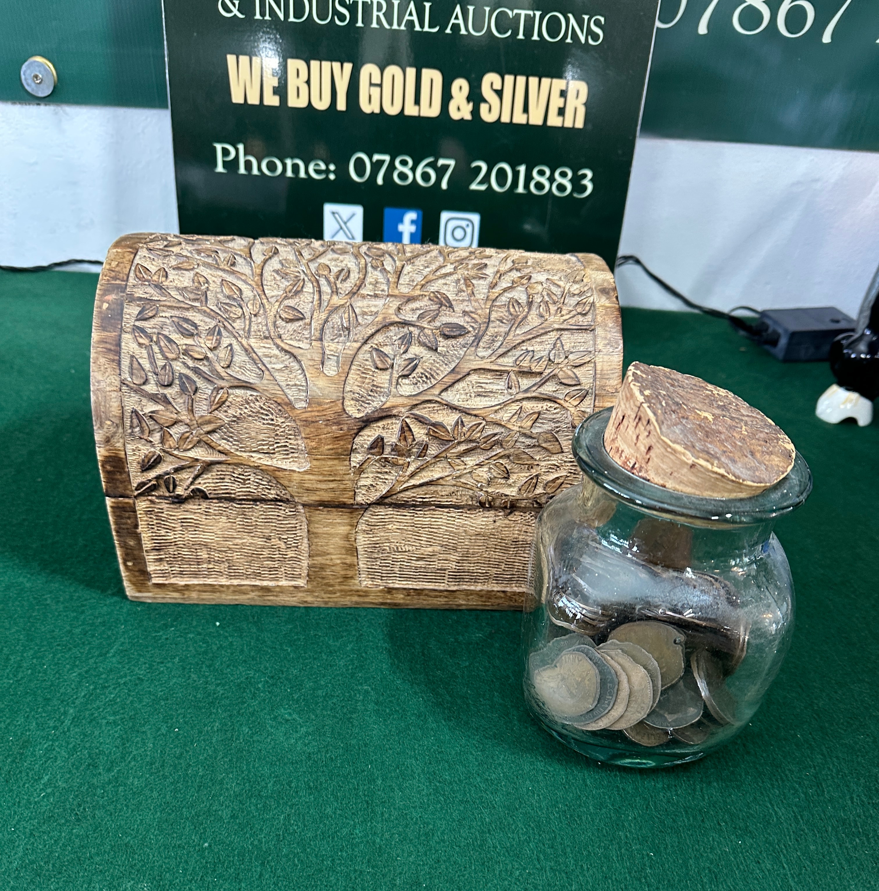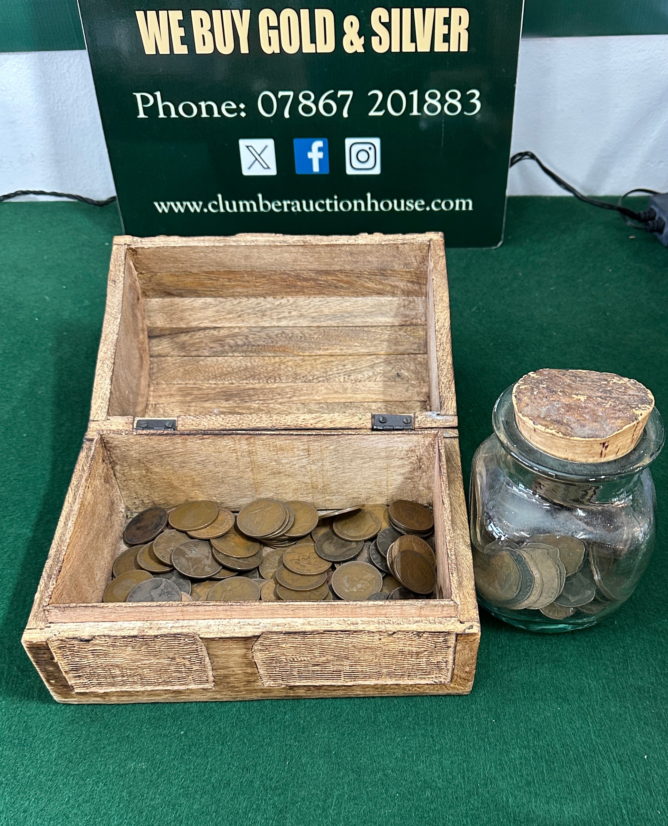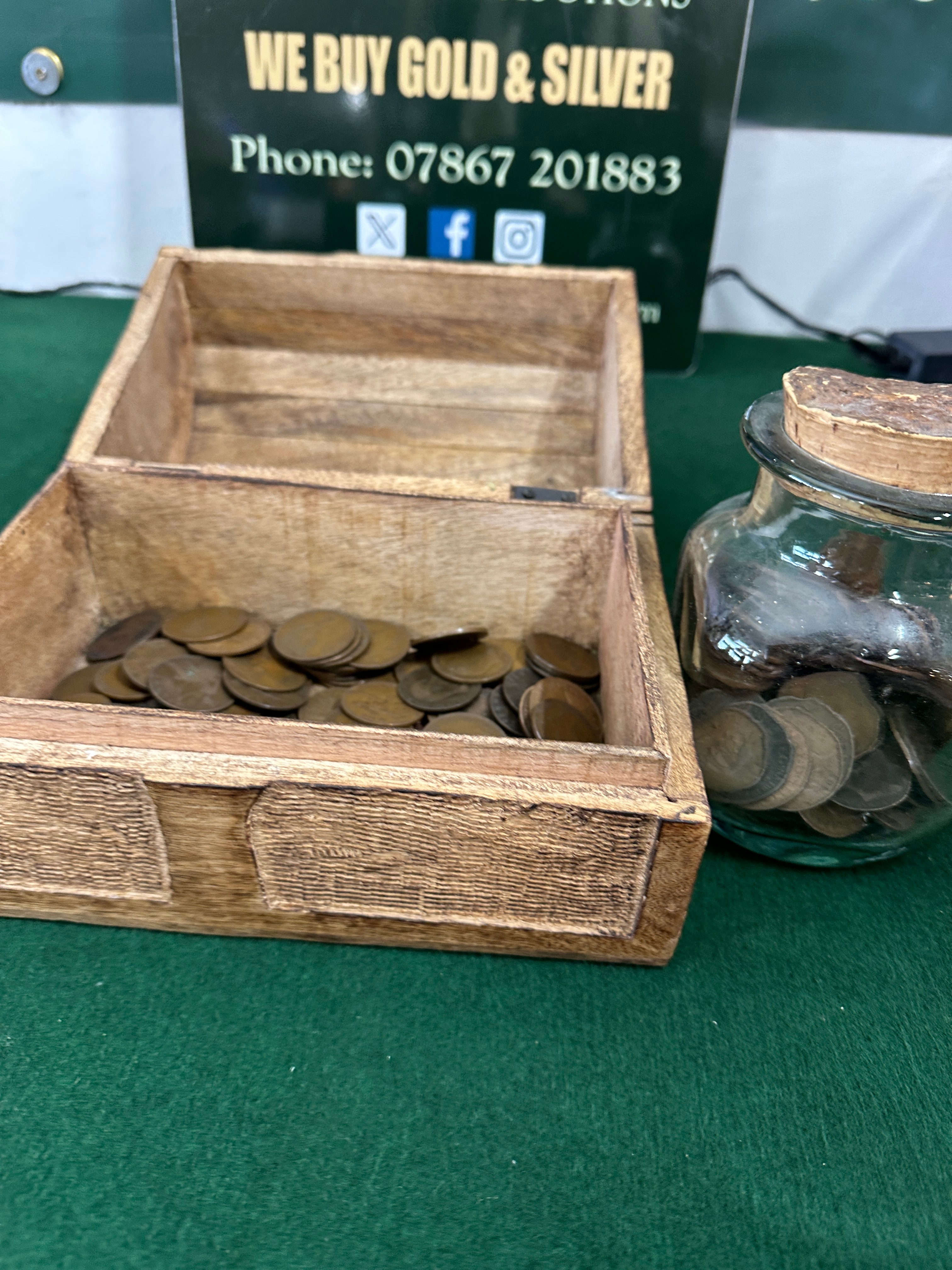 A collection of numerous circulated copper or bronze pennies, presented in a small, rustic wooden box with a hinged lid, carved with a ‘Tree of Life’ motif, and a clear glass jar sealed with a cork stopper. The wooden box is crafted from light-colored wood. The glass jar is of a simple, functional design. The metallic contents exhibit a reddish-brown patina, varying degrees of wear, tarnish, and minor surface corrosion.
