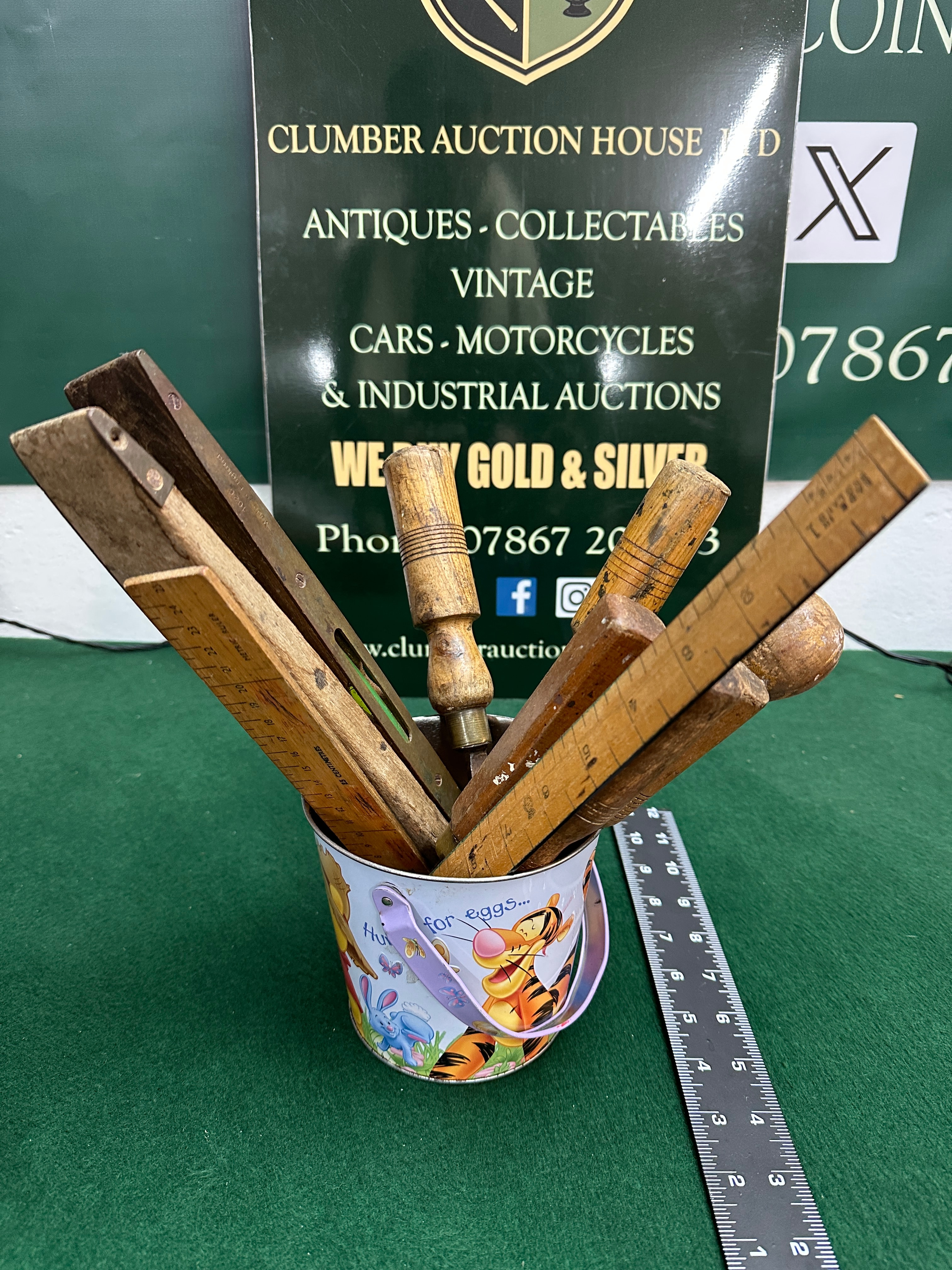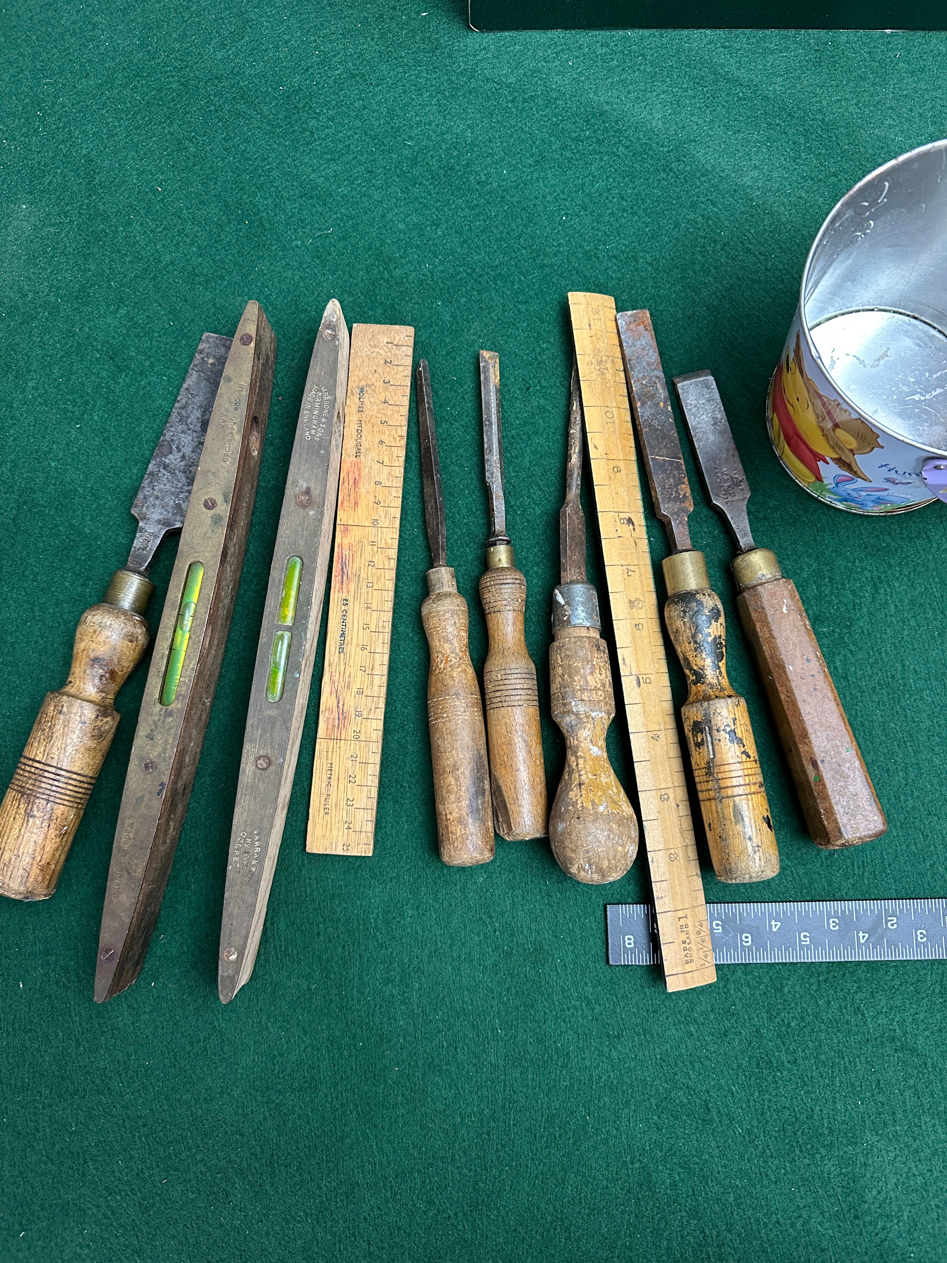 A collection primarily featuring vintage and antique Stanley folding rules and other woodworking and measuring instruments, crafted from wood, steel, and brass. The assortment comprises various wooden rulers, including folding rules, with visible markings such as “MADE IN ENGLAND” and “STANLEY”. Also present are two wooden spirit levels, one marked “PATENT PENDING”, and several chisels or gouges with wooden handles and steel blades. A single modern-style metal ruler is included. These items are presented within a vintage tin bucket adorned with colorful cartoon characters, notably Winnie the Pooh and friends, and the English text “Hit for eggs…”.