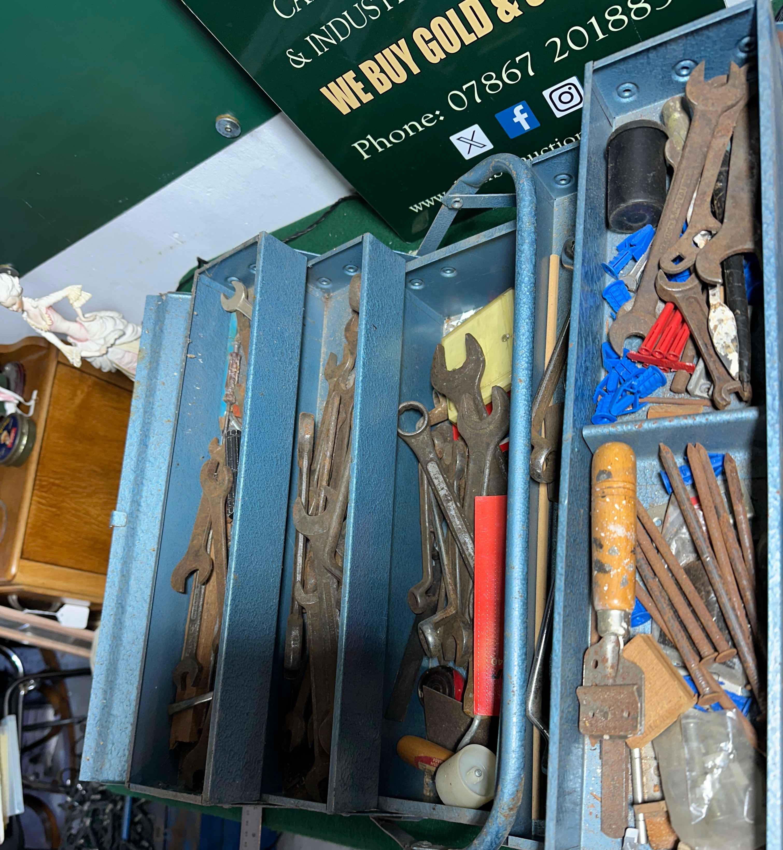 A vintage blue-painted metal cantilever toolbox, presented open and filled with a collection of assorted hand tools. The tools, predominantly made of steel or iron, include numerous open-ended and adjustable wrenches, screwdrivers with wood or plastic handles, files, and various small components. Visible text includes “Black & Decker” and “strimmer trimmer A9040” on a red packaged item within the box.