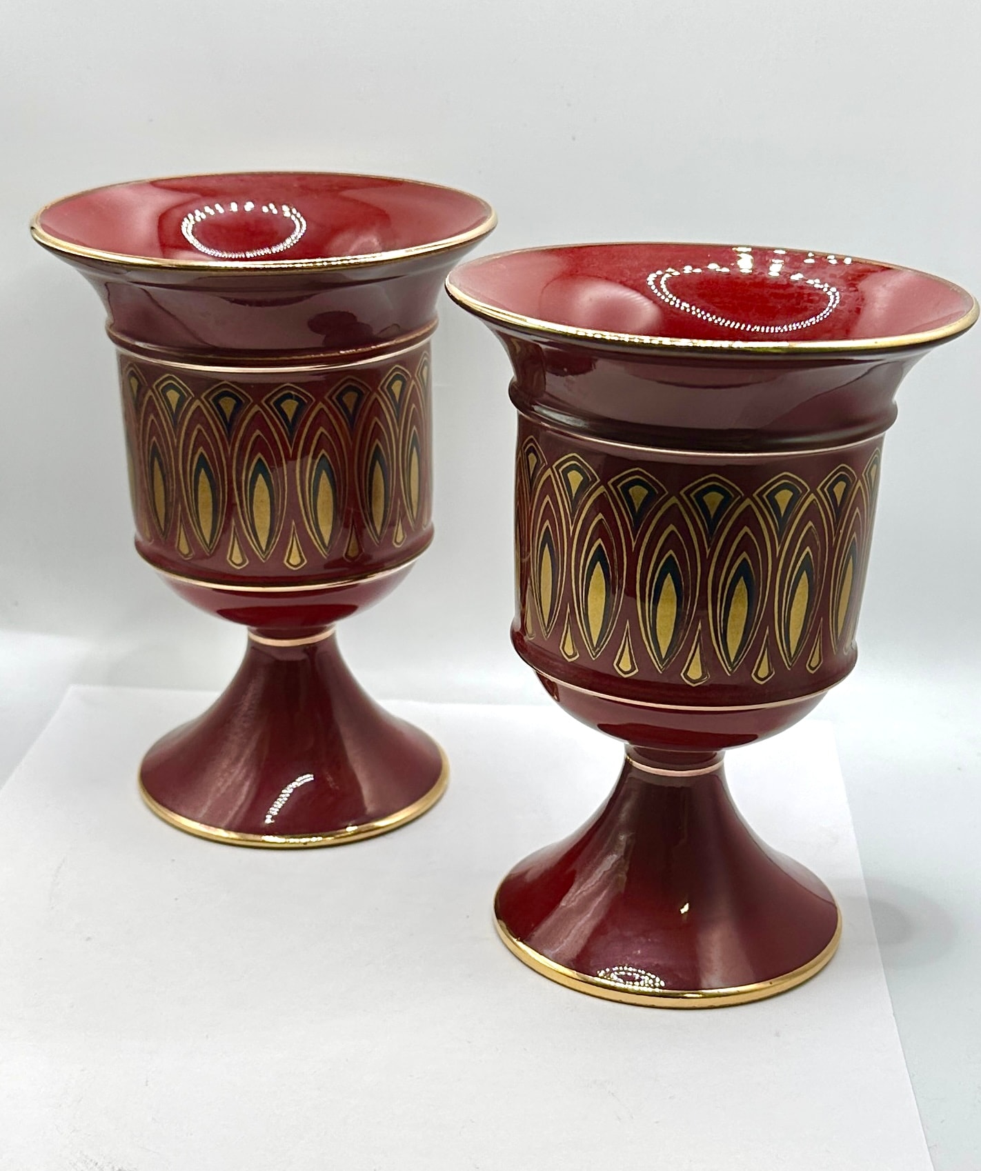 A pair of glazed earthenware urns by Il Verrocchio, Florence, Italy. Crafted from glazed earthenware with an unglazed terracotta-colored rim visible on the base. They feature a high-gloss maroon glaze, accented with extensive gold banding on the flared rim, collar, and foot. The main body is adorned with an ornate Art Deco-inspired geometric pattern in gold and black. The underside of one piece is marked ‘IL VERROCCHIO’ and ‘florence -italy’ with a stylized ‘M’ logo.