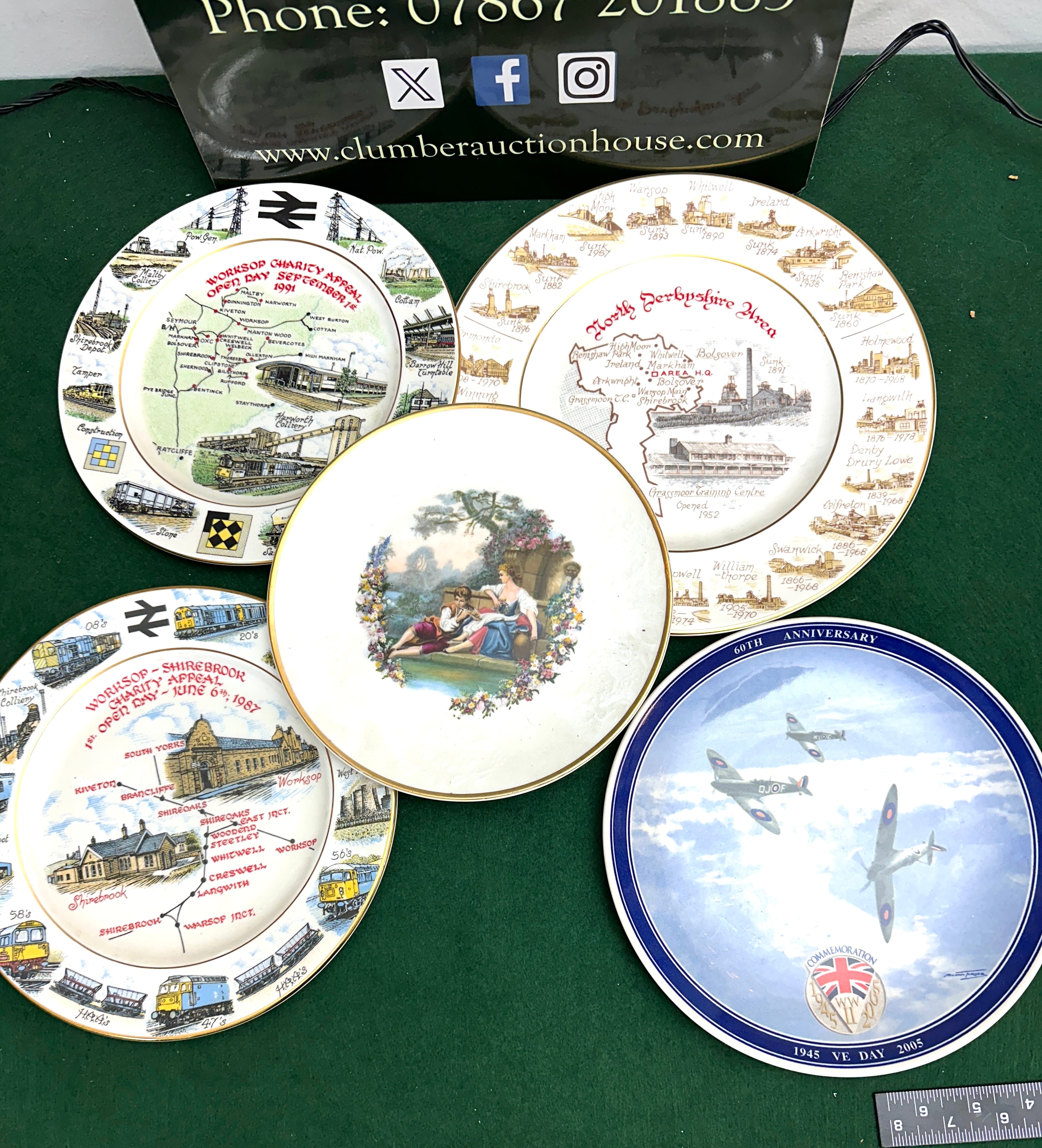 A collection of five circular decorative plates, primarily crafted from ceramic or porcelain. One plate, identified through research as a ‘North Derbyshire Area Mining Plate’, depicts various collieries and coalfields with ‘Sunk’ dates, finished with a gold-tone rim. Two further plates, also with gold-tone rims, commemorate specific British railway networks and industrial areas: one is inscribed “WORKSOP CHARITY APPEAL OPEN DAY SEPTEMBER 2nd 1991”, and the other reads “WORKSOP – SHIREBROOK CHARITY APPEAL 1st. OPEN DAY – JUNE 6th; 1987”. Both of these railway-themed plates frequently include the British Rail double arrow logo alongside trains, stations, and industrial buildings. A fourth plate, also with a gold-tone rim, displays a classical or romantic genre scene of a man playing a flute to a woman by a water feature, framed by a colorful floral border. The fifth plate has a patriotic theme, marked “60th ANNIVERSARY” and “1945 VE DAY 2005”, showcasing three Supermarine Spitfire aircraft in flight and a central “COMMEMORATION WW II” motif featuring a Union Jack, all within a blue and white border.
