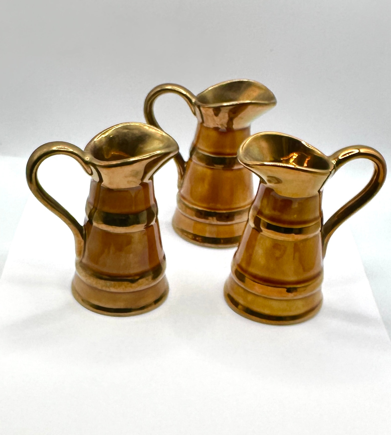 A set of three ceramic creamer pitchers by Lord Nelson Pottery, England. Each pitcher features a glossy dark brown body with a distinctive metallic gold-tone glaze on the upper rim, spout, and handle. The style is utilitarian with a slightly flared base. The underside of one pitcher is clearly marked “LORD NELSON POTTERY ENGLAND,” accompanied by a stylized “N” logo incorporating a crown, and the date “7-74,” indicating a production date of July 1974.
