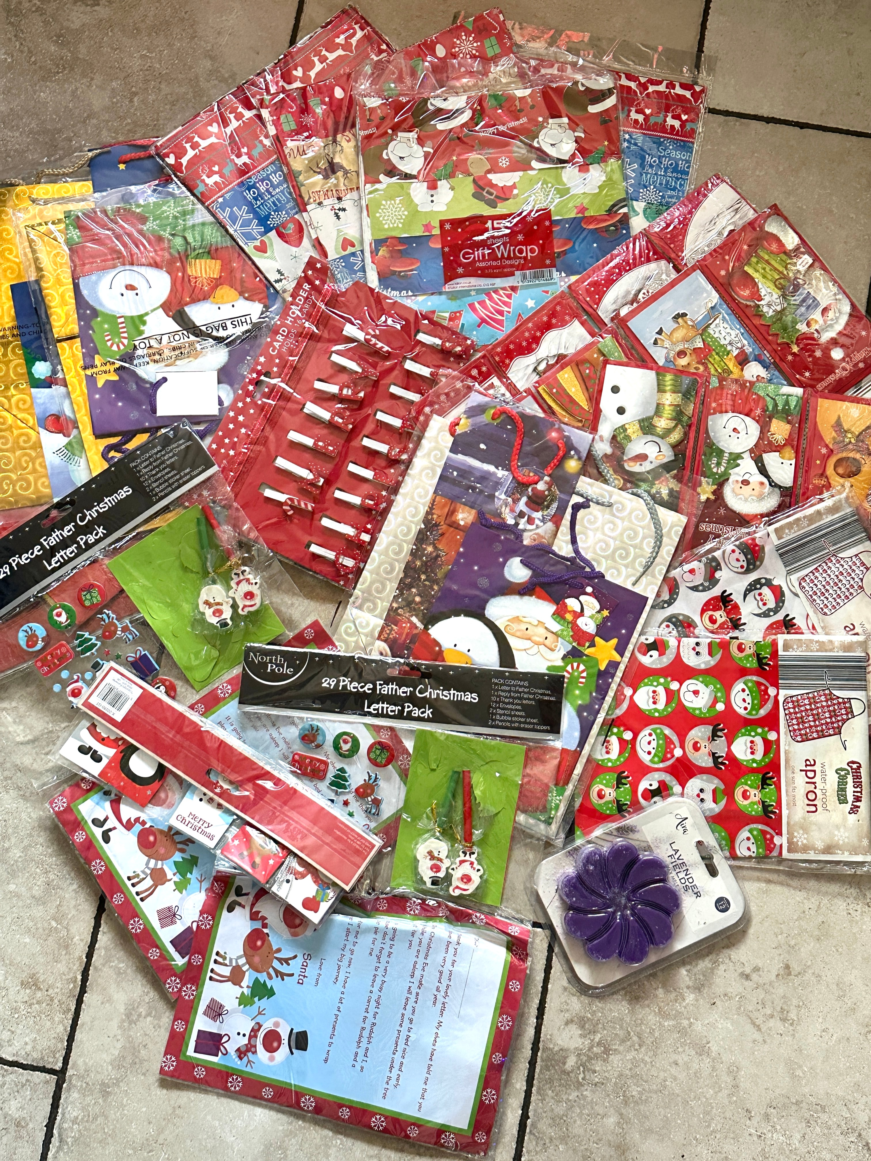 This lot comprises a diverse collection of new, unused Christmas-themed merchandise, primarily composed of paper and plastic. The items feature a modern, festive style with cartoonish depictions of Santa Claus, snowmen, reindeer, and snowflakes, rendered in traditional holiday colors of red, green, and blue. Included are multiple packs of gift wrap, one specified as containing 15 sheets with assorted designs, a collection of various gift bags, Christmas cards, decorative clips, stickers, and small hanging ornaments. Also present are two “29 Piece Father Christmas Letter Pack” sets, each containing a “Letter to Father Christmas,” a “Reply from Father Christmas” (which includes text such as “Thank you for your lovely letter… Love from Santa”), thank you letters, envelopes, stencil sheets, bubble sticker sheets, and pencils with eraser toppers. Further items include a “Christmas Corner water-proof apron” and a purple, flower-shaped item labeled “LAVENDER MELT.”