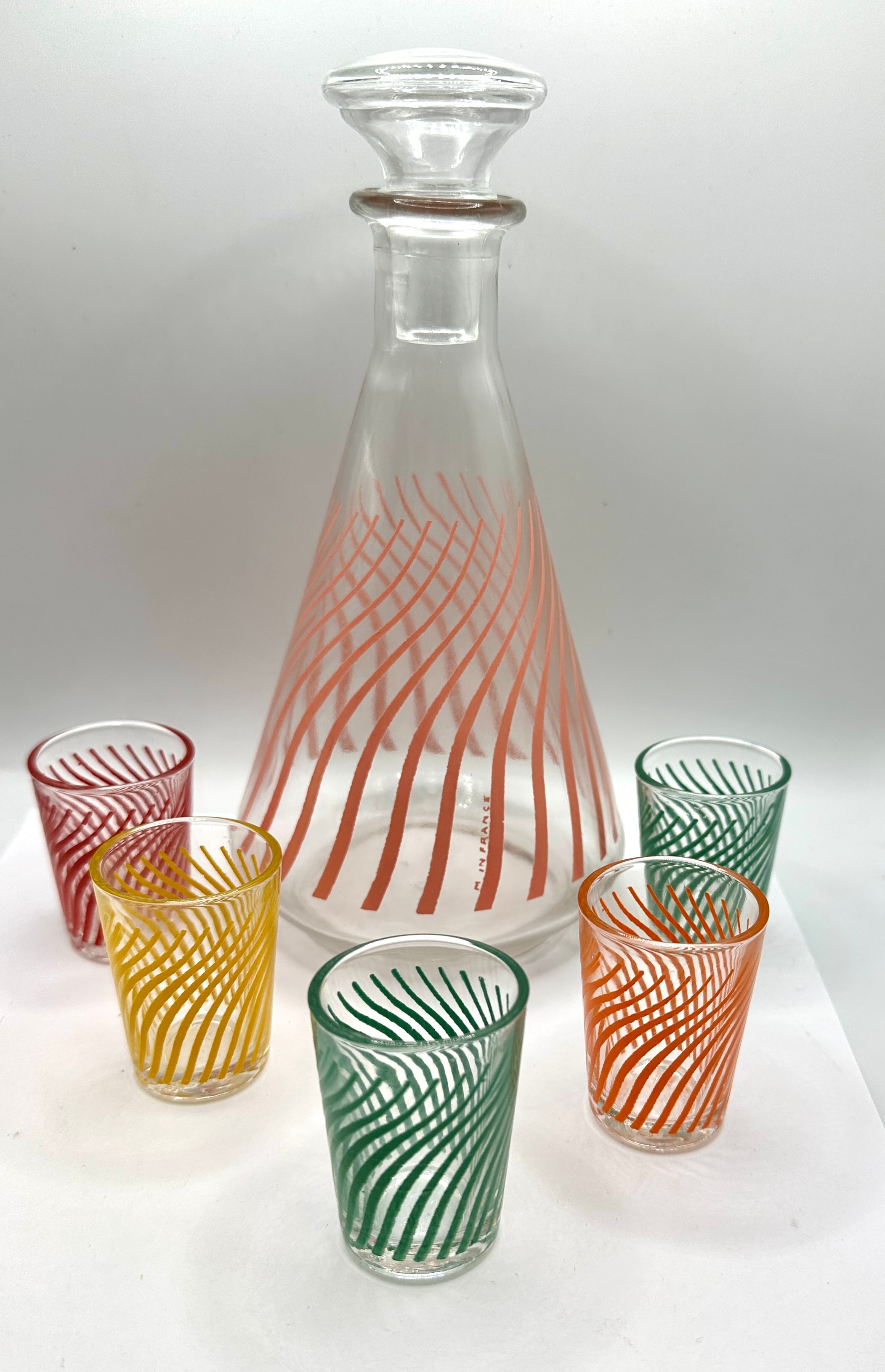 A Mid-Century Modern French glass decanter set, comprising a decanter with stopper and six coordinating glasses. The clear glass decanter features a flaring base tapering to a slender neck, adorned with a coral-pink, swirling linear pattern. The base of the decanter is marked ‘IN FRANCE’. The six small glasses, in shades of red, yellow, green, and orange, mimic this swirling linear design. The bottom of one glass is molded with ‘FRANCE’ and what appears to be ‘CG’ or ’80’.