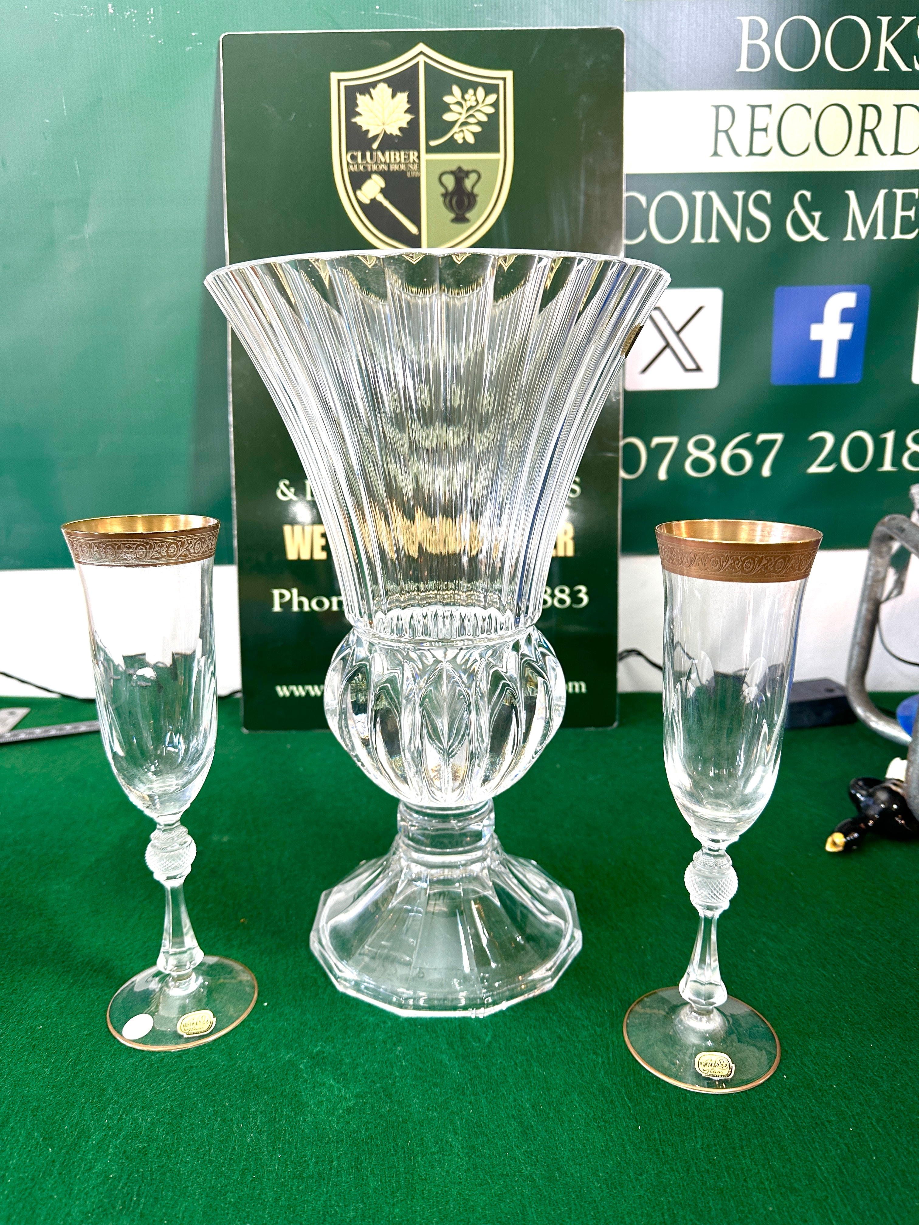 A three-piece Bohemia Glass cut crystal and gilt set, made in Slovakia, comprising one large centerpiece vase and two matching stemmed glasses. The vase features a flared, ribbed neck, a deeply cut globular body, and a faceted octagonal base. The two accompanying stemmed glasses have plain bowls, faceted spherical knops on their stems, and circular bases, each finished with a gilt band showcasing an intricate scrollwork pattern around the rim. Small, gold-rimmed oval stickers on the base of the stemmed glasses bear the text ‘BOHEMIA Glass’ and ‘Made in Slovakia’.