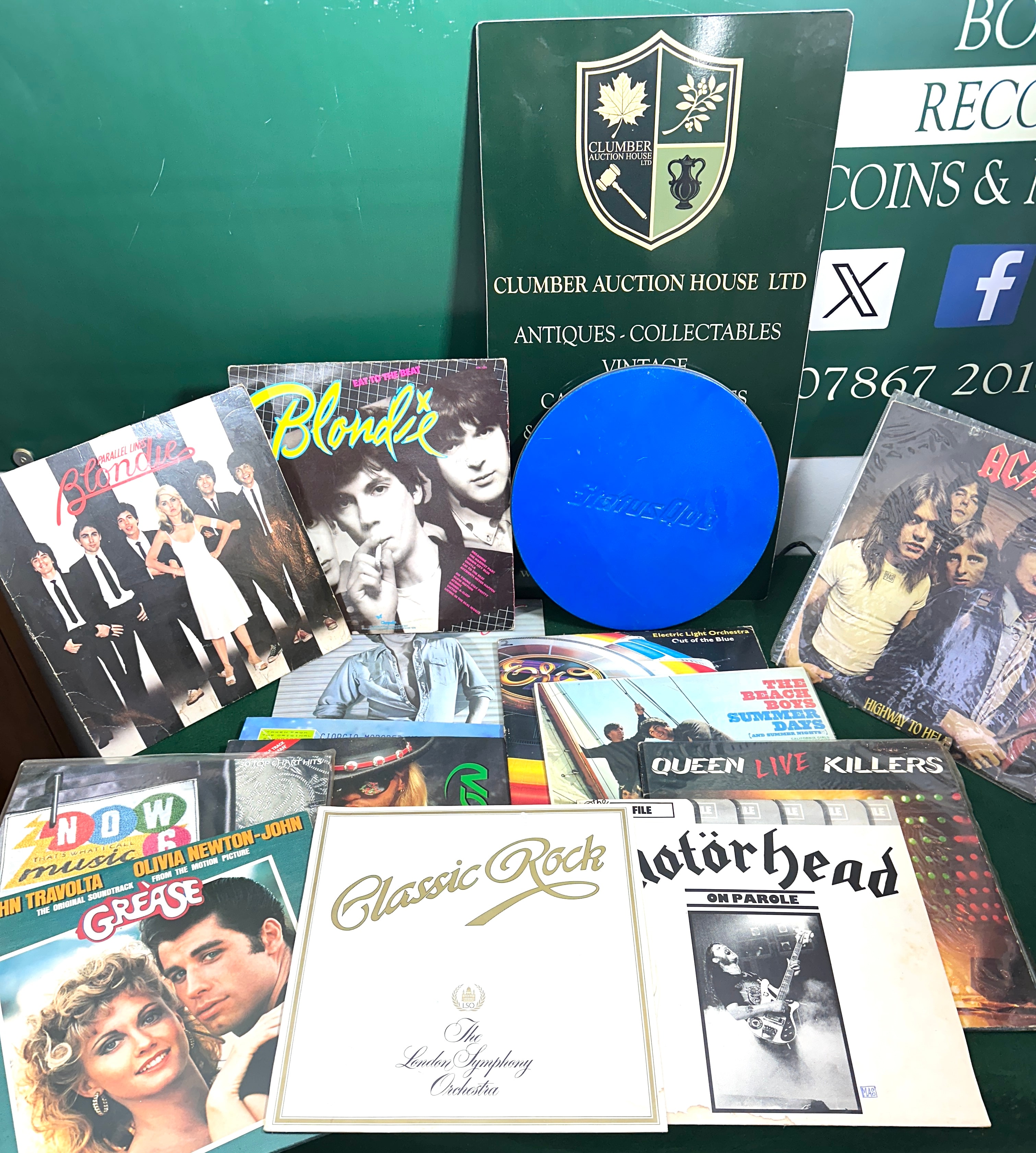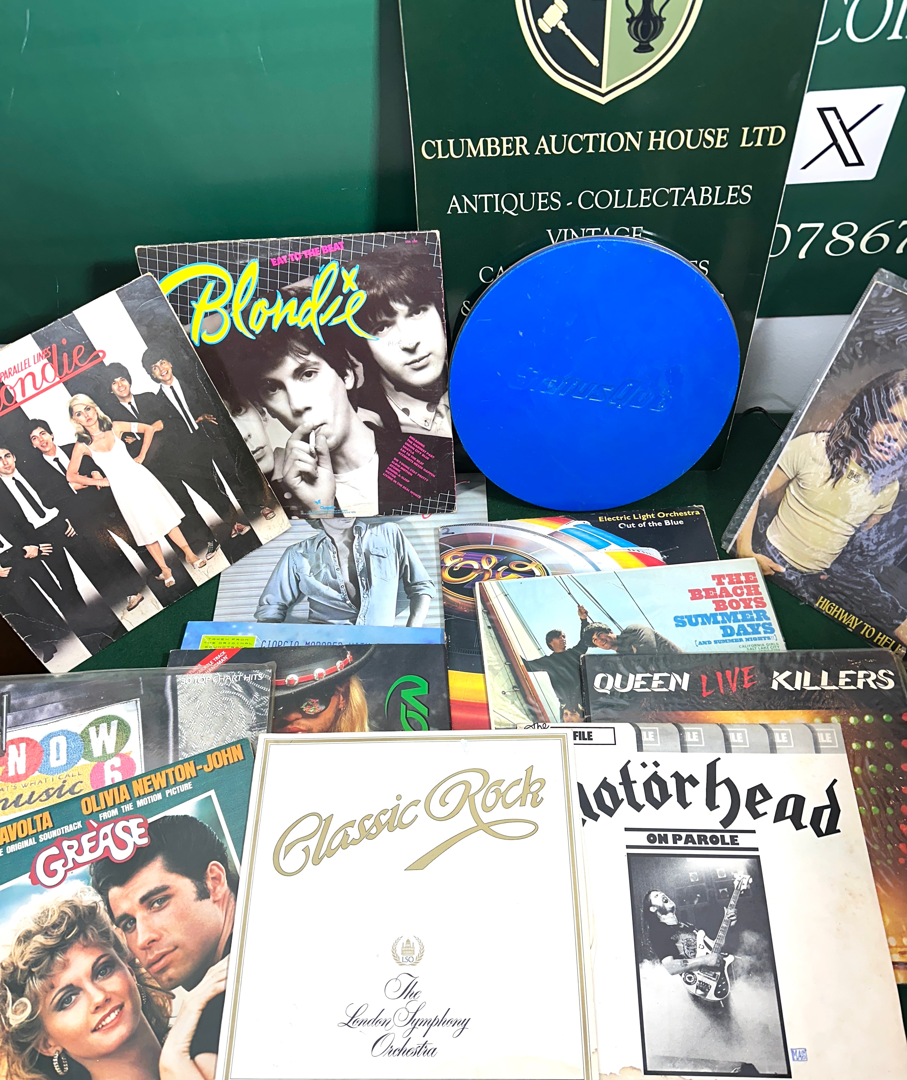 A collection of approximately 15-20 vintage vinyl record albums (LPs) from the late 1970s and early 1980s, primarily encompassing rock, pop, and classic rock genres. The collection includes notable titles such as Blondie (multiple covers), AC/DC’s ‘Highway to Hell,’ Queen’s ‘Live Killers,’ Motorhead’s ‘On Parole,’ the ‘Grease’ soundtrack, ‘NOW’ compilations, The Beach Boys’ ‘Summer Days,’ and Electric Light Orchestra’s ‘Out of the Blue.’ Also present is ‘Classic Rock’ by The London Symphony Orchestra, which aligns with web intelligence findings. A bright blue, solid circular plastic disc prominently marked ‘Electric Light Orchestra’ and ‘Out of the Blue’ is included.
