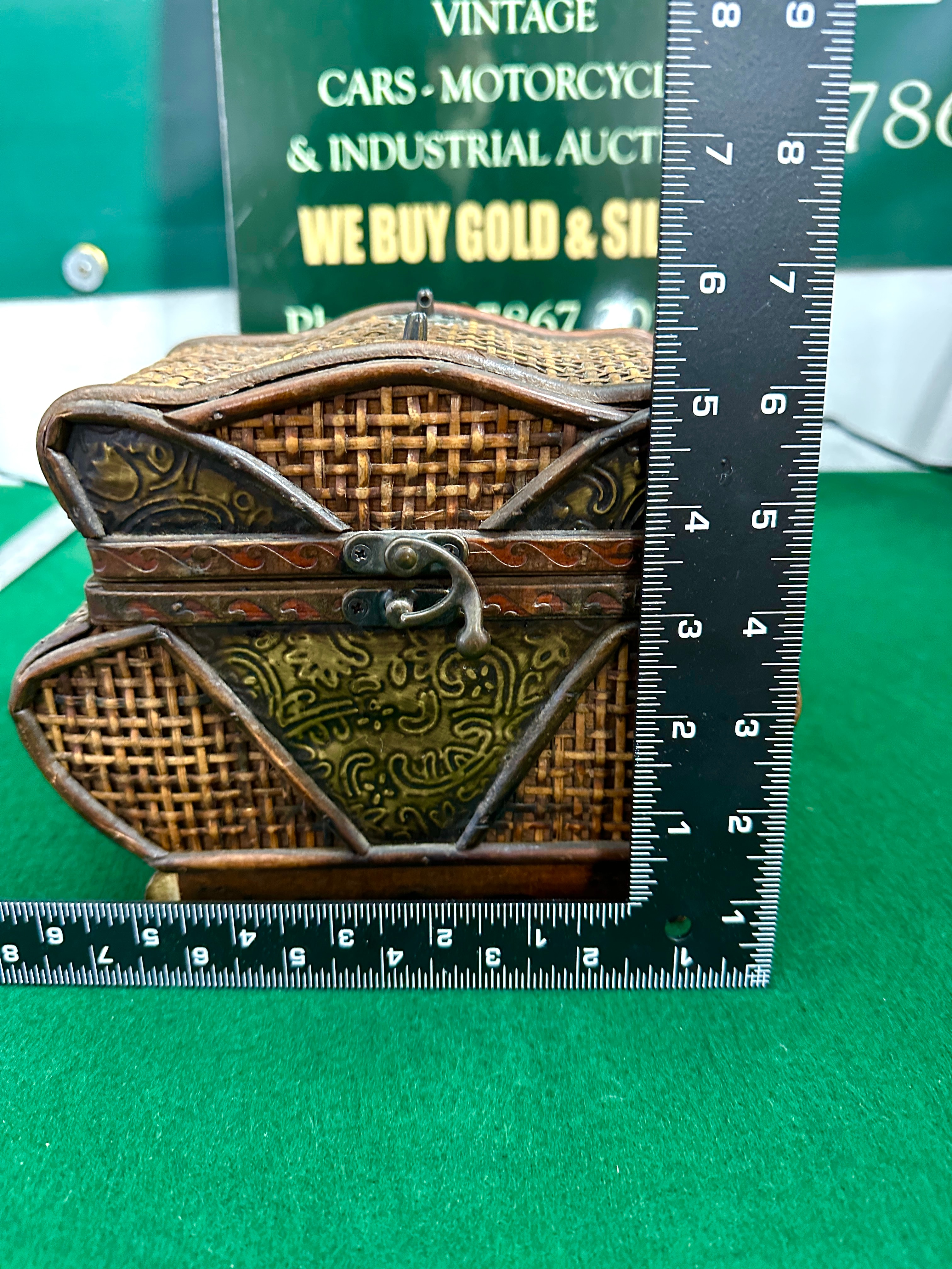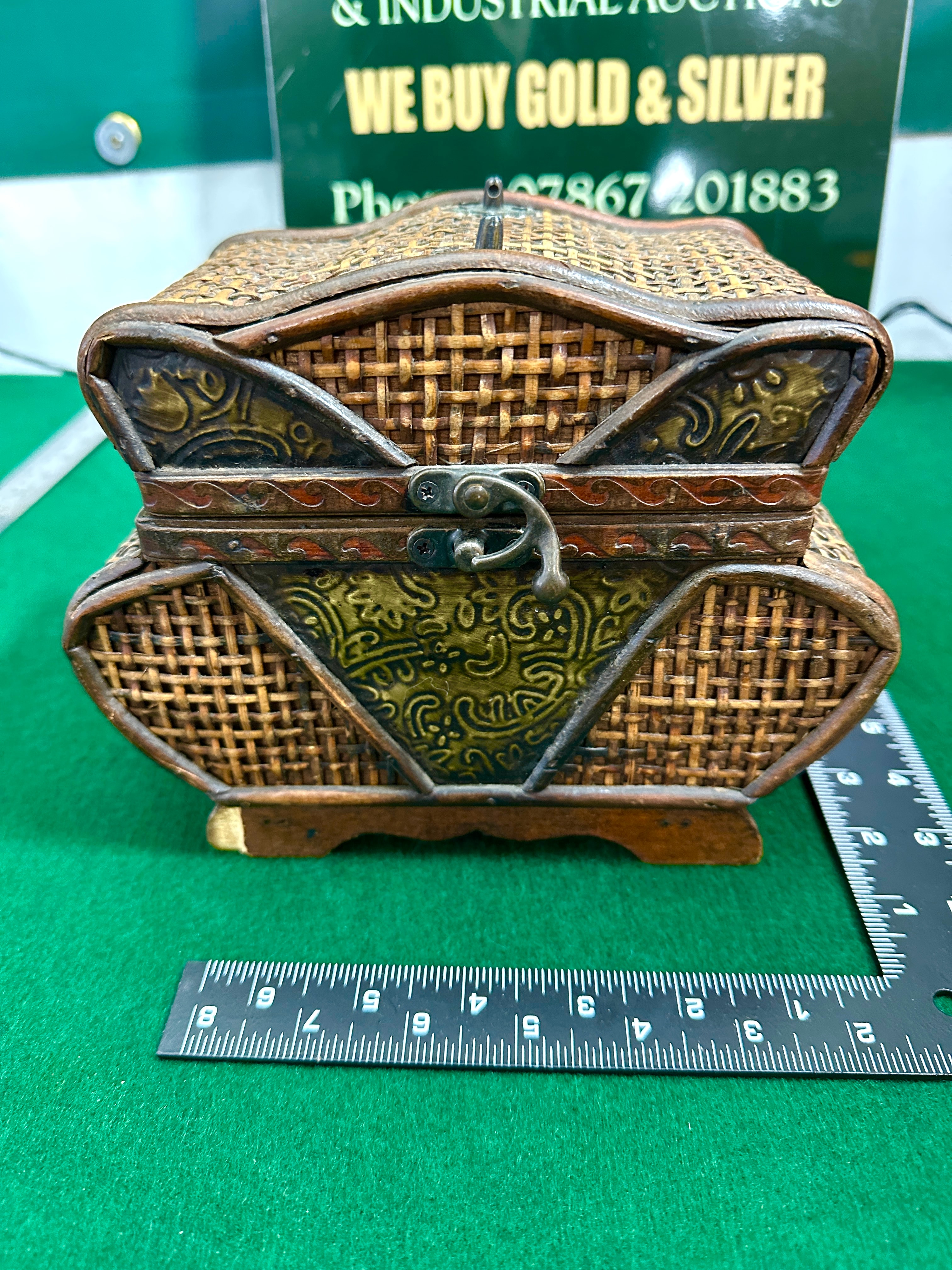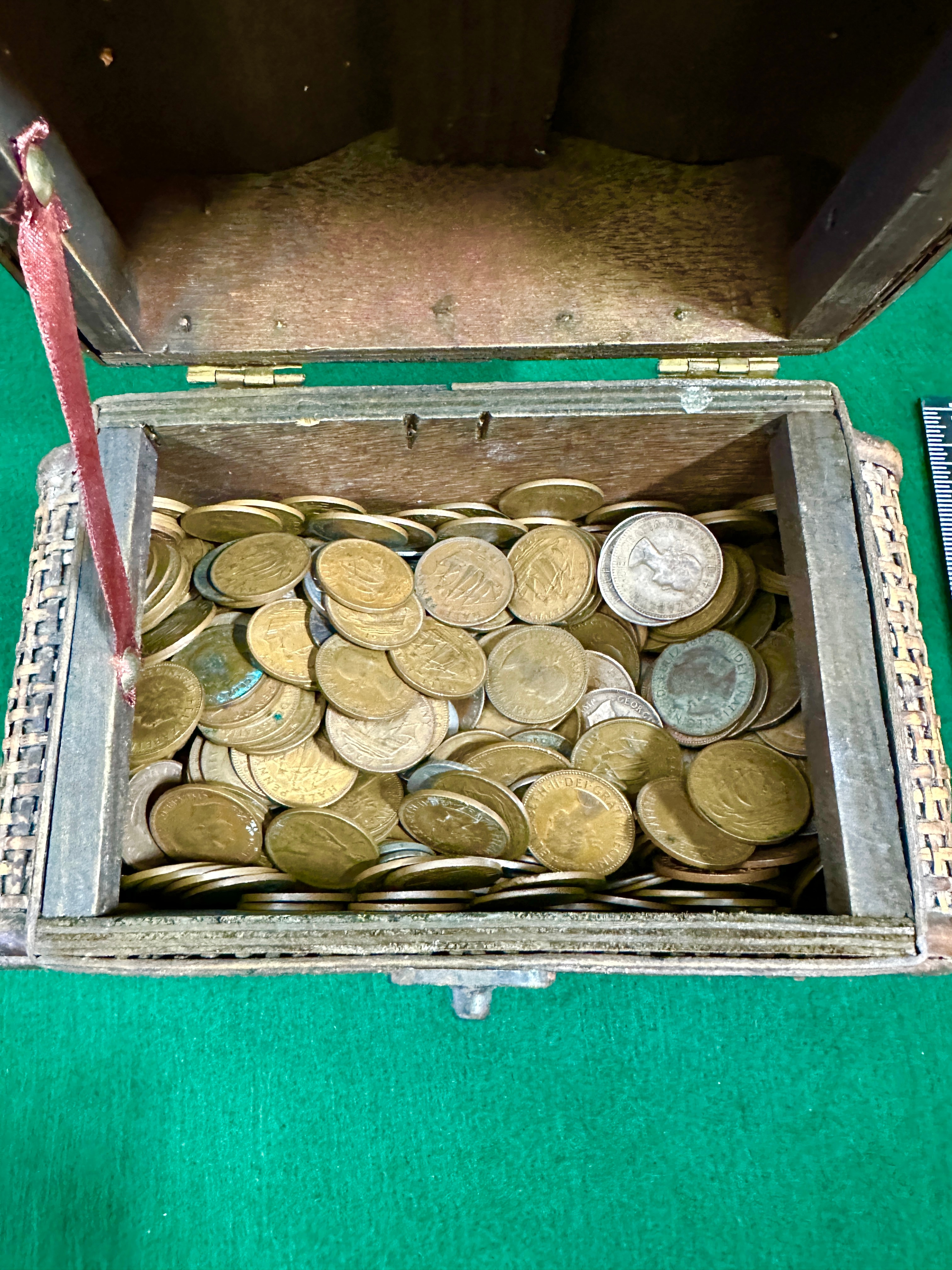 A small, decorative wooden chest featuring woven wicker and rattan panels on its exterior. The chest is designed with a hinged, slightly domed lid, secured by a dark metal clasp and complementary hinges. Internally, a reddish fabric ribbon is attached. The wooden structure is accented with dark, possibly painted or embossed, scrolling decorative elements on both the front and the lid. The interior contains a substantial quantity of circulated coins, predominantly brass or bronze-toned, with some silver-toned examples. No specific maker’s marks are visible on the chest.