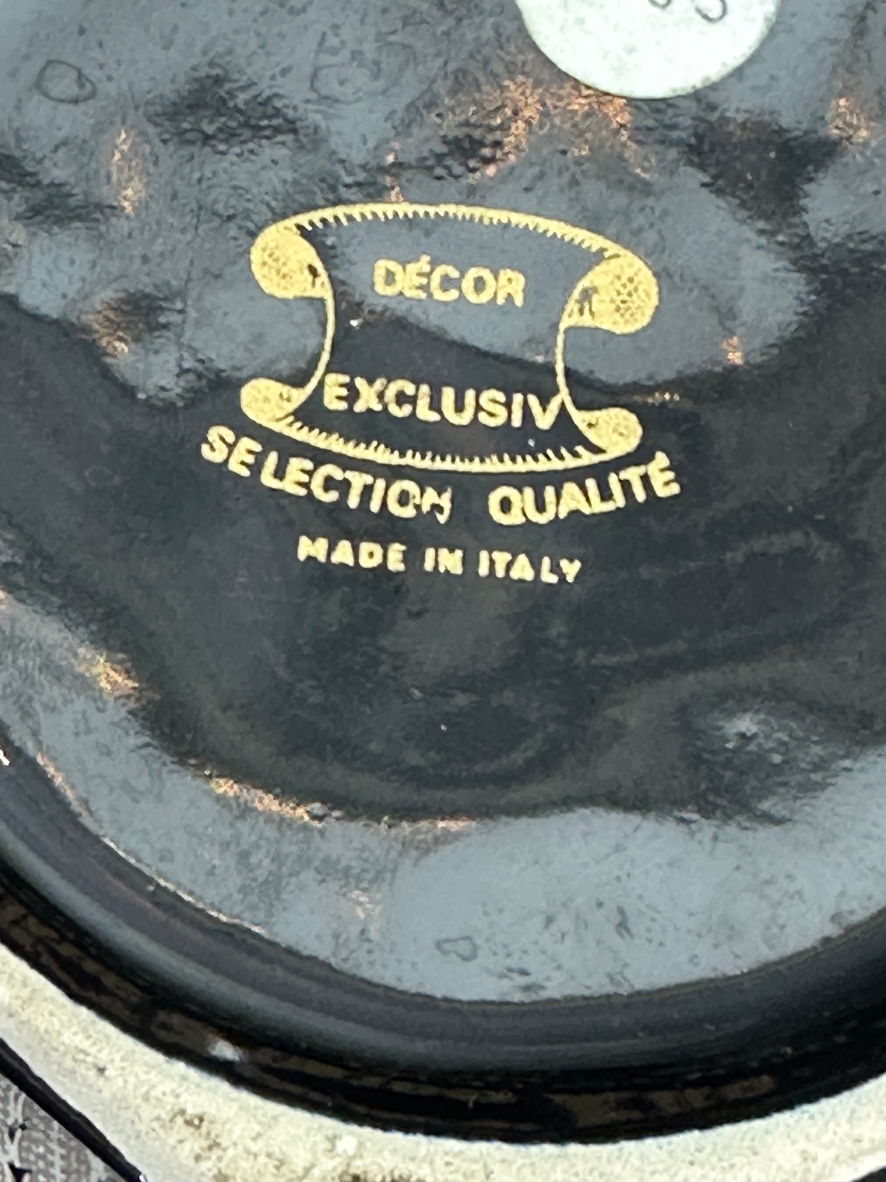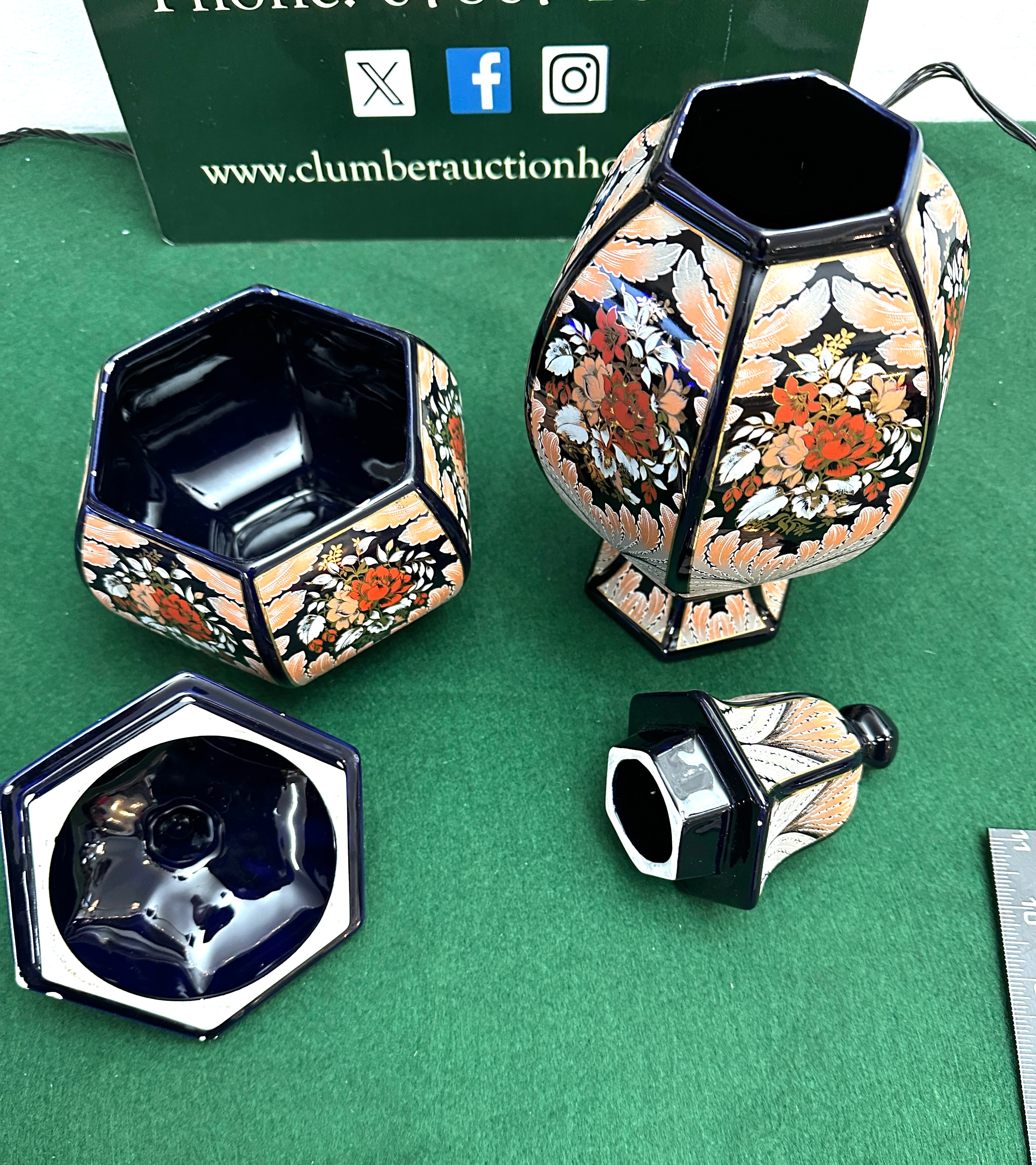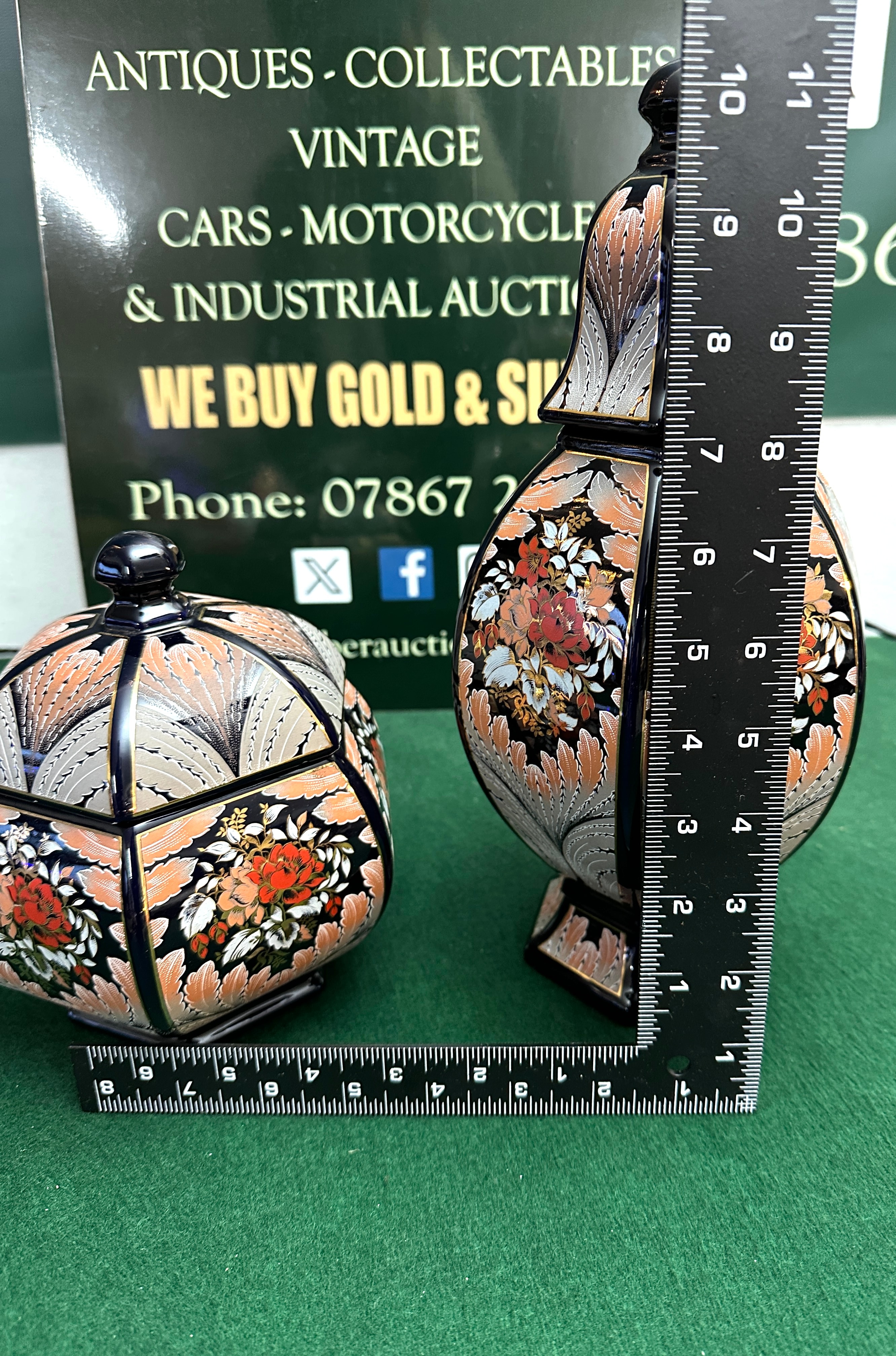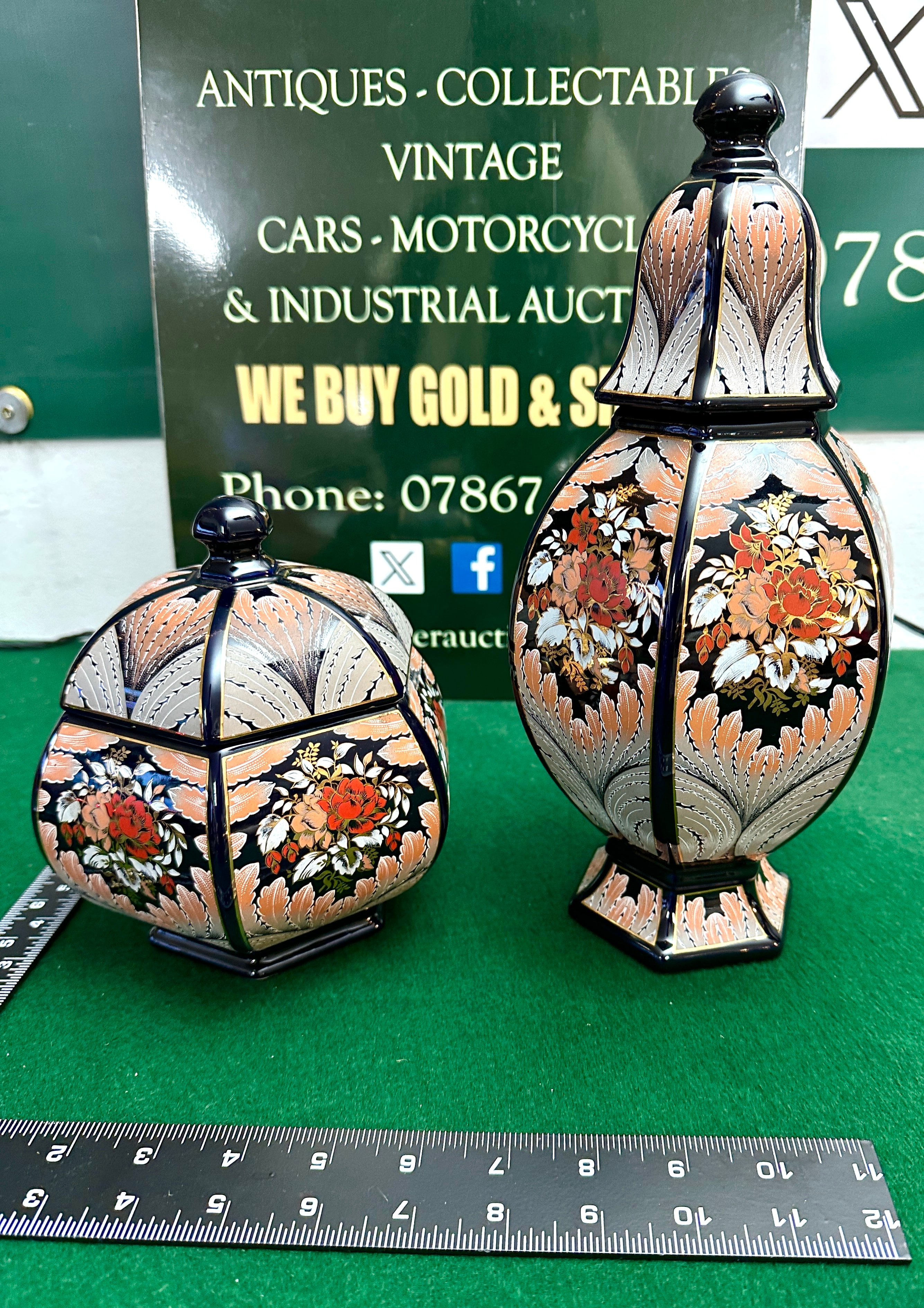 A pair of DÉCOR EXCLUSIVE Italian 1970s black glazed lidded ceramic objects, comprising a vase and a jar. Both pieces are of hexagonal-form and feature a dark, glossy, black or deep blue glazed ground adorned with vibrant, stylized floral motifs, predominantly in shades of orange, red, and gold, resembling peonies, interspersed with fan-like or feather-like patterns in lighter cream and peach tones. The interiors are a matching glossy dark blue/black. Each piece bears a gold-colored mark on the base reading “DÉCOR EXCLUSIVE SELECTION QUALITÉ MADE IN ITALY.”