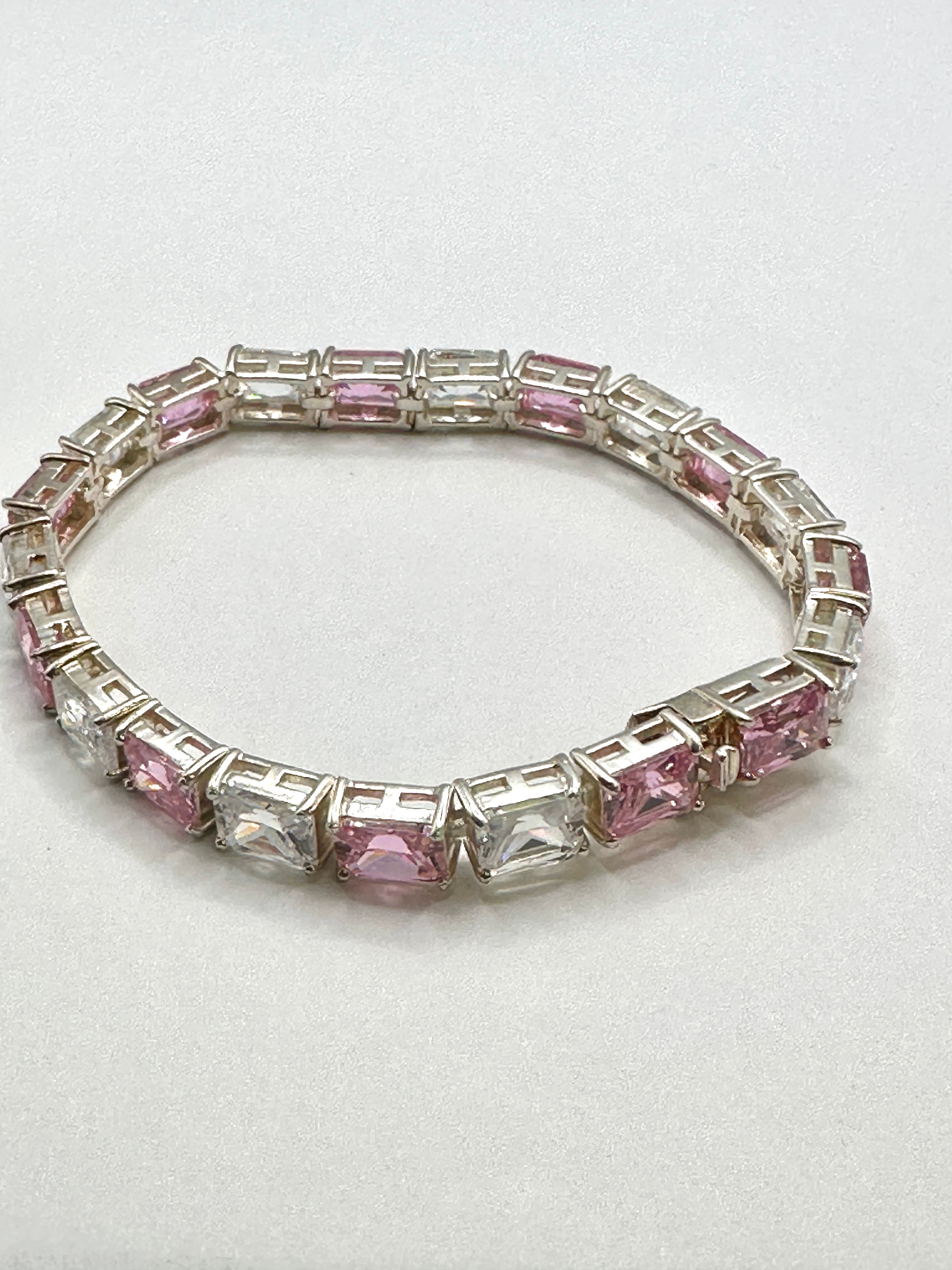 A 925 sterling silver tennis bracelet, featuring numerous individually set princess-cut cubic zirconia stones. The bracelet is crafted from a silver-toned metal, consistent with sterling silver. It features an alternating pattern of approximately 28-30 individually set, square/princess-cut faceted stones, with alternating colorless and pink hues. Each stone is secured in a four-prong setting, connected by hinged links to form a flexible chain. The bracelet is fastened by a visible box clasp with an integrated safety catch. No specific hallmarks, engravings, or manufacturer’s marks are discernible.