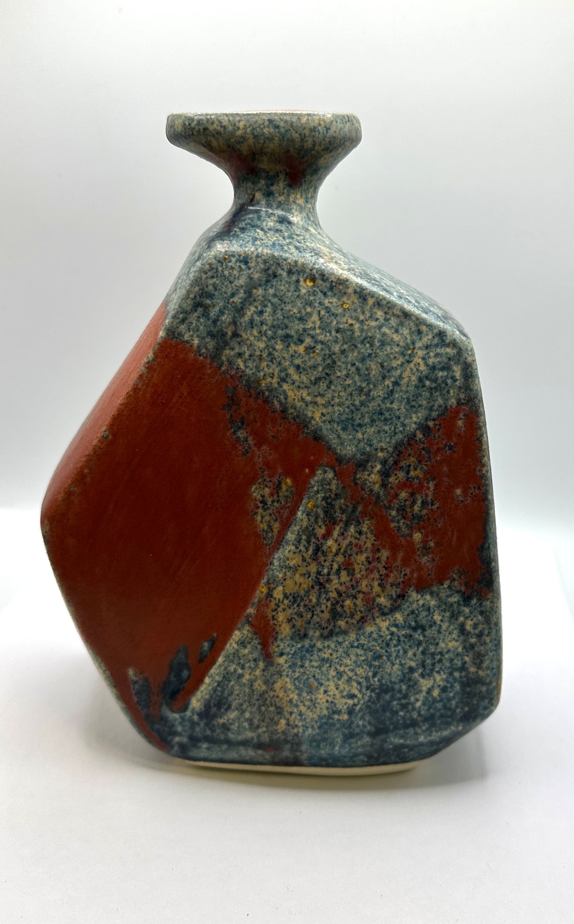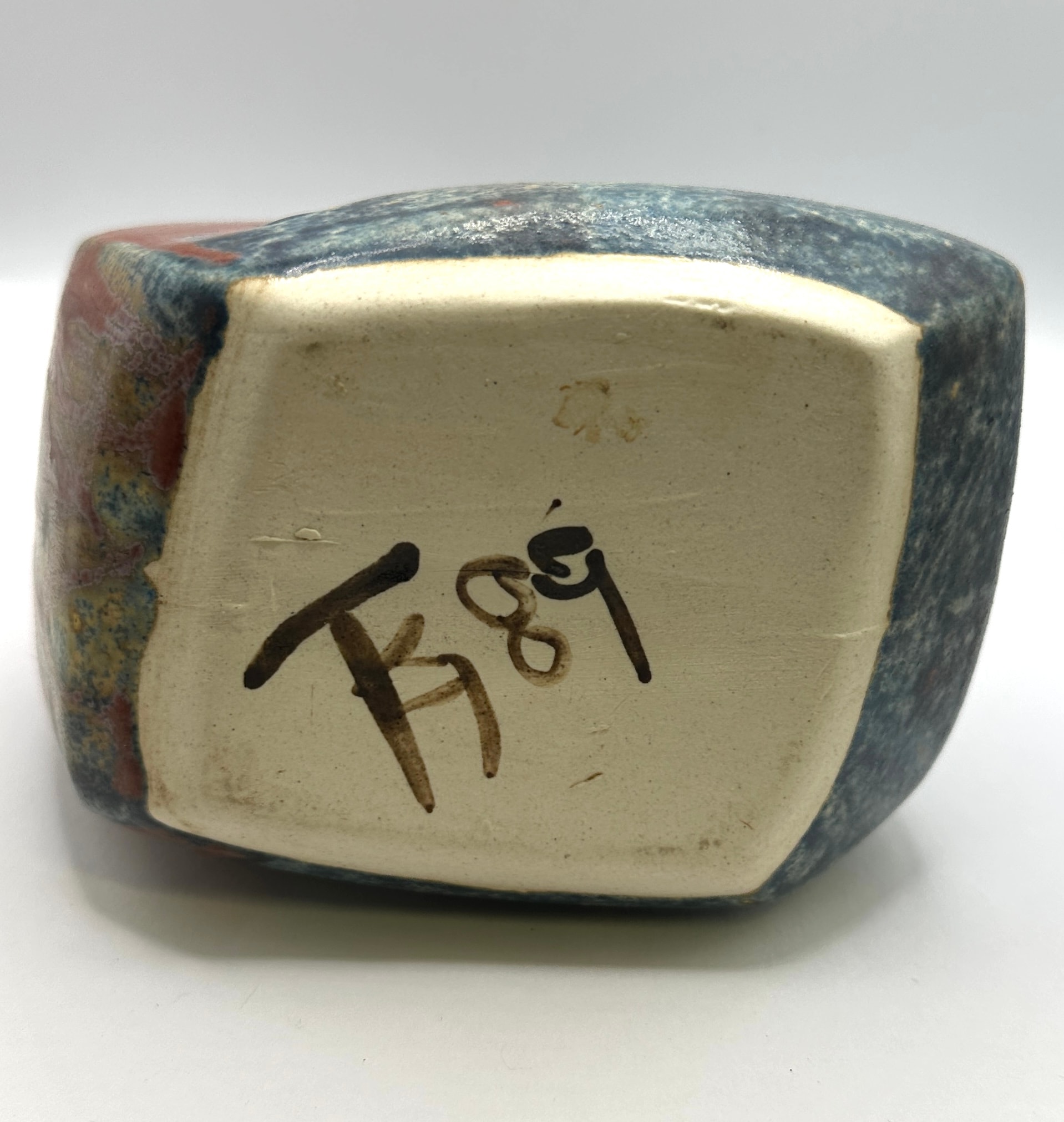 A ceramic vessel, likely a vase, featuring a distinctive geometric and faceted body that tapers to a narrow neck with a flared rim. The surface is primarily covered in a mottled or speckled blue-grey glaze, interrupted by large, irregular sections of an earthy reddish-brown glaze, giving it a modern or studio pottery aesthetic. The unglazed base displays a hand-painted dark marking, reading “F89”.