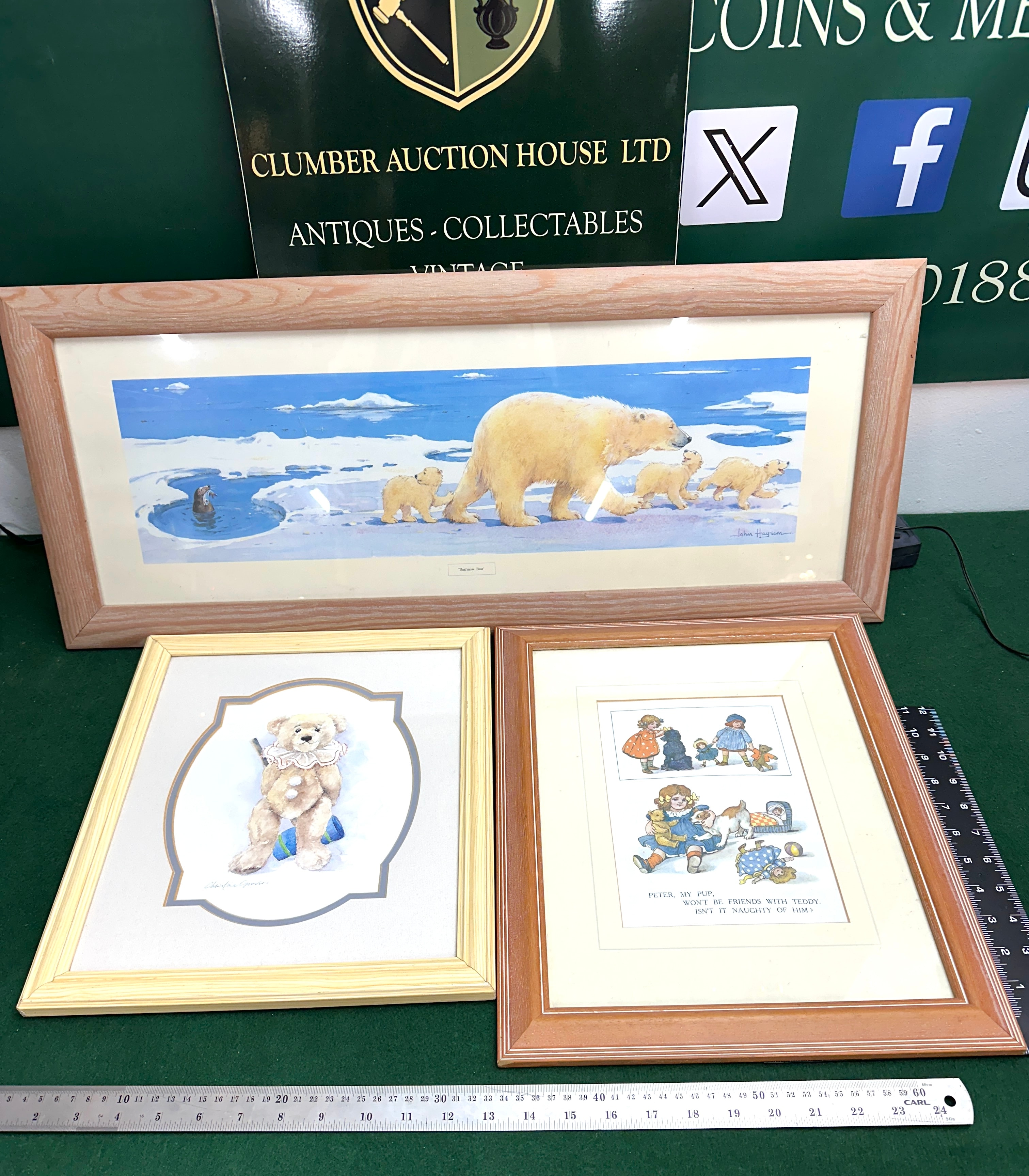 A group of three framed prints is offered. The largest, horizontally oriented print, identified through web intelligence as Fred Machetanz’s ‘Tender Arctic’, depicts a polar bear leading four cubs across an icy landscape with a seal in a water hole. The print is visibly signed ‘John Haysom’ and titled ‘The Snow Bear’ below the image, and is housed in a light-toned wooden frame. Below it, to the left, is a smaller, squarish framed print featuring a teddy bear wearing a ruffled collar and holding a stick, matted in light grey with a gold accent line, within a light natural wood frame. To the right, a vertically oriented framed print presents four charming vignettes of children playing with animals and dolls, accompanied by the text: “PETER, MY PUP, WON’T BE FRIENDS WITH TEDDY. ISN’T IT NAUGHTY OF HIM?”. This print is presented with a double mat within a reddish-brown wooden frame.