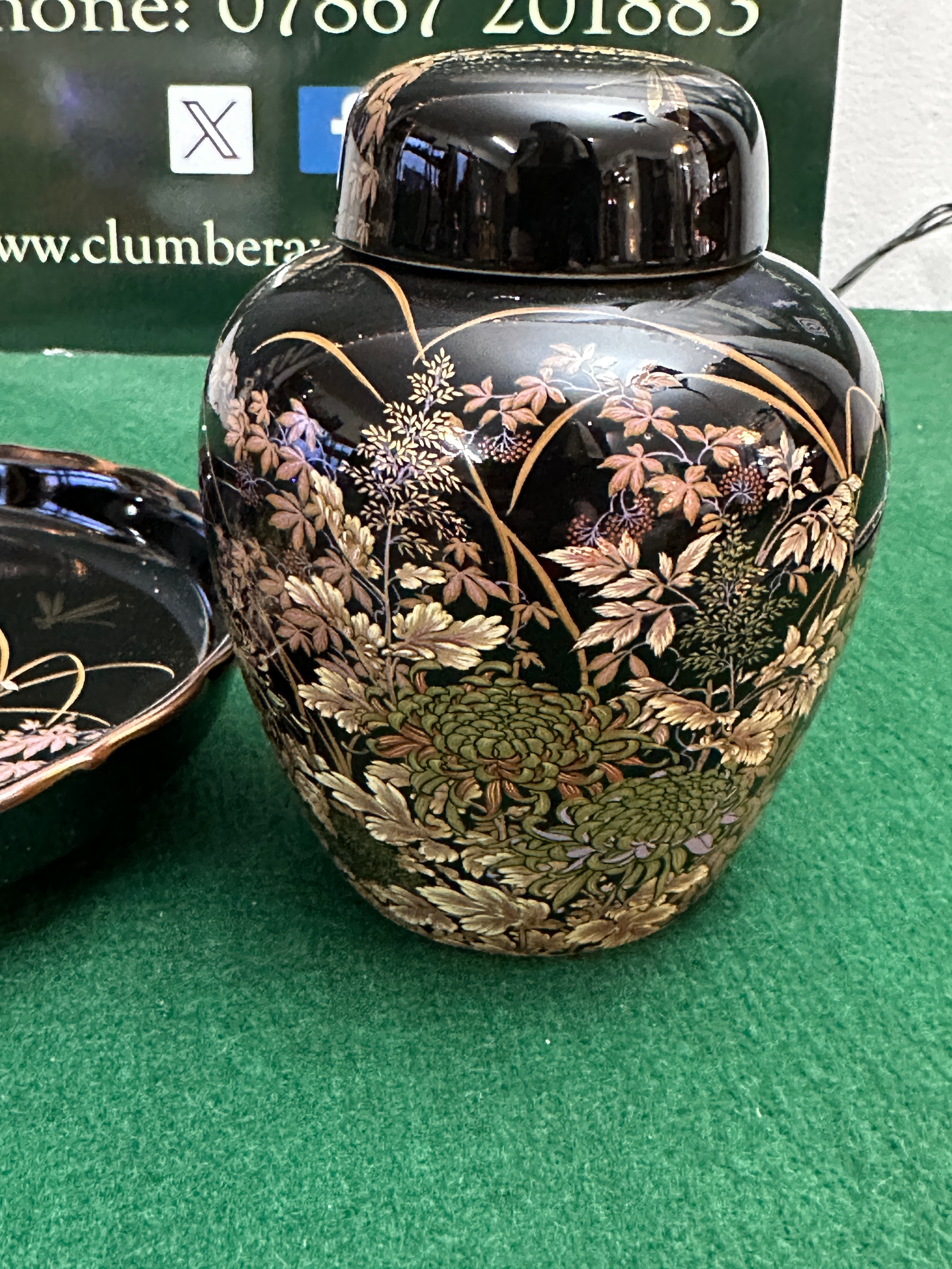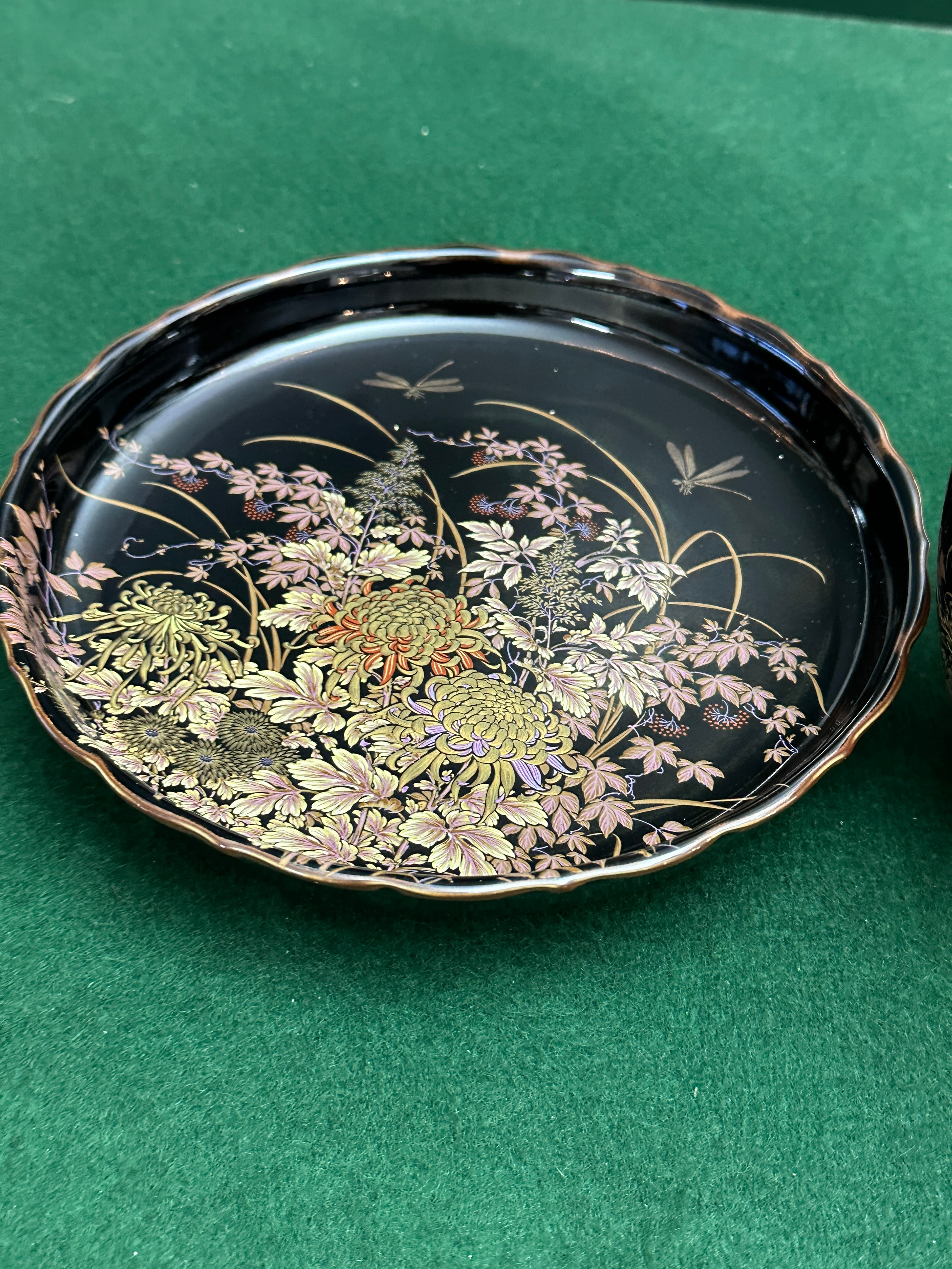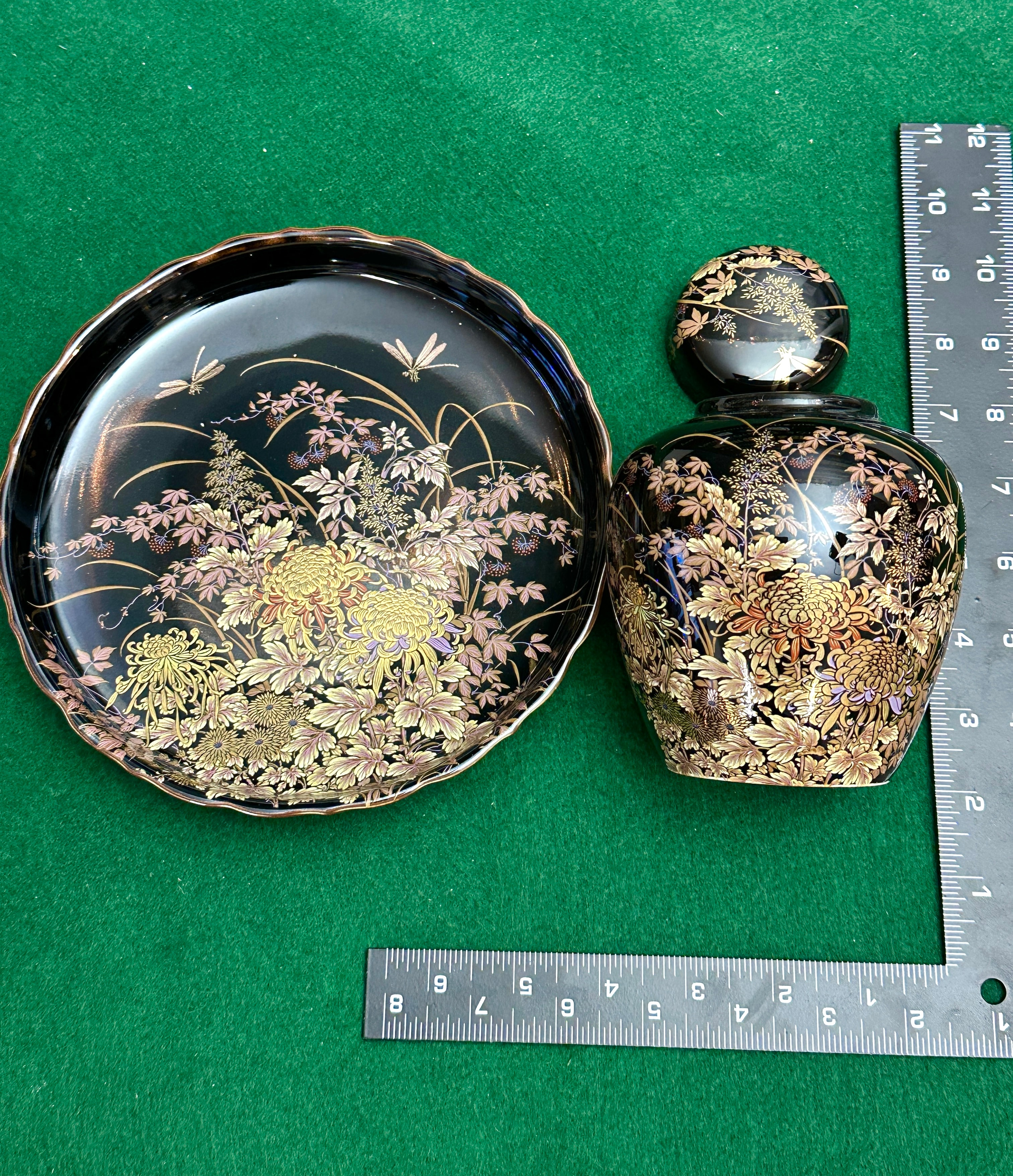 A pair of Shibata Tenmoku-Kiku Japanese black and gold porcelain items, comprising a lidded jar and a matching shallow, round dish. Both pieces are adorned with a lustrous black ground, intricately decorated in a multi-color palette of gold, bronze, pink, and green. The design depicts dense fields of chrysanthemums, various foliage, and slender reeds, with dragonflies visible on both the dish and the jar’s lid. The decorative style is consistent with traditional East Asian arts.