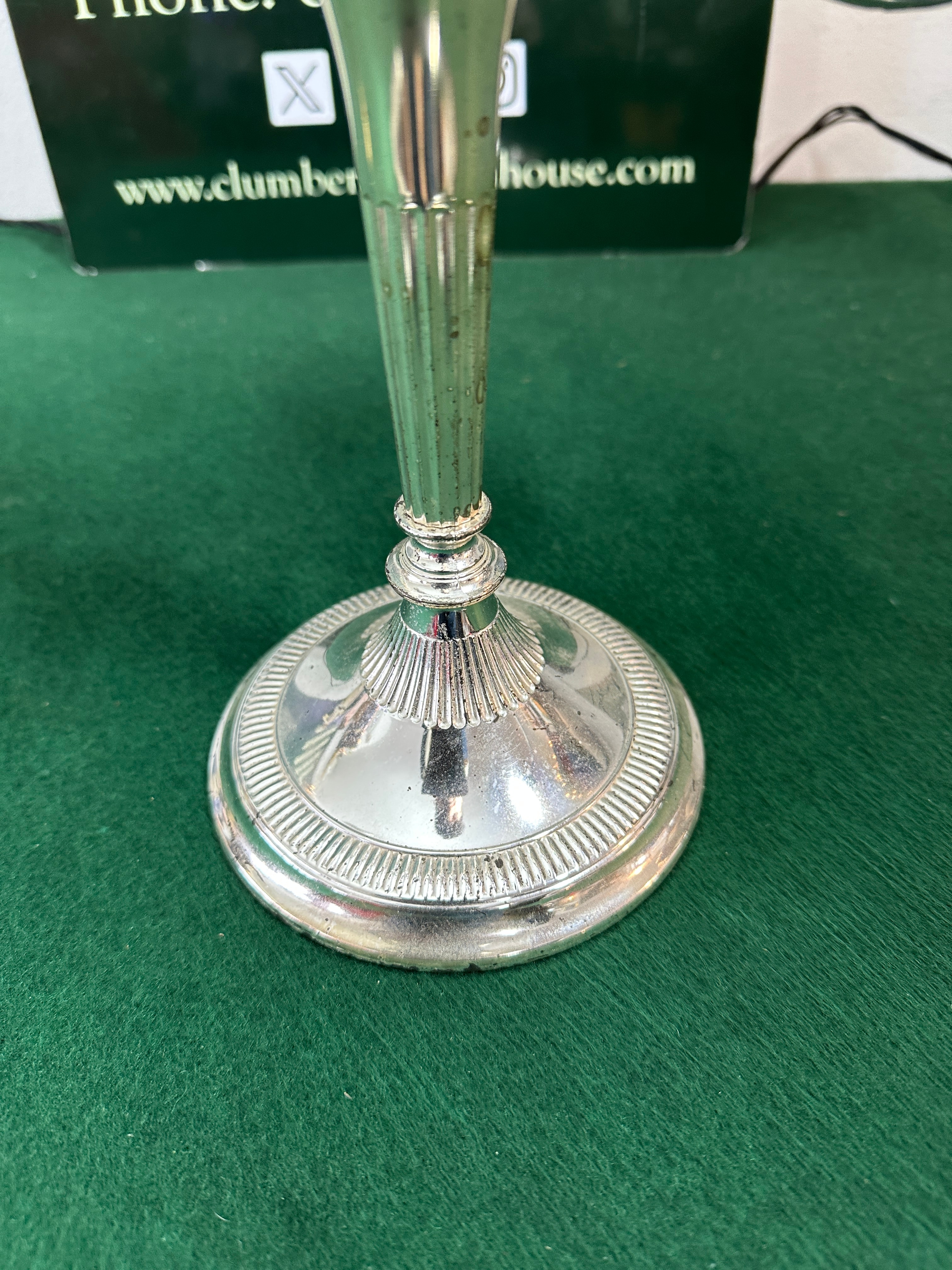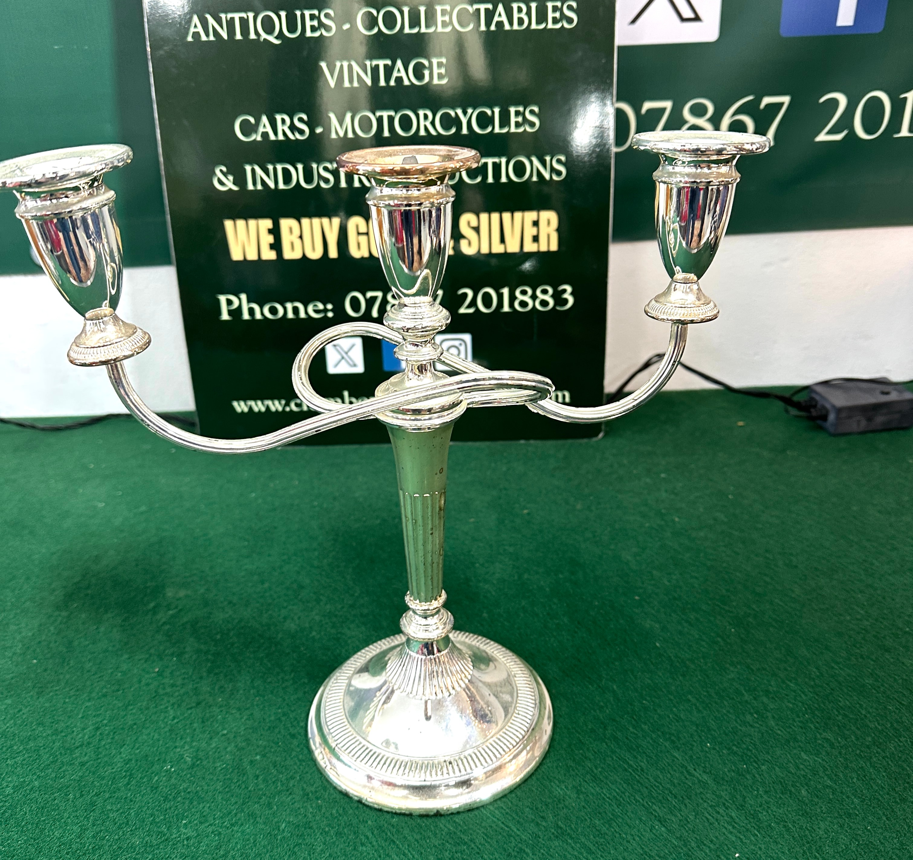 A three-light candelabrum crafted from a silver-colored metal, likely silver-plated, in a traditional or Neo-classical Revival design. It features a central fluted column rising from a circular, reeded pedestal base, supporting two curved arms and a central upright. Each arm and the central upright are topped with a candle holder and bobeche. A decorative looped element connects the arms just above the central shaft. The object shows no visible text or manufacturer’s markings on its surface.