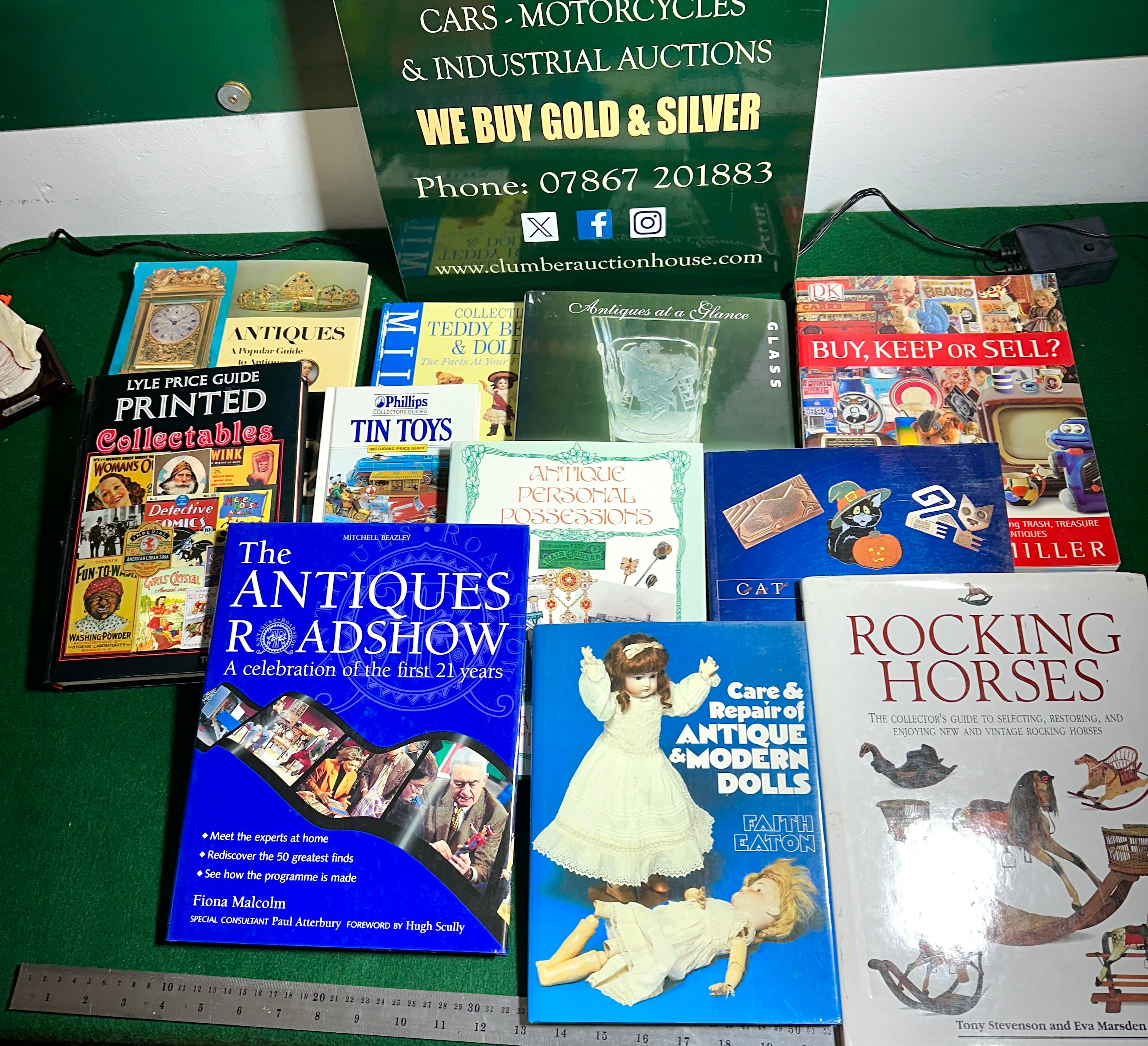 A collection of approximately twelve reference books focused on antiques and collectibles, including ‘The Antiques Roadshow: A Celebration of the First 21 Years’, ‘Lyle Price Guide Printed Collectables’, ‘Phillips Collectors Guides Tin Toys’, ‘Care & Repair of Antique & Modern Dolls’, and ‘Rocking Horses’. The books are mostly hardcovers. Also present is a large green ‘Clumber Auction House’ sign, detailing services such as ‘Cars, Motorcycles & Industrial Auctions’ and ‘We Buy Gold & Silver’, along with contact information (Phone: 07867 201883, Website: www.clumberauctionhouse.com). Accompanying these items are a black power adapter with associated wiring and a metal ruler. All visible text is in English.