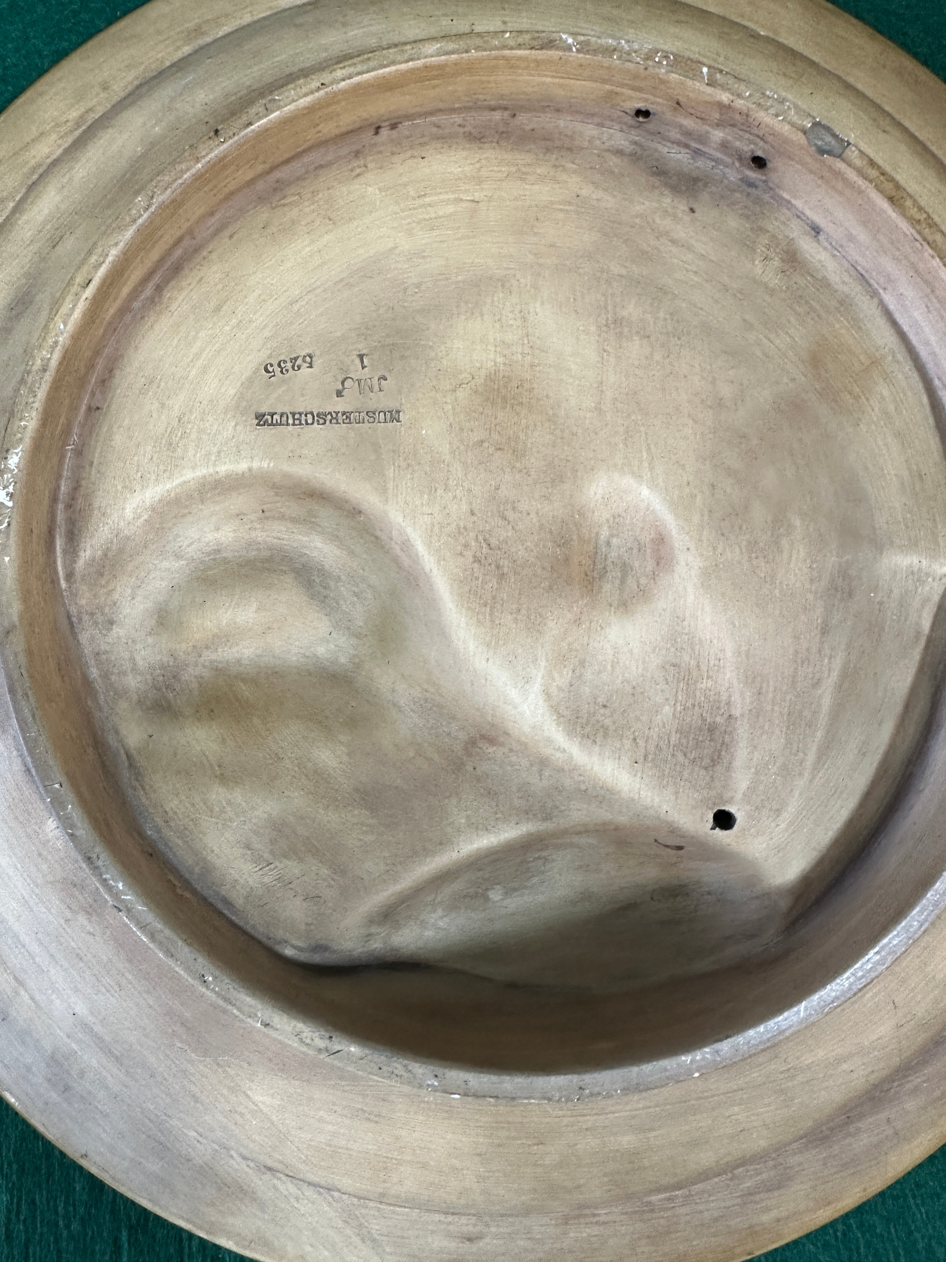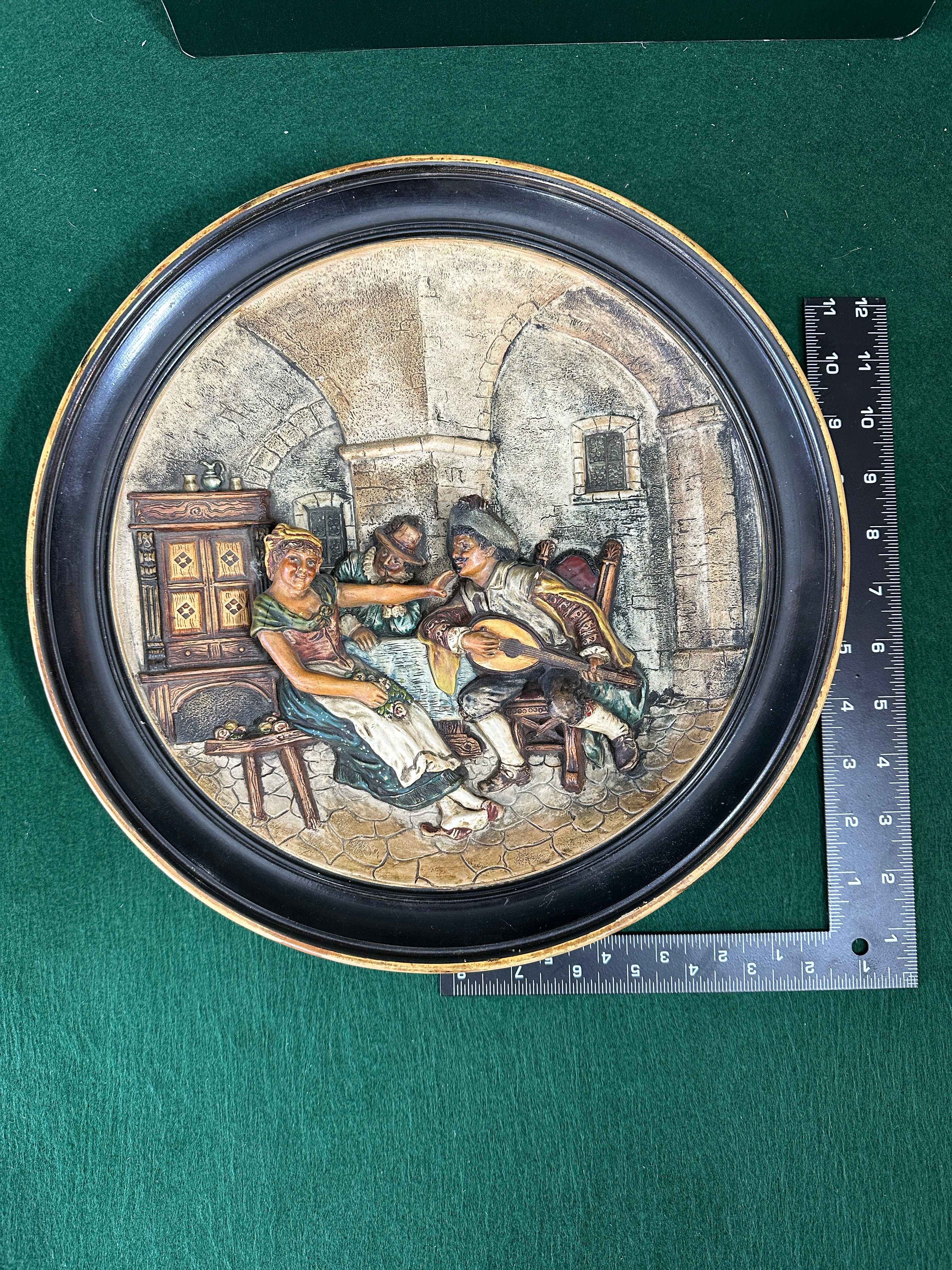 A Johann Maresch Musterschutz polychrome relief plaque, depicting an interior genre scene. The circular plaque features three figures in 17th-18th century style attire within an arched setting. One figure is shown playing a stringed instrument, another holding a glass, and a third, a seated woman, observes. The piece is crafted from a molded material, likely plaster, bisque, or a composition, with hand-painted details. It is presented within a black circular frame with a gold inner rim. The reverse of the plaque reveals the unglazed, bisque-like material and bears impressed markings including “JM 3”, “1”, “6235”, and “MUSTERGESCHUTZ,” which translates from German as “Design Protected.”