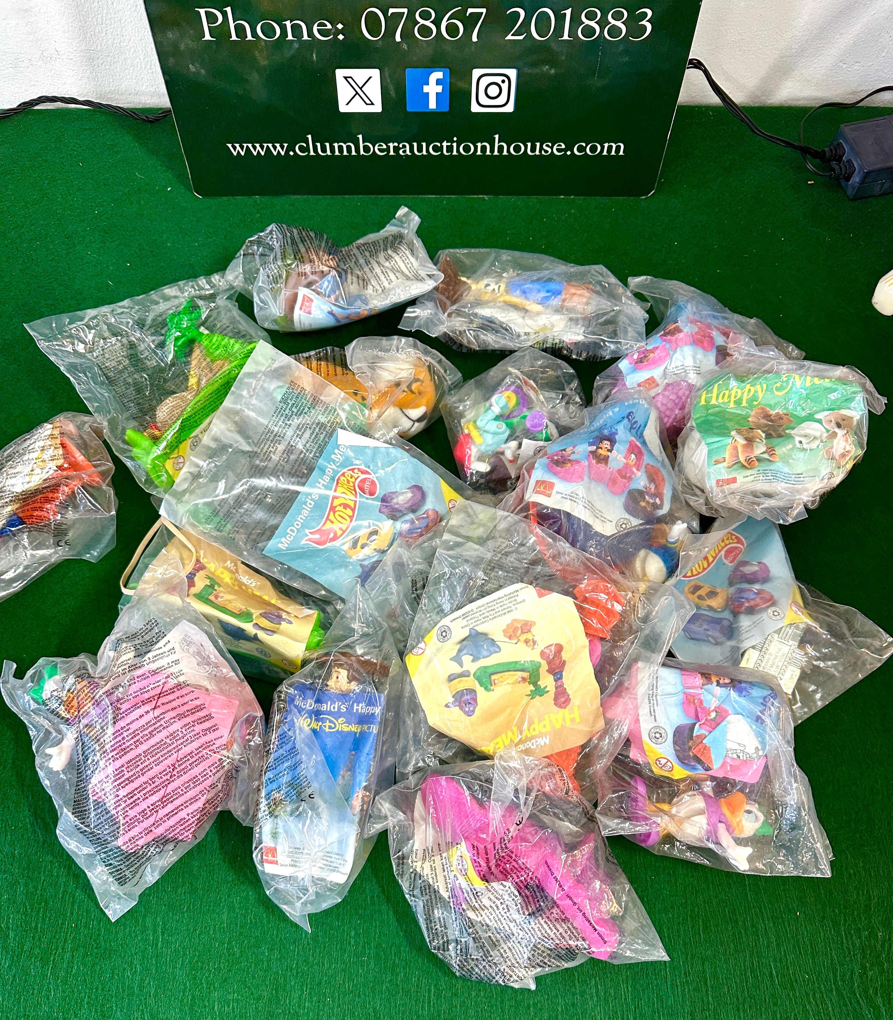 A collection of approximately twenty individual, mass-produced promotional toys, predominantly identified as McDonald’s Happy Meal items. Each toy is sealed in its original clear plastic packaging, which displays branding such as ‘McDonald’s Happy Meal,’ ‘Disney,’ ‘Hot Wheels,’ and the ‘Mattel’ logo. Visible copyright dates predominantly range from 1997-1998, including ‘© 1998 McDonald’s Corporation’ and ‘© 1997 Disney Enterprises, Inc.’ The packaging also features multilingual safety warnings, such as “Non adatto ai bambini di età inferiore a 3 anni” (Italian: Not suitable for children under 3 years of age) and “Uyarı: 3 yaşından küçük çocuklar için uygun değildir” (Turkish: Warning: Not suitable for children under 3 years), indicating they are not suitable for children under 3 years due to small parts. The toys are made primarily of plastic, with some likely plush materials.