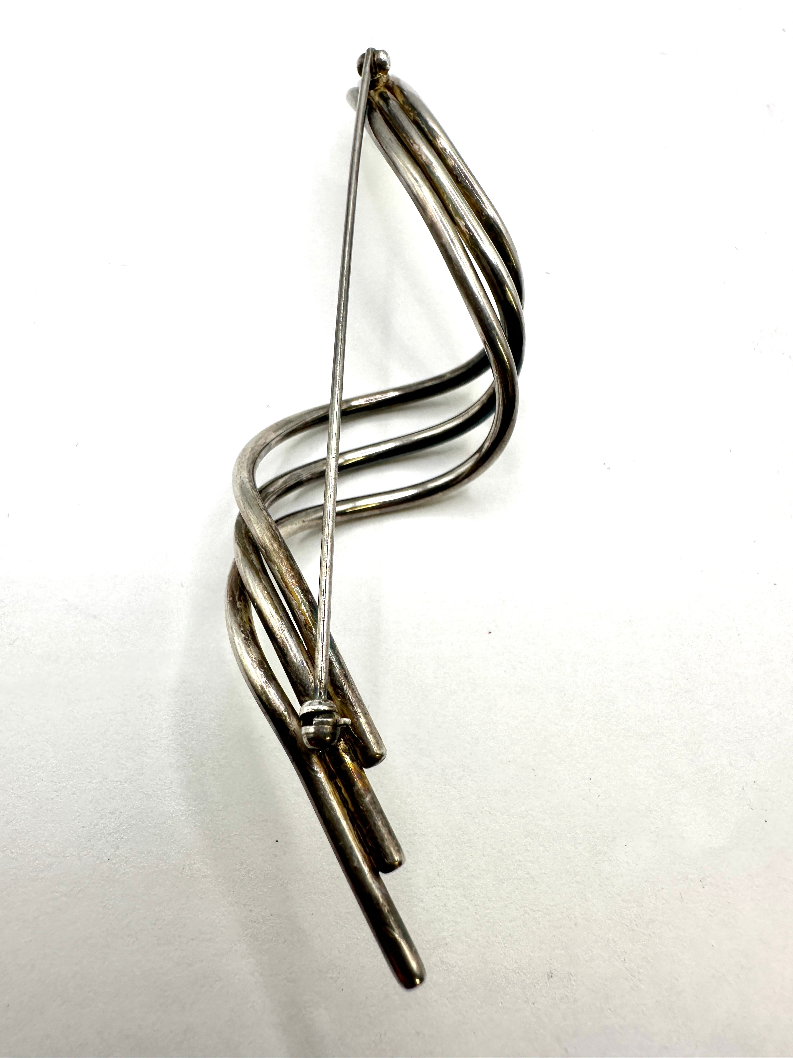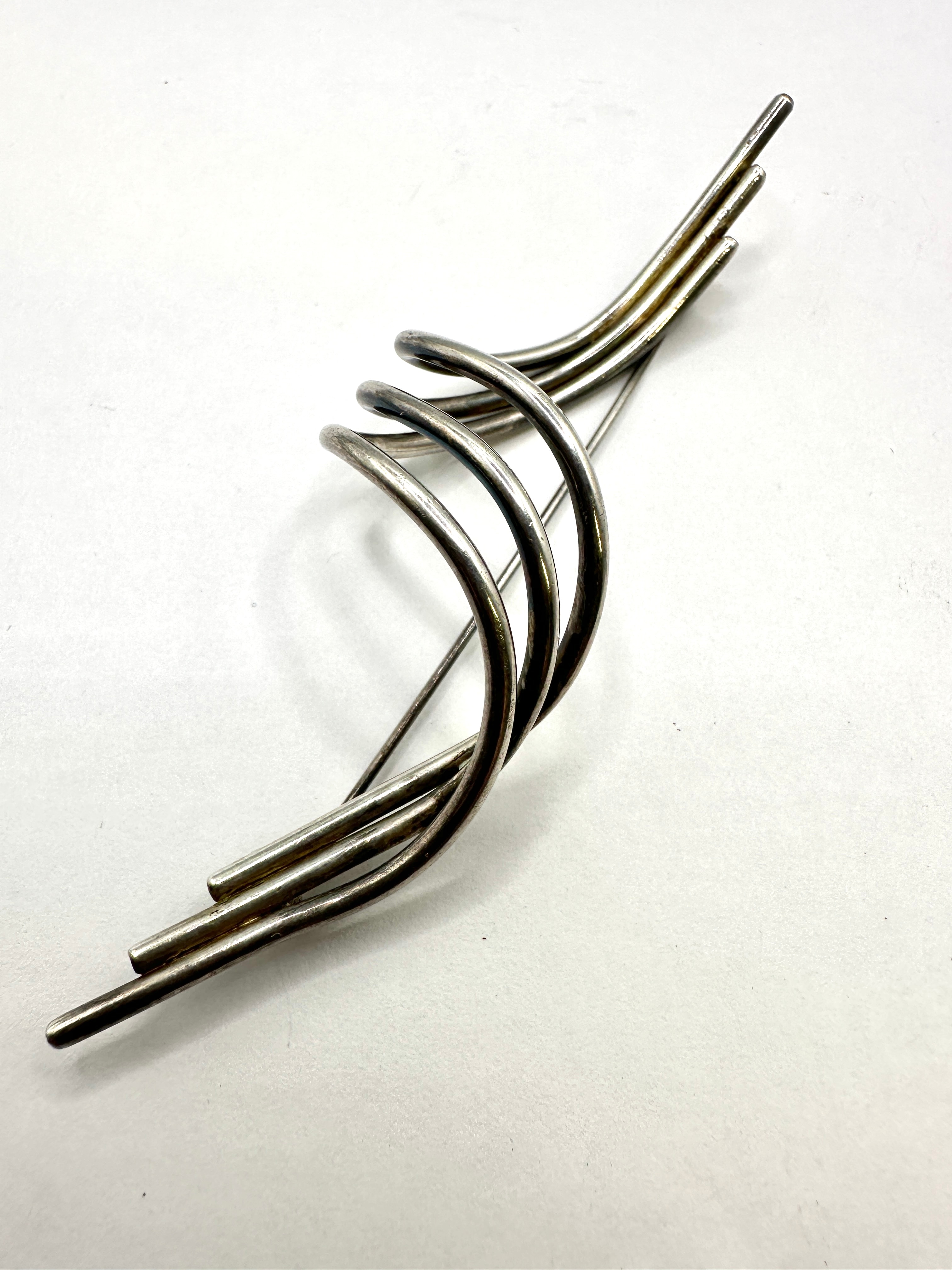 A Paloma Picasso 925 silver zig-zag brooch. This sculptural pin features multiple parallel, curved rods, creating an abstract design characteristic of Mid-Century Modern or Modernist aesthetics. The reverse is fitted with a standard hinged pin stem and C-clasp mechanism, both appearing intact. The item’s materials are confirmed to be 925 silver.