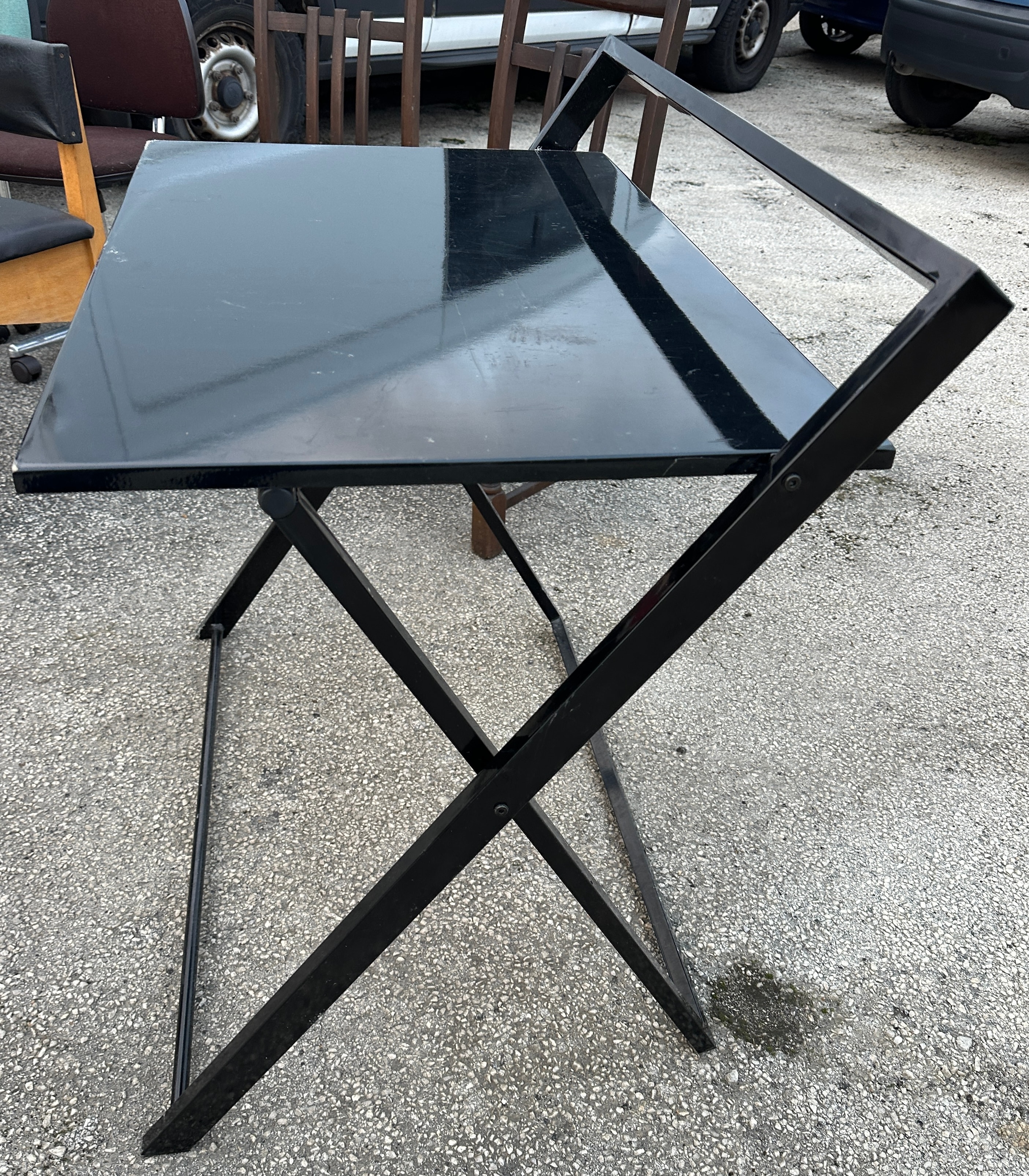 A OneSpace Basics folding desk. This utilitarian, modern-style table features a black-finished, rectangular top supported by a folding X-frame base. An additional horizontal support bar is present at the rear upper edge of the top, allowing for a tiltable surface. The structure is crafted from black-painted metal, with the tabletop likely fashioned from a black laminate or painted wood composite.
