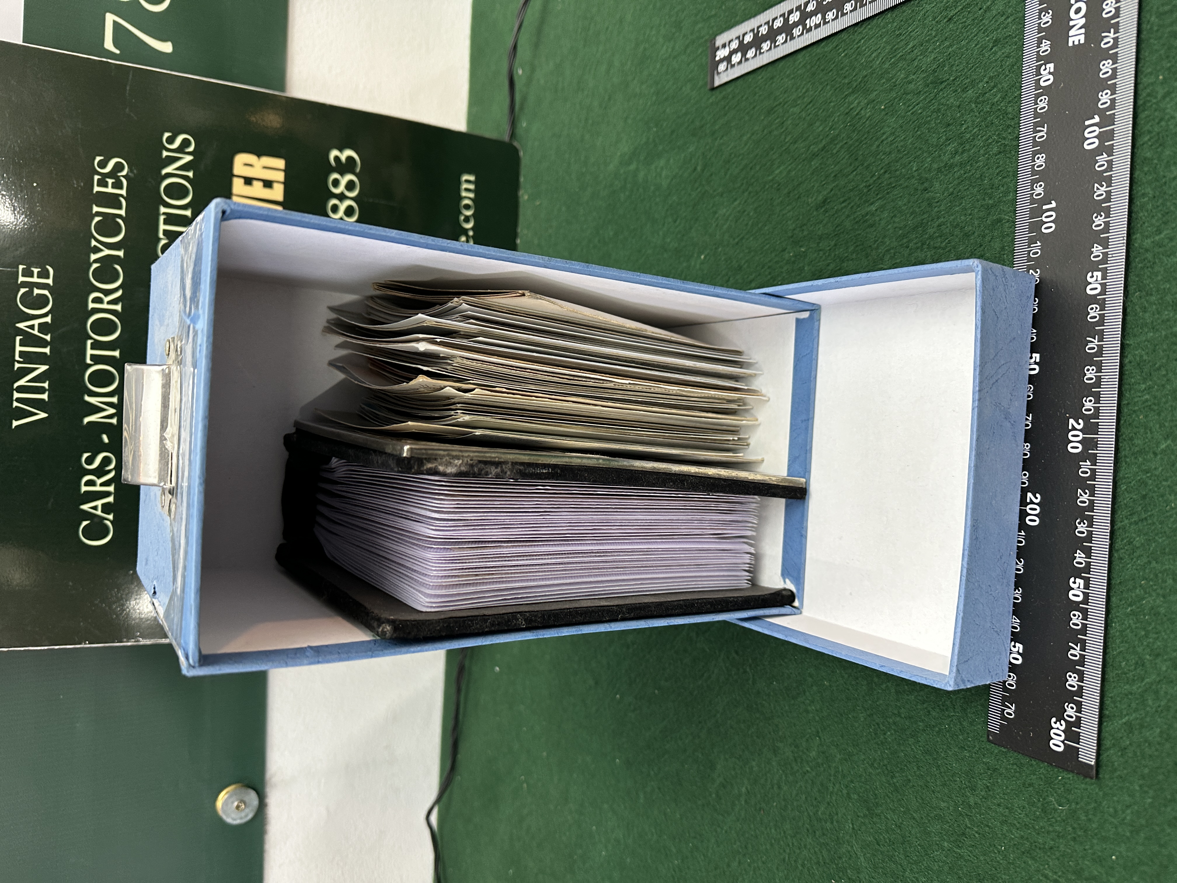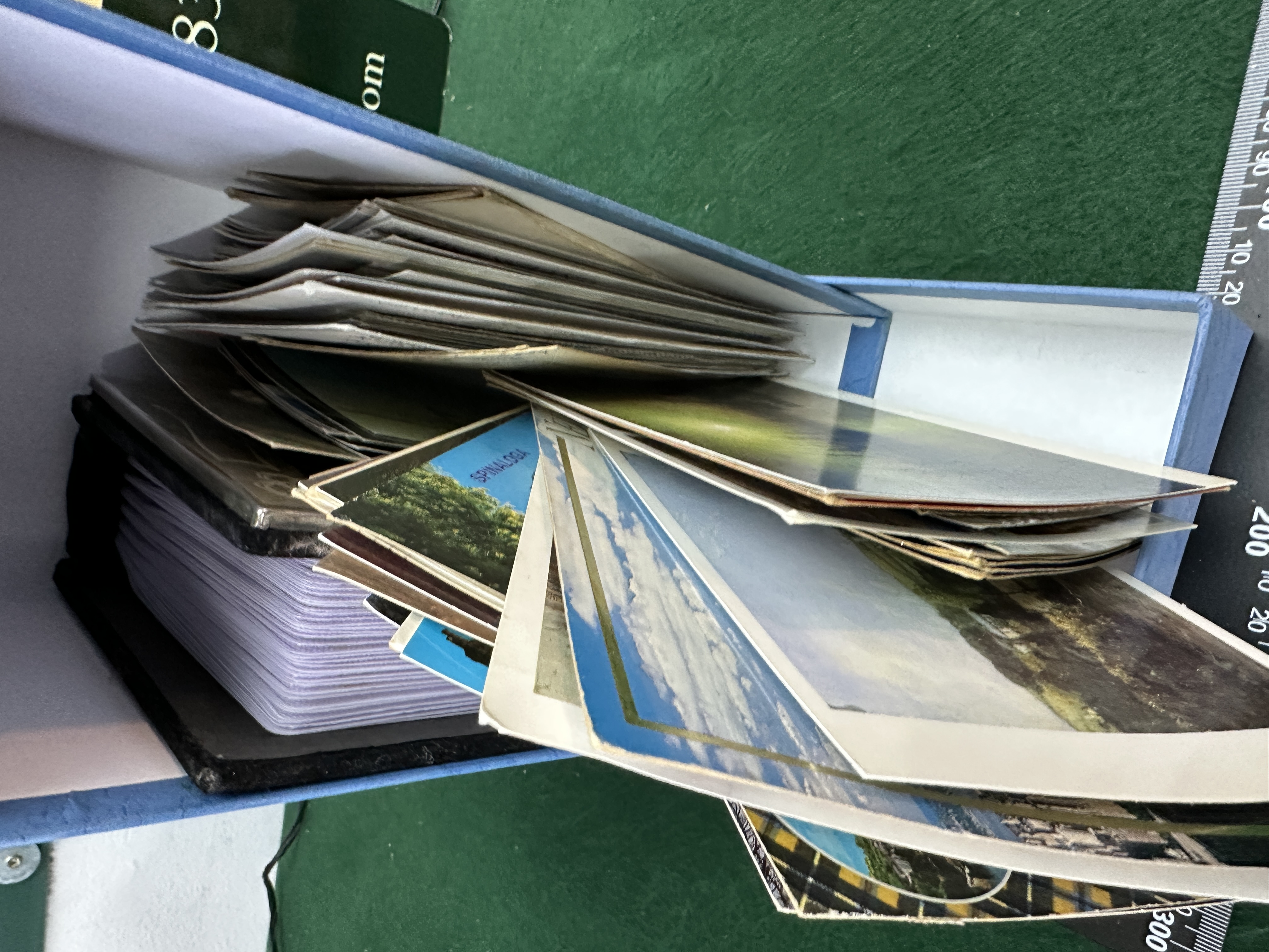This lot comprises a collection of paper ephemera, primarily consisting of postcards or photographic prints, housed within a small, light blue textured cardboard storage box. The collection is divided into two main groupings: a large stack of loose, rectangular cards and a smaller group bound or sleeved in black material. The box features a hinged lid secured by a small metal latch. The contents appear to be vintage travel or scenic images, with the location “SPINALOGA” visible on one card. The collection is offered as a single lot.