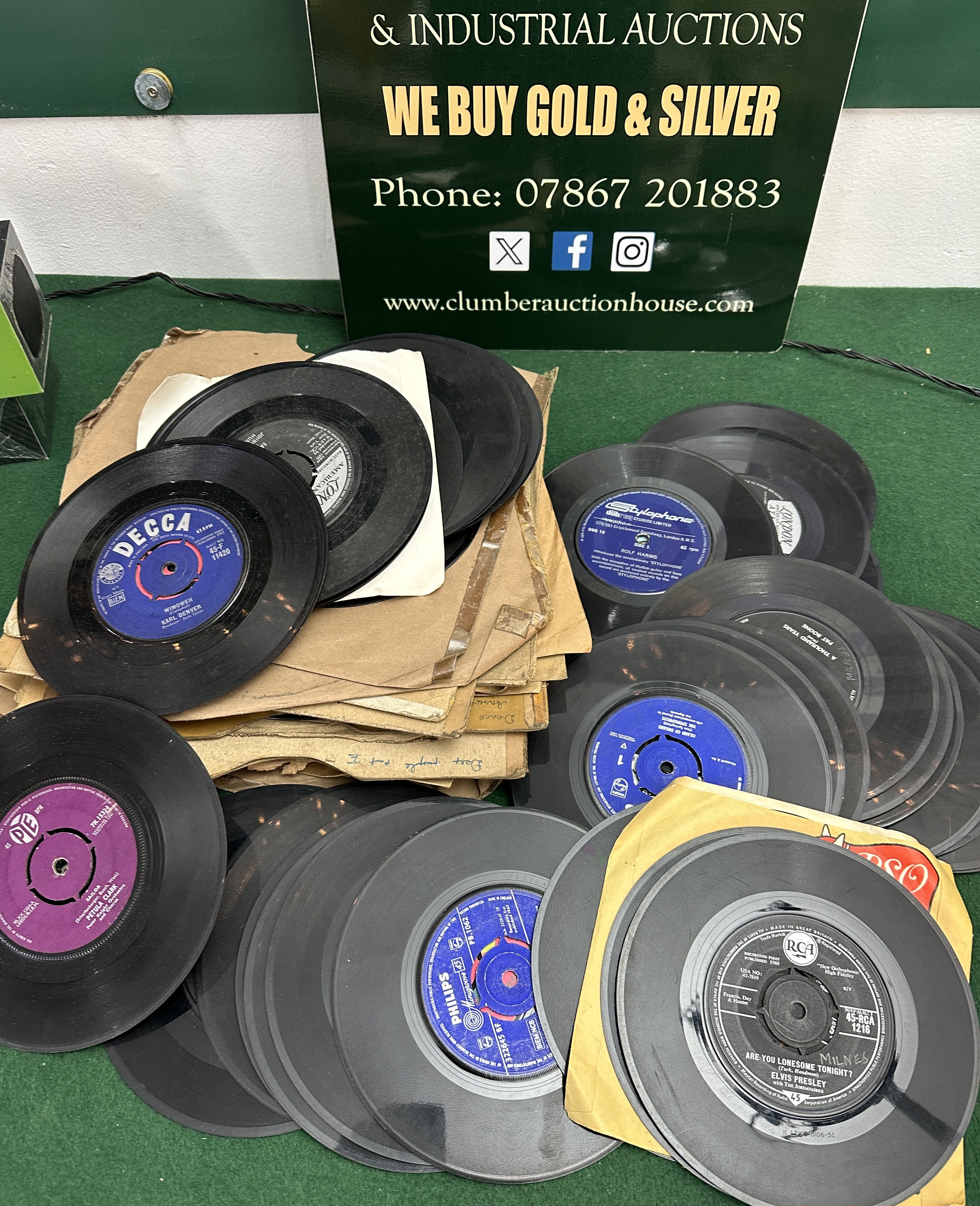 This lot consists of a substantial collection of 7-inch 45 RPM vinyl singles, primarily dating from the early 1960s onwards, featuring various popular artists and genres of the era. The records are sourced from several prominent labels, including RCA, Decca, and Philips. The lot is presented alongside promotional materials for Clumber Auction House. As this is a non-automotive lot, no vehicle specifications are applicable.