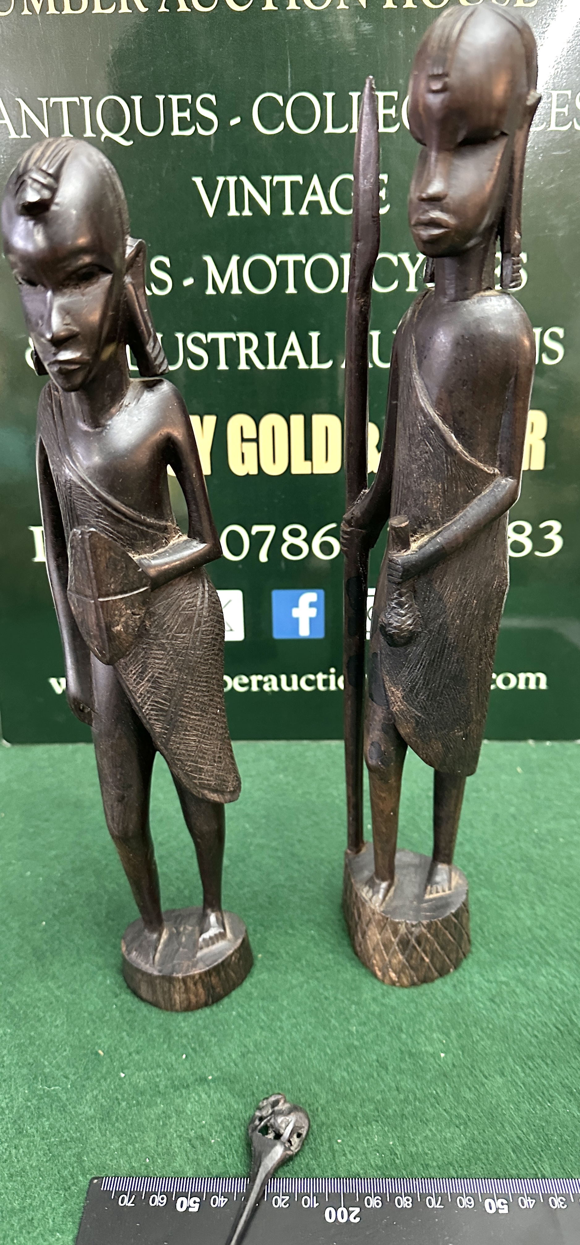 This lot comprises a pair of vintage hand-carved figures, executed in dark ebony wood. The figures appear to depict a male warrior holding a spear and a female figure, exhibiting traditional tribal carving techniques. Also included is a small, intricately carved wooden implement, possibly a spoon handle, featuring a detailed elephant motif. The pieces show a deep patina and surface wear consistent with age and handling. No automotive data, VIN, or registration information could be extracted from the provided images.