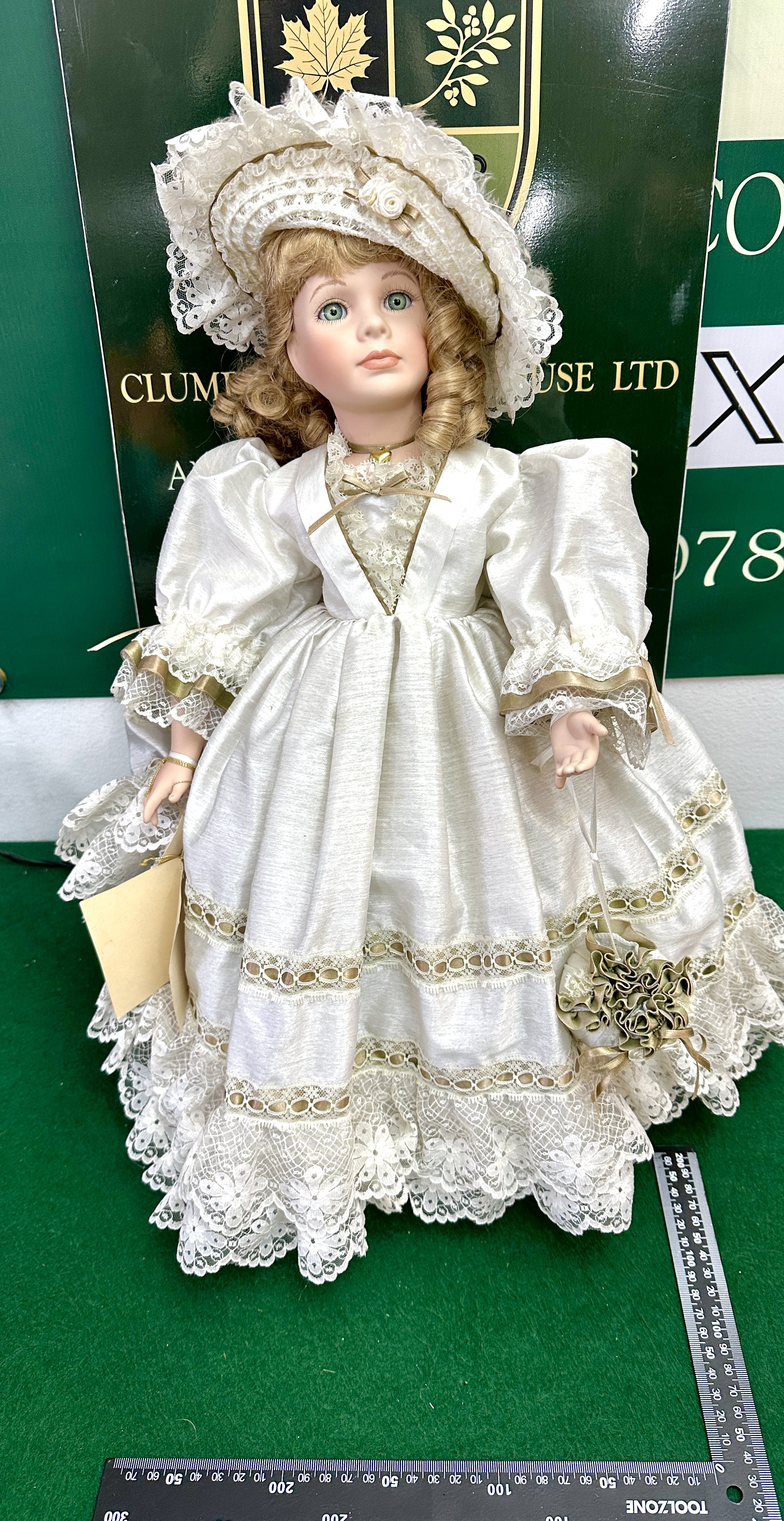 This is a highly detailed collectible porcelain doll, identified by partial signage as potentially manufactured by Clumbhouse Ltd. The figure is dressed in an elaborate formal gown, likely representing a bridal or period costume, featuring extensive white and cream lace overlays, pleated satin-look fabric, and accents of gold and olive green ribbon detailing on the sleeves and skirt. The doll wears a matching lace bonnet and holds a small fabric posy/purse and a blank manila tag attached by a gold string.