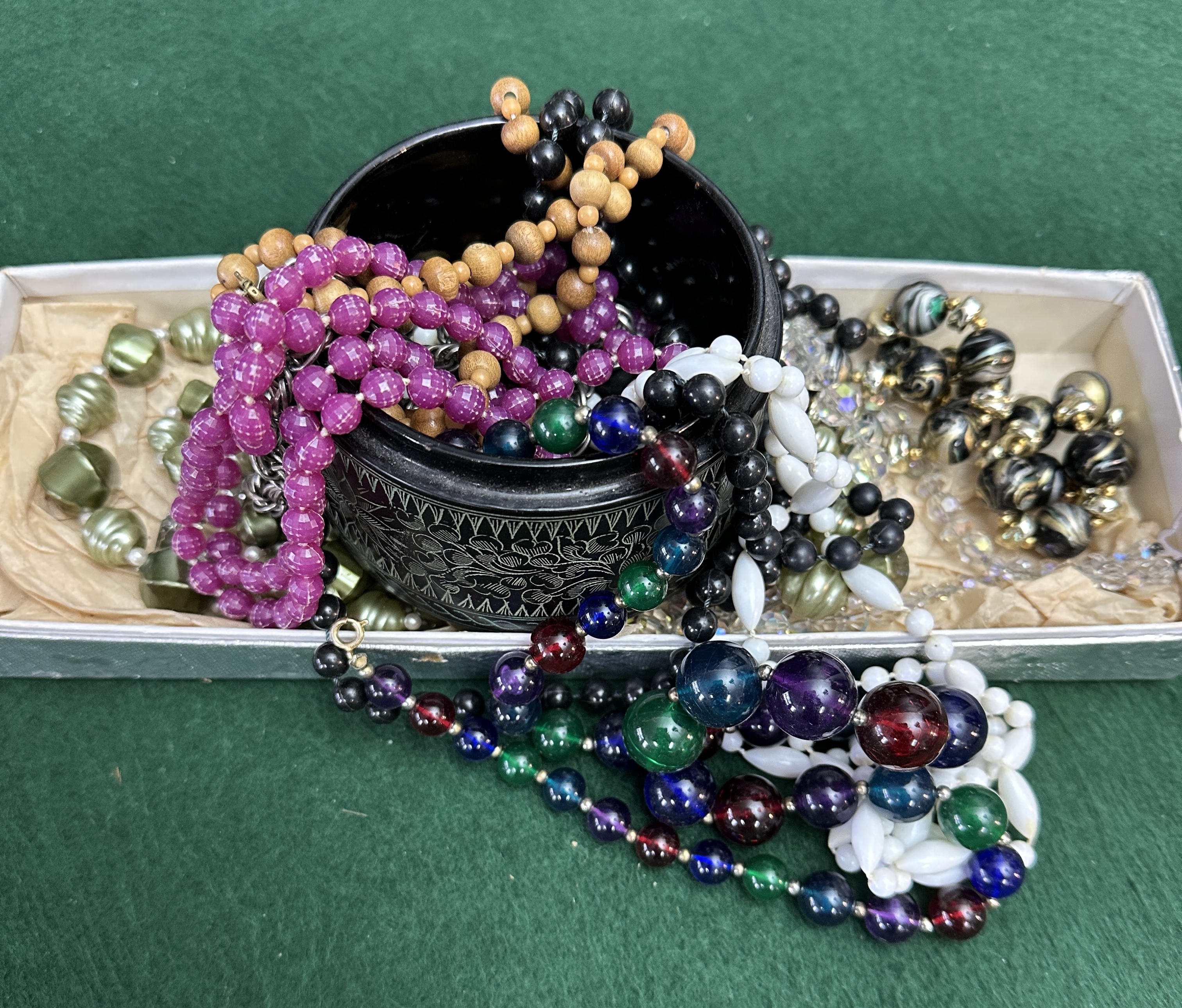 This lot comprises a diverse collection of beaded jewelry, ranging from vintage costume pieces to potentially modern natural stone items. The collection includes various colors and sizes, notably large purple faceted beads, multi-colored glass beads, black and white plastic beads, and natural wooden beads, presented loosely in a small cardboard storage box and a decorative etched black bowl. The collection includes natural and colorful beaded items.