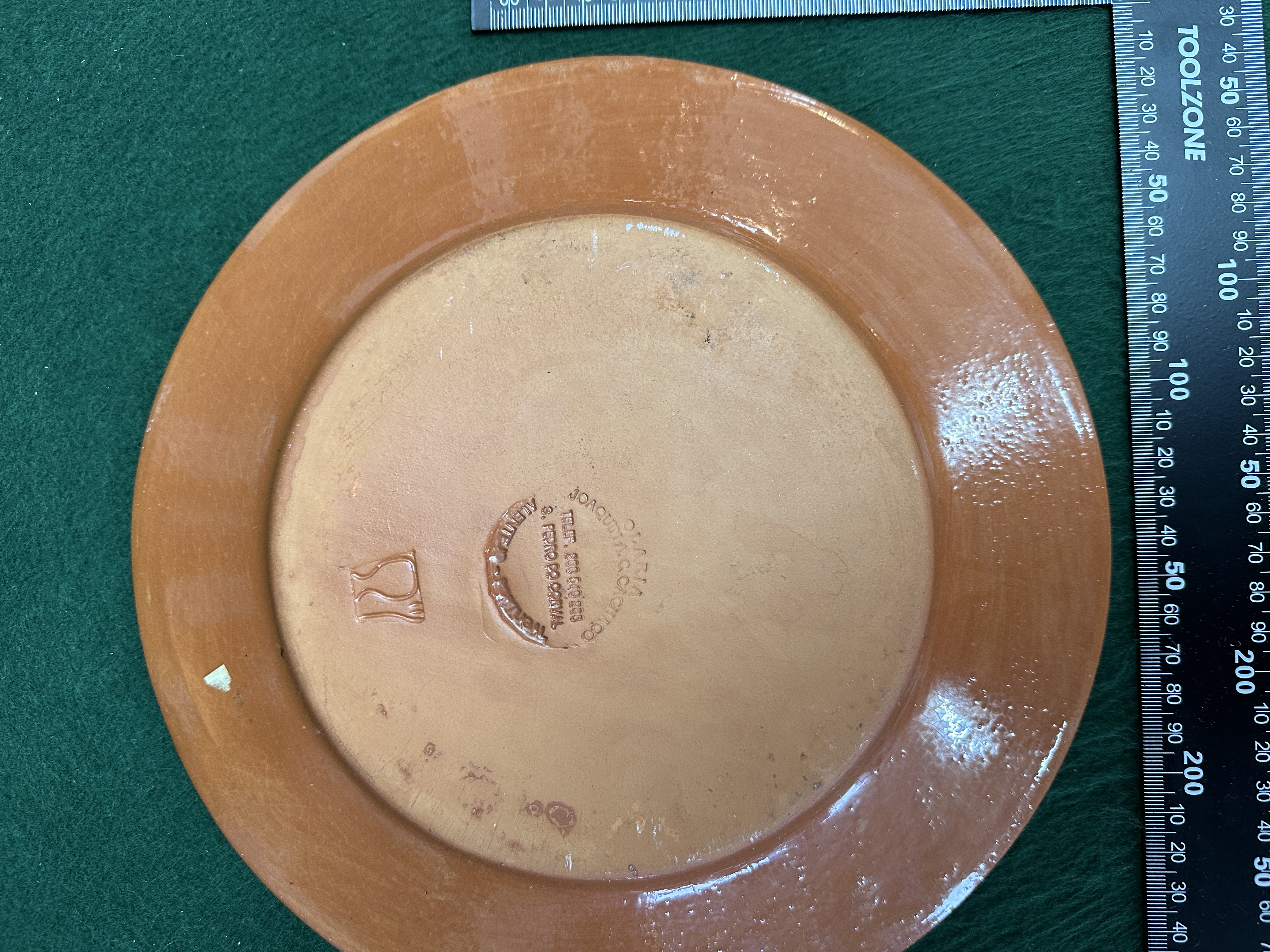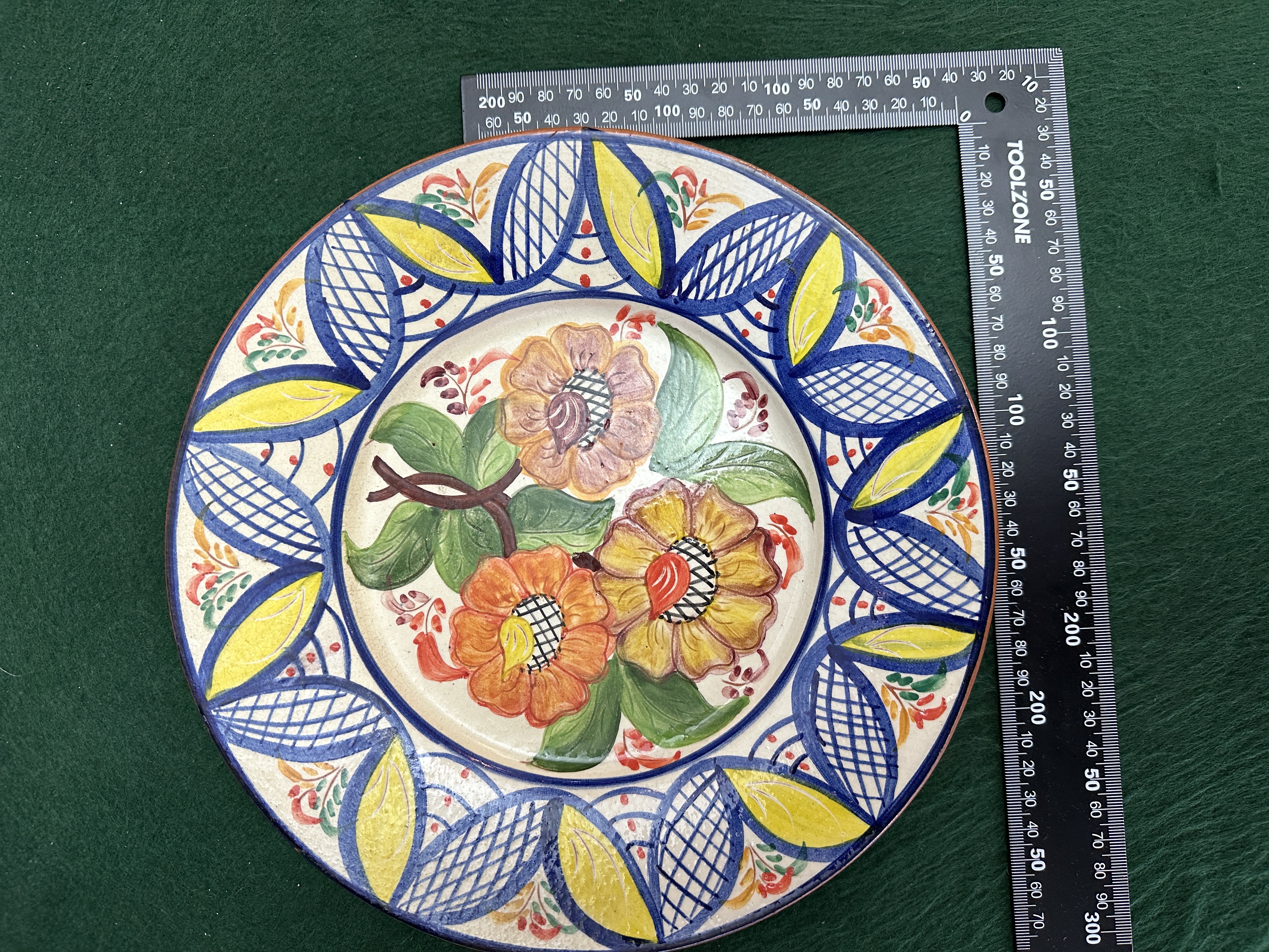 This lot presents a vintage hand-crafted ceramic plate constructed from terracotta pottery. The front surface features a vibrant glazed finish with a central floral design depicting three large flowers surrounded by intricate blue geometric and yellow leaf patterns. The reverse side is unglazed terracotta, displaying an impressed circular stamp and a stylized potter’s mark, indicating artisanal production. The item measures approximately 230 mm in diameter, consistent with a standard wall or dining plate.