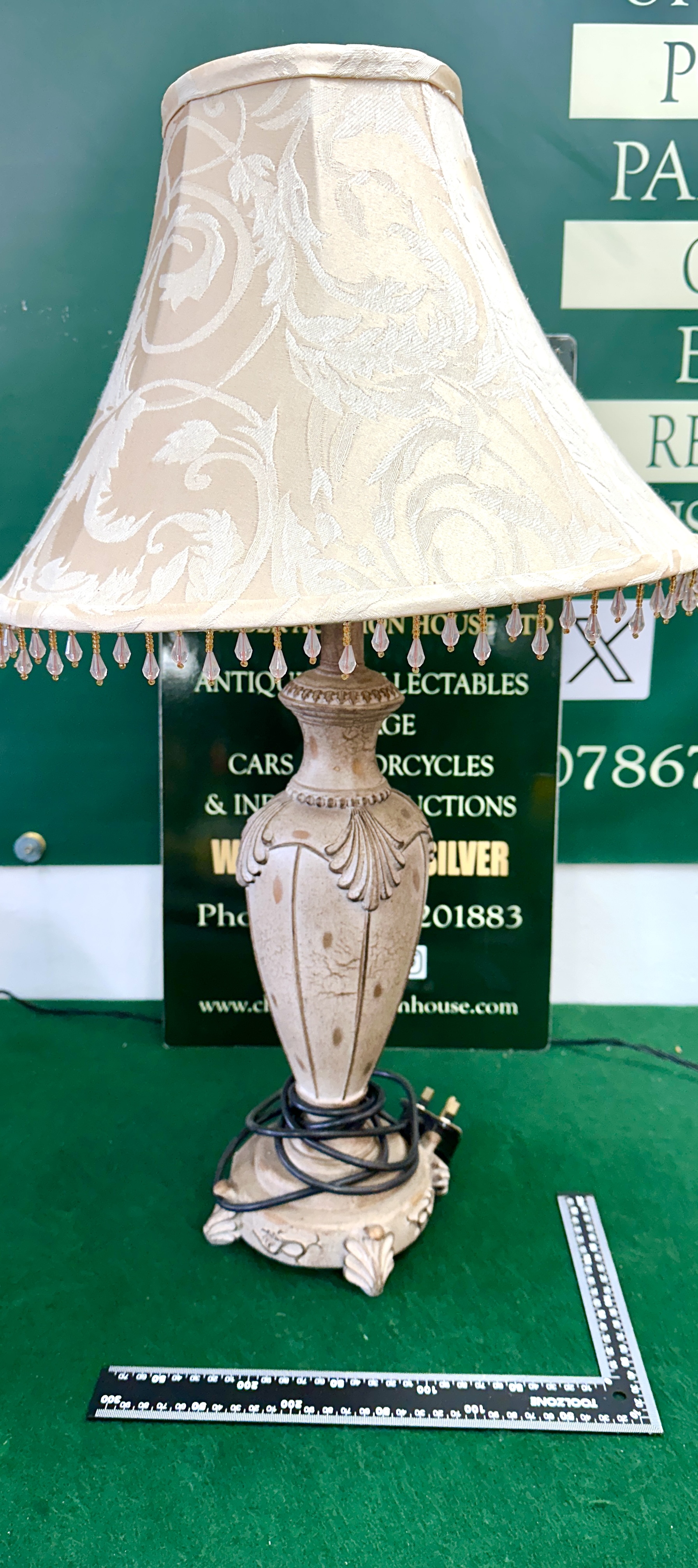 A decorative table lamp featuring a substantial urn-form base, finished in a distressed cream/light beige patina designed to mimic aged stone or carved wood. The base features stylized shell or leaf motifs around the neck and a stylized, footed base. It is topped with an octagonal fabric shade displaying a subtle damask pattern, finished with a decorative fringe of clear and pink glass beads strung on gold-toned seed beads. The item includes a coiled black electrical cord terminating in a standard UK three-pin plug.