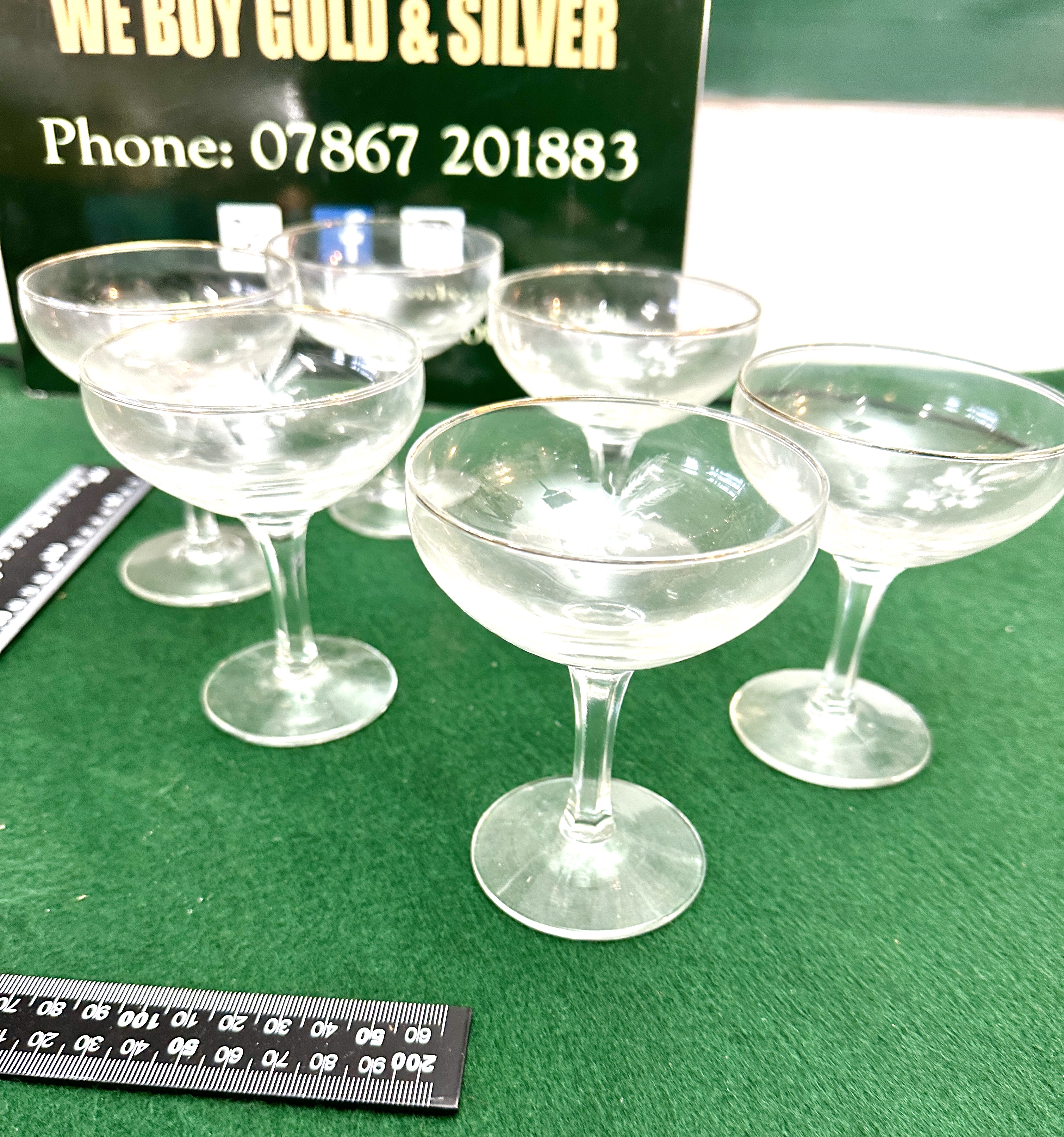 A collection of six vintage stemmed glasses, identified as champagne coupes or cocktail saucers. The clear glass bowls feature faint etched detailing, appearing to be floral or wheat stalk patterns, and are finished with a thin, worn gilt band around the rim. The glasses are presented on a green felt surface, with a metric ruler included in the image for scale reference.