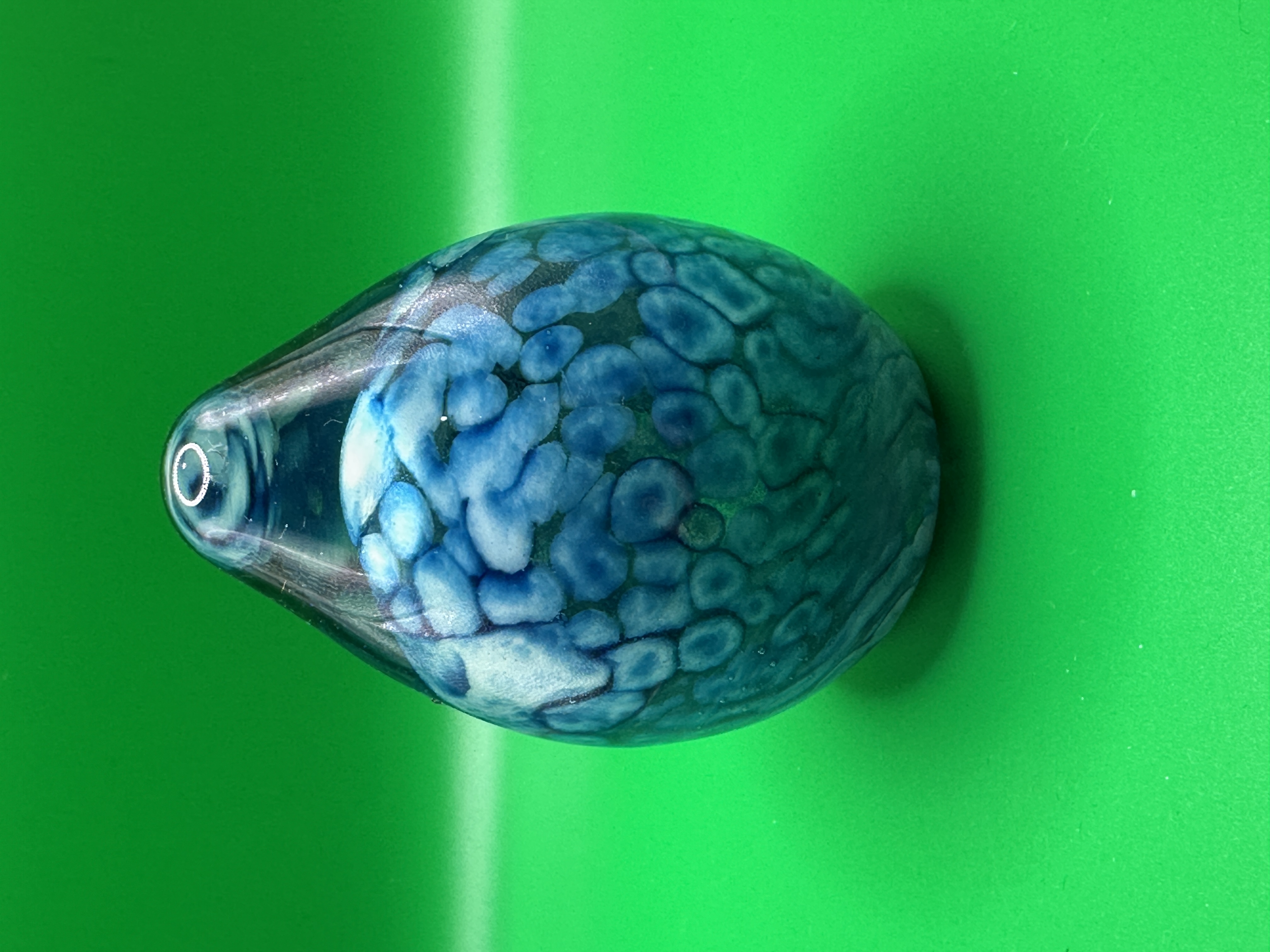 This lot comprises a single abstract decorative object, likely crafted from clear glass or resin. The piece features a distinct internal cellular pattern utilizing various shades of blue and white, giving the appearance of a trapped liquid or cloud formation. The object is tear-drop shaped with a clear, rounded apex. Note: This item is a decorative object and is not a motor vehicle or a component of a motor vehicle.