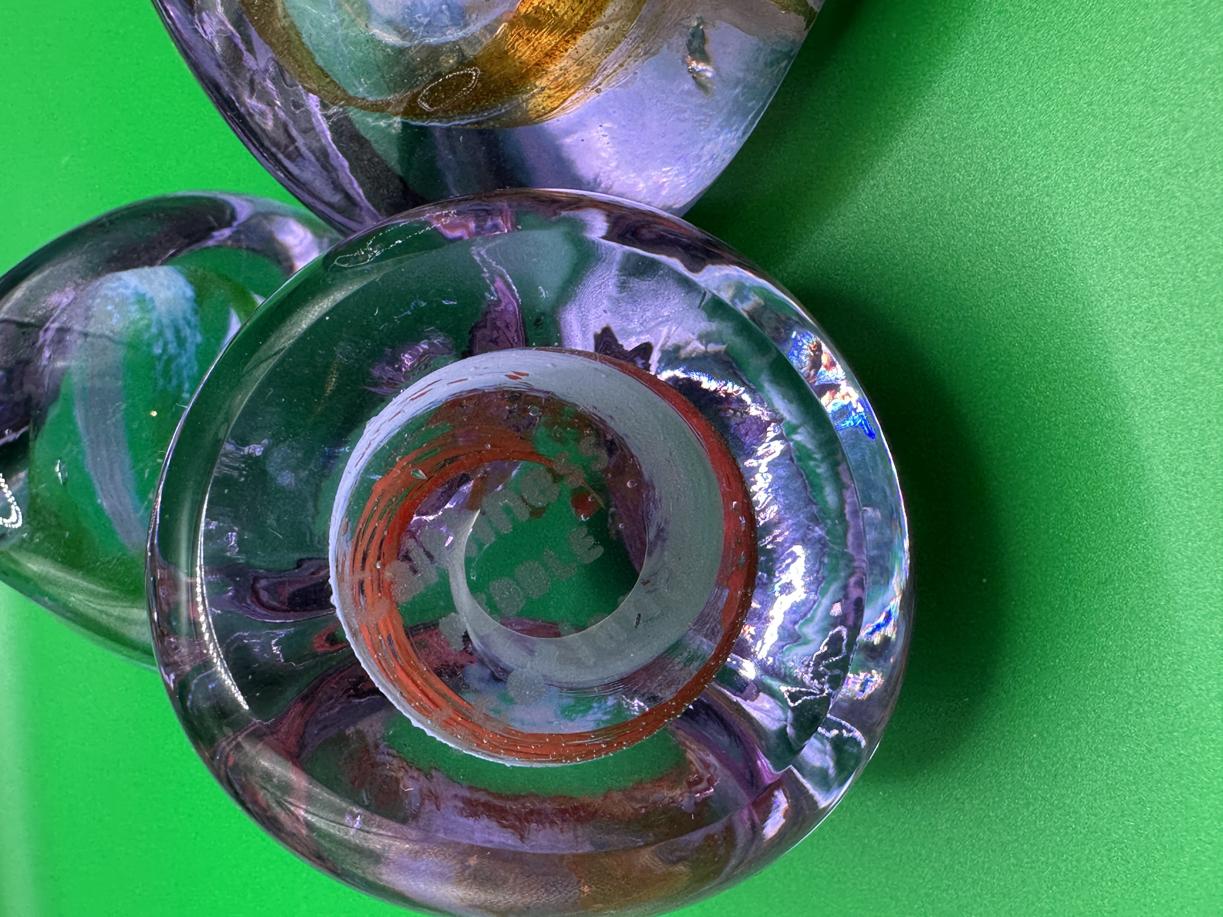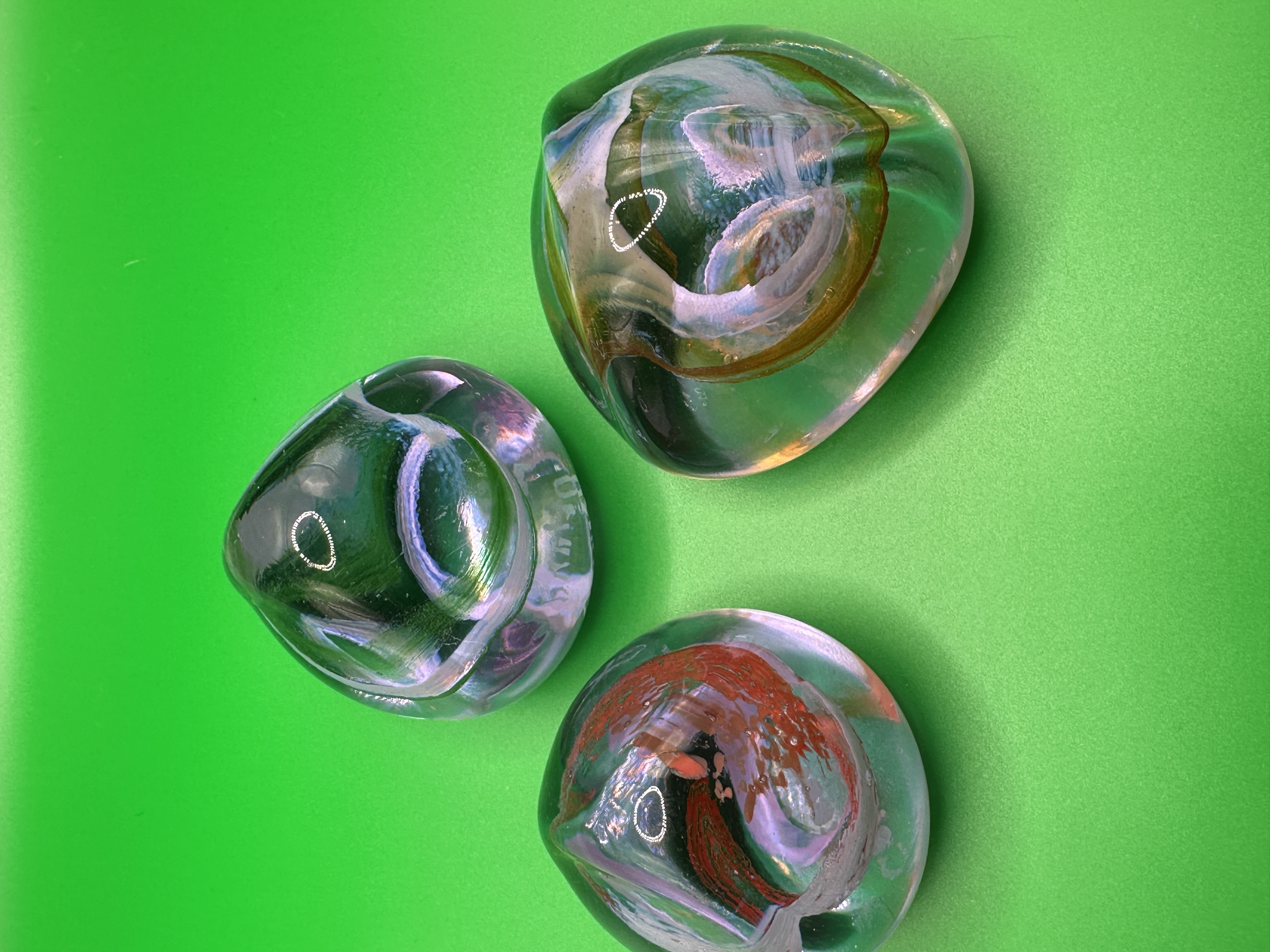 This lot comprises three individual pieces of studio art glass, likely functioning as paperweights or small decorative sculptures. Each piece features a clear, highly polished exterior encapsulating vibrant, freeform internal swirls of color. The forms are organic and asymmetrical, designed to catch and refract light. The internal color patterns include red and orange swirls in one piece, yellow and gold swirls in a second, and purple and blue tones in the third.