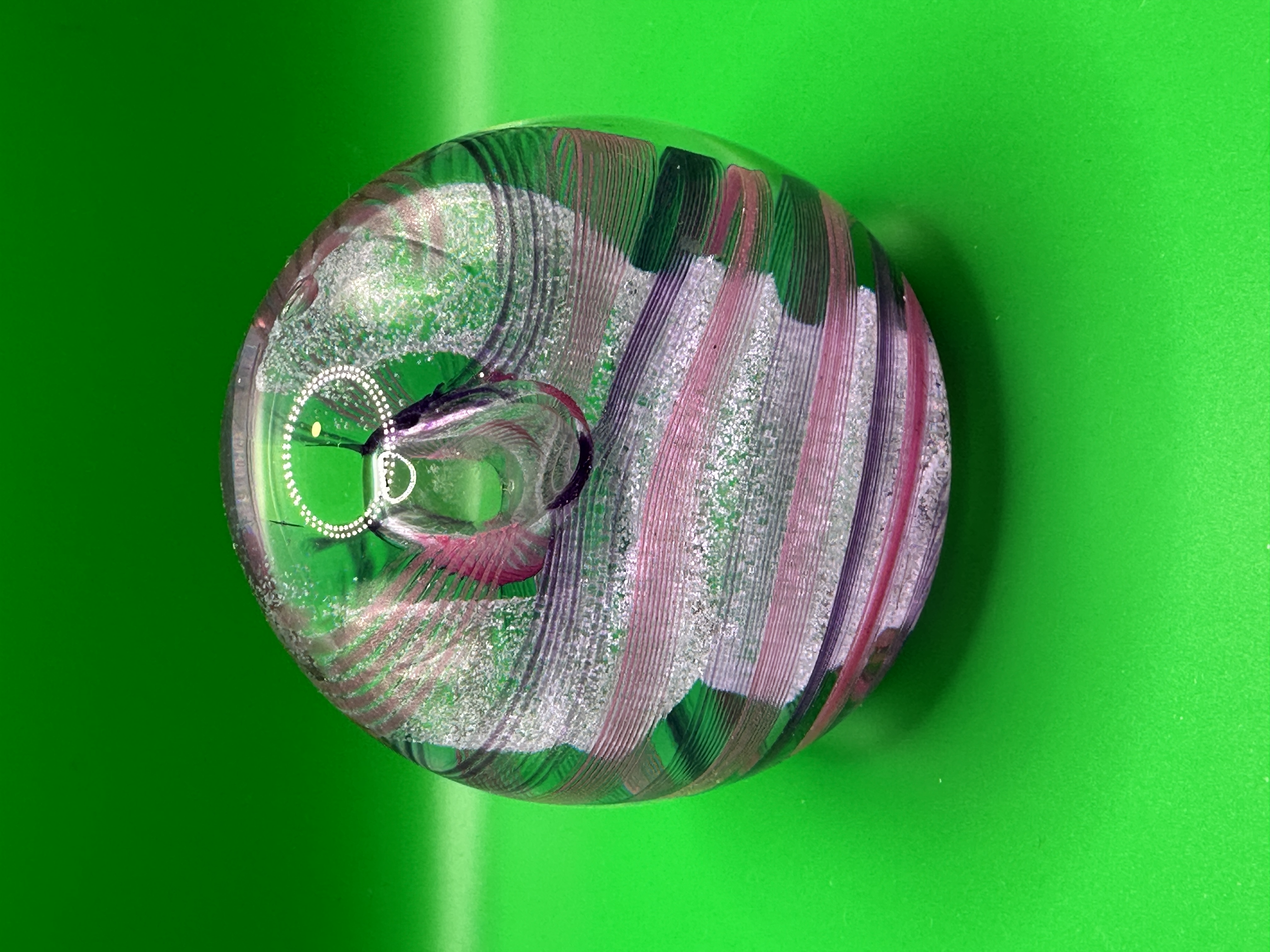 A contemporary spherical art glass paperweight featuring a vibrant internal abstract design. The clear glass encasement holds dense bands of iridescent pink, purple, and green glass, interspersed with fine white/silver sparkly inclusions (frit). The design includes a deliberate central air bubble. The piece is consistent with styles produced by studios such as Caithness.
