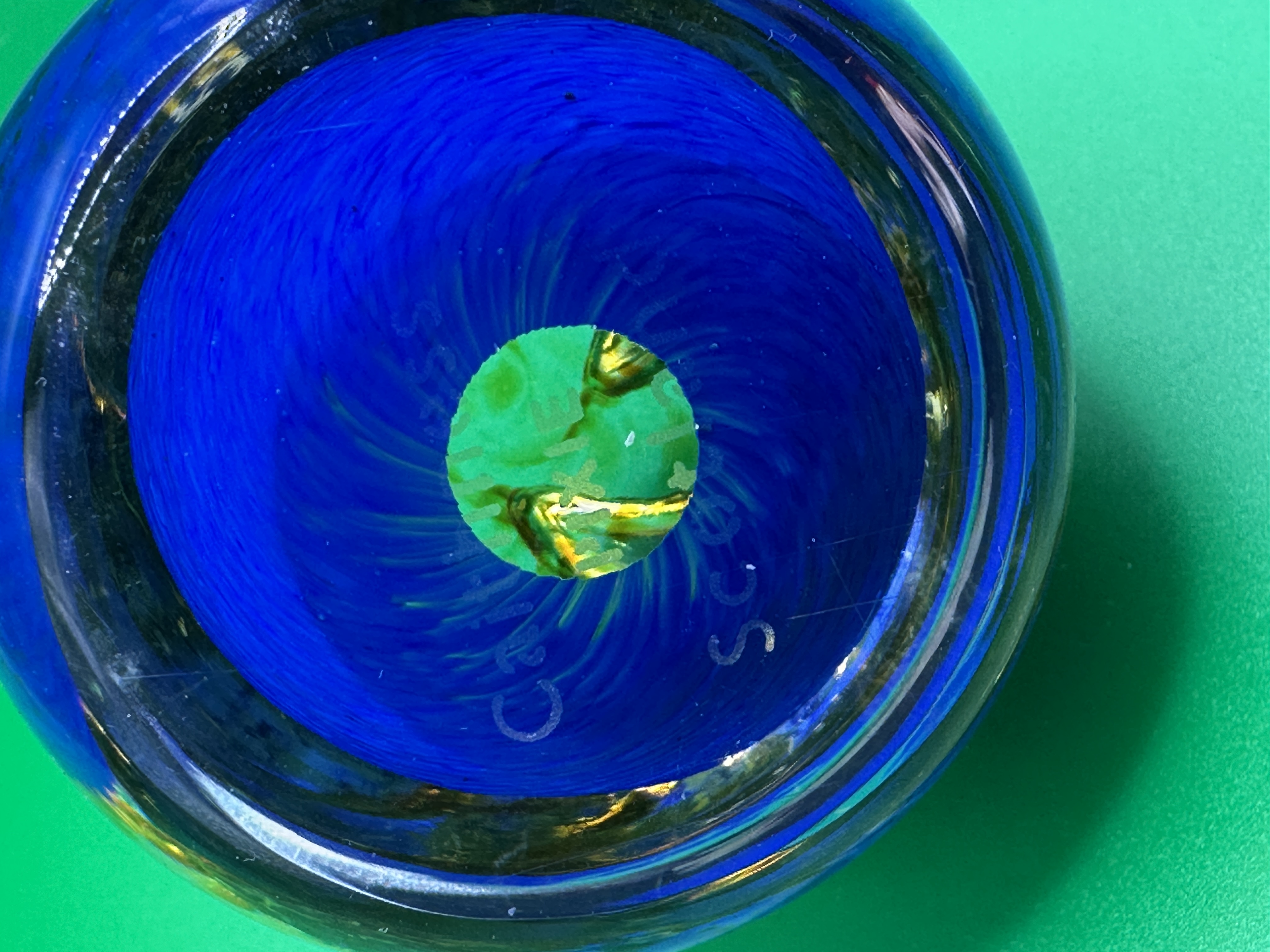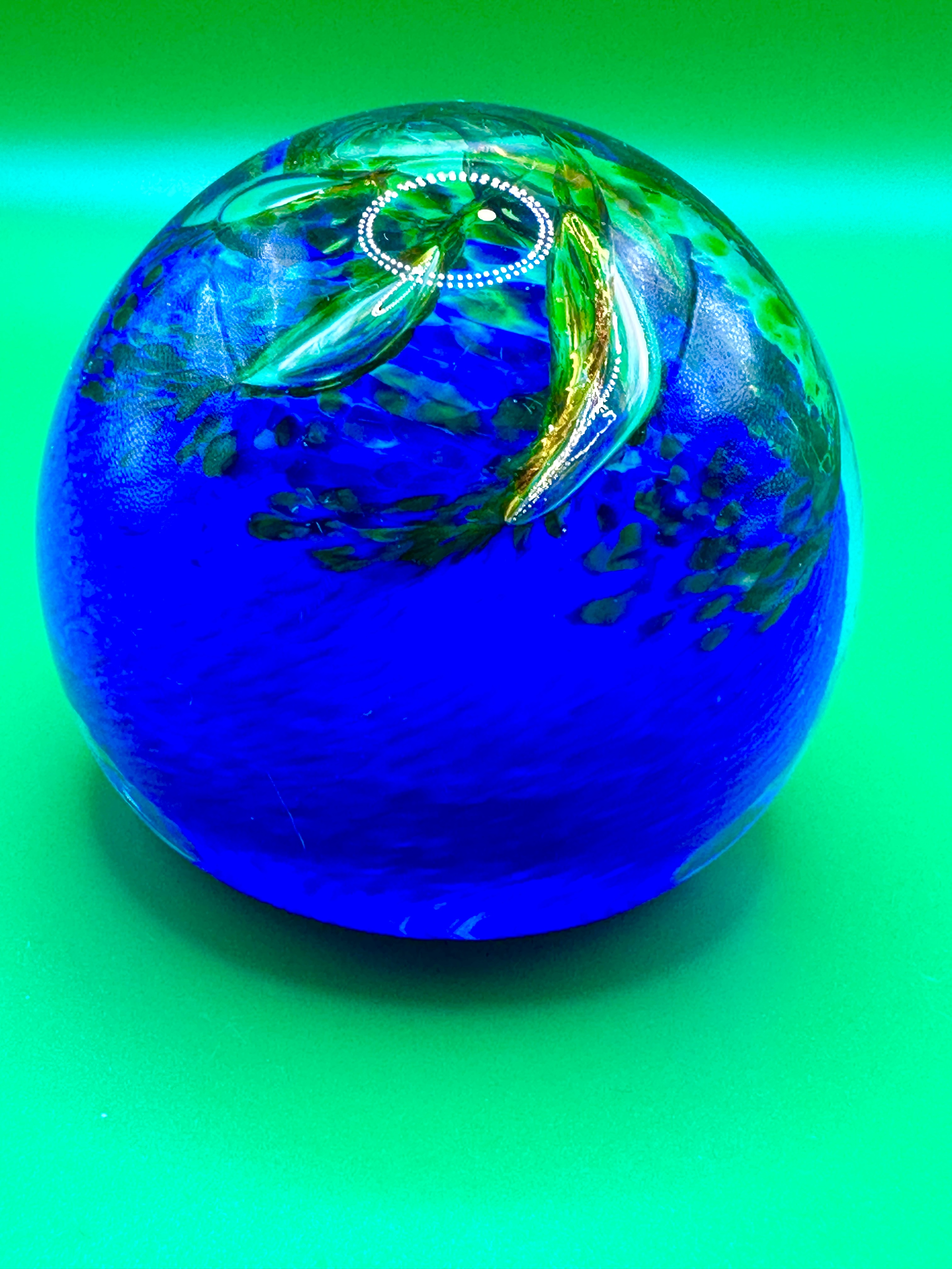 This large, highly polished art glass sculpture is presented in a spherical orb format, commonly referred to as an aquarium paperweight. The piece features a dominant deep royal blue coloration, suggesting an oceanic environment, contrasted by internal swirls and embedded inclusions of emerald green and gold foil, creating a dynamic underwater effect. The base shows faint etched markings, consistent with studio art glass production, potentially identifying it as a piece by Caithness or a similar Scottish glass studio.