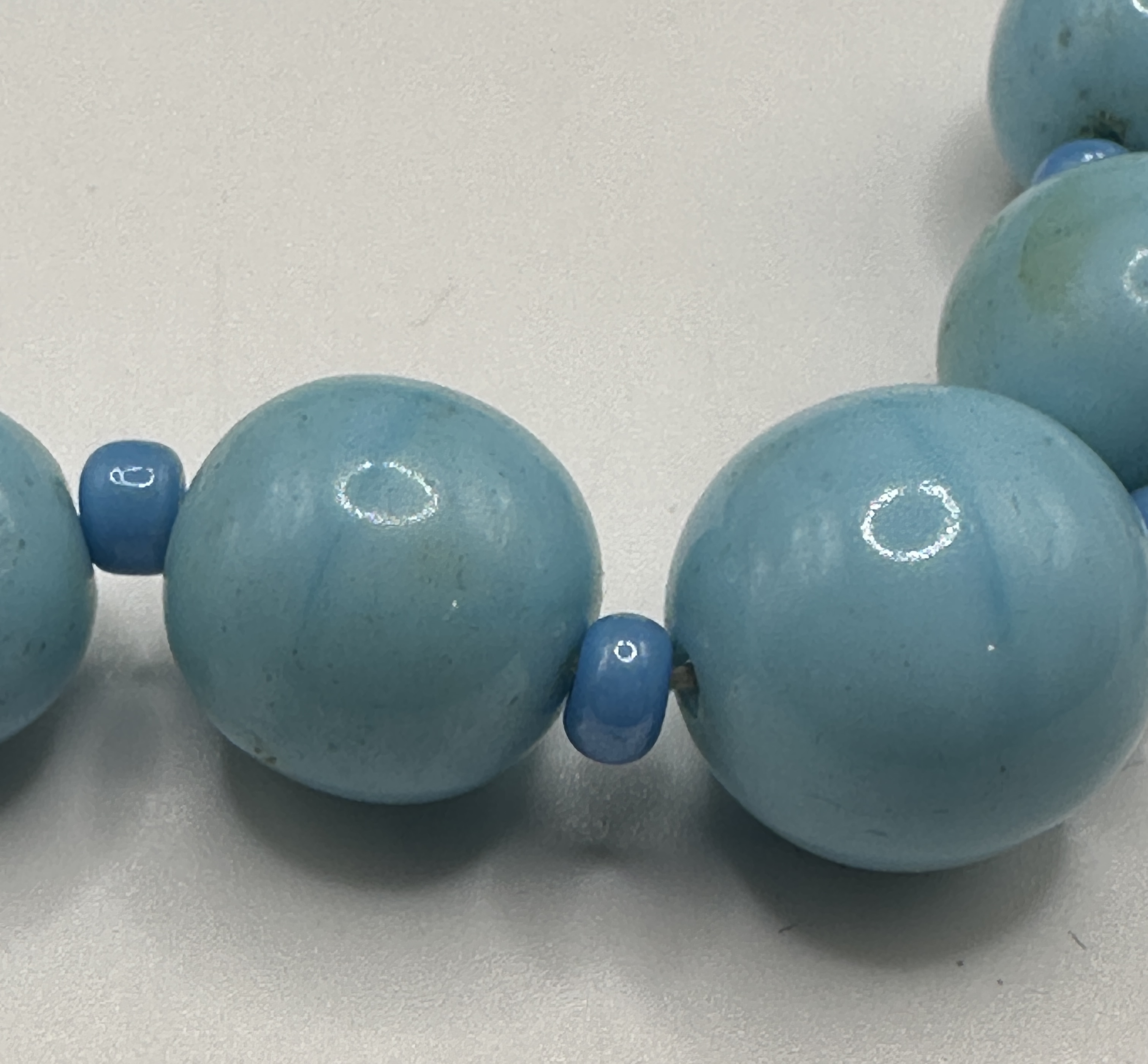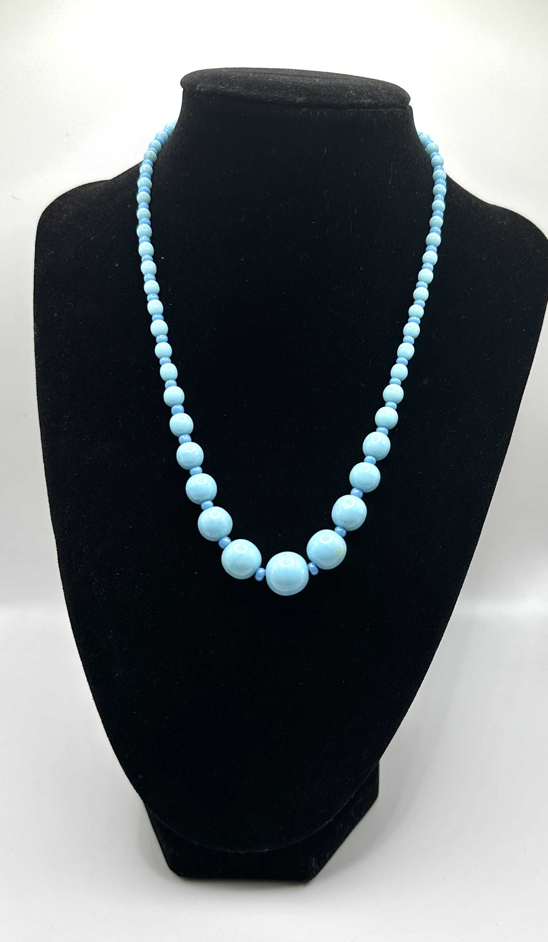 The item presented for cataloguing is a piece of jewelry, specifically a graduated beaded necklace displayed on a black velvet bust. The beads are round, glossy, and exhibit a bright blue or turquoise hue. The strand features a progression in bead size, transitioning from smaller beads at the ends to larger, more prominent beads at the center. As the item is not an automobile, standard vehicle specifications such as Make, Model, Engine Capacity, and VIN are not applicable and cannot be provided.