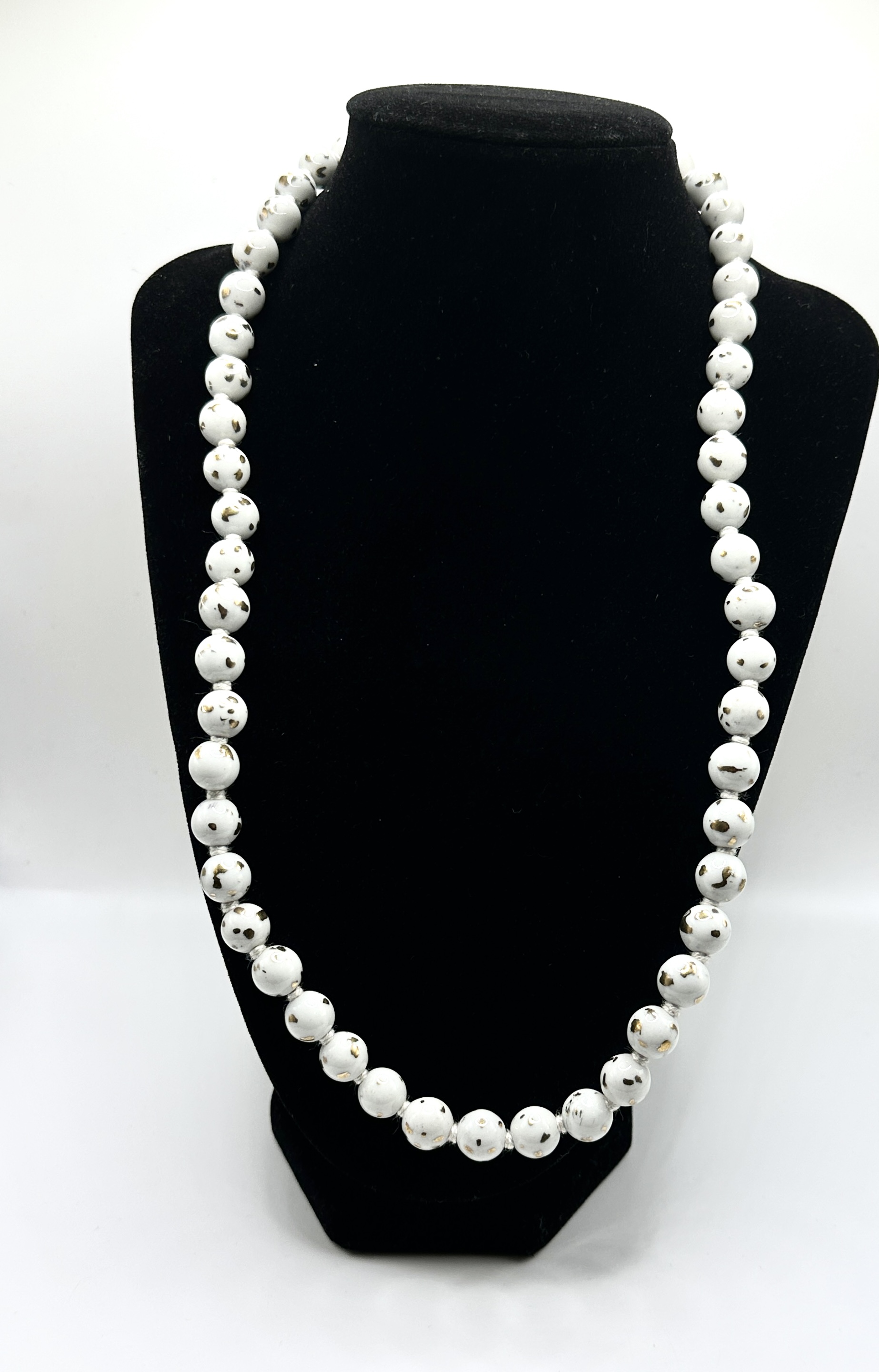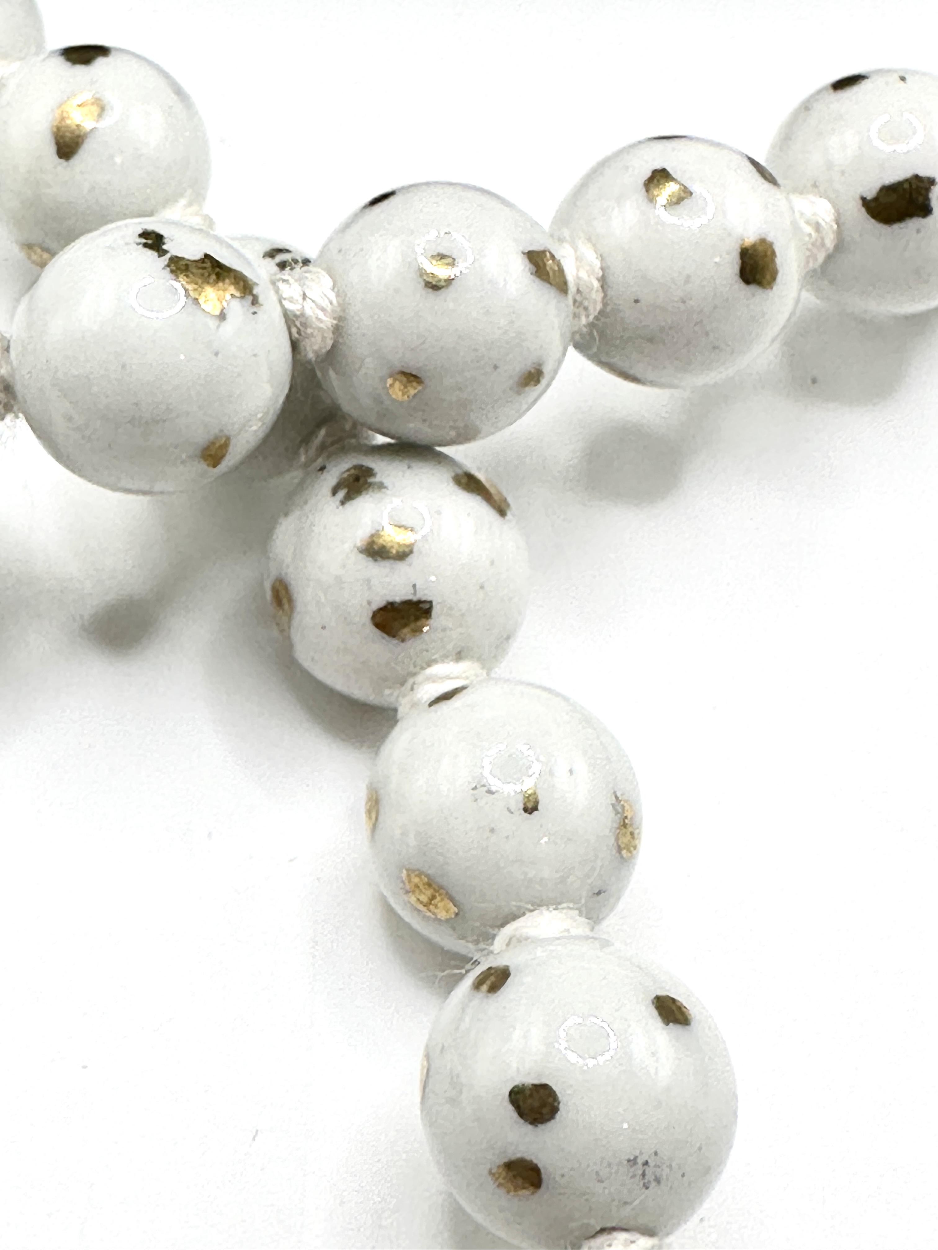 The subject of this listing is a non-automotive item, specifically a single-strand necklace composed of large, round, uniform beads. The beads are white with scattered, irregular inclusions of a gold or brass colour, suggesting a speckled glaze or embedded foil finish. The beads are strung on a white cord or thread. This item cannot be catalogued as a motor vehicle and is listed here for informational purposes only.