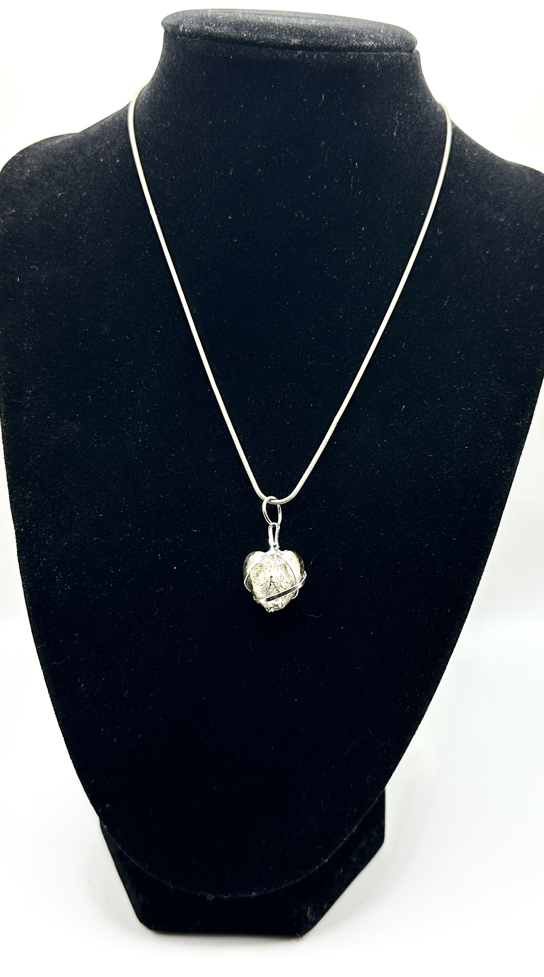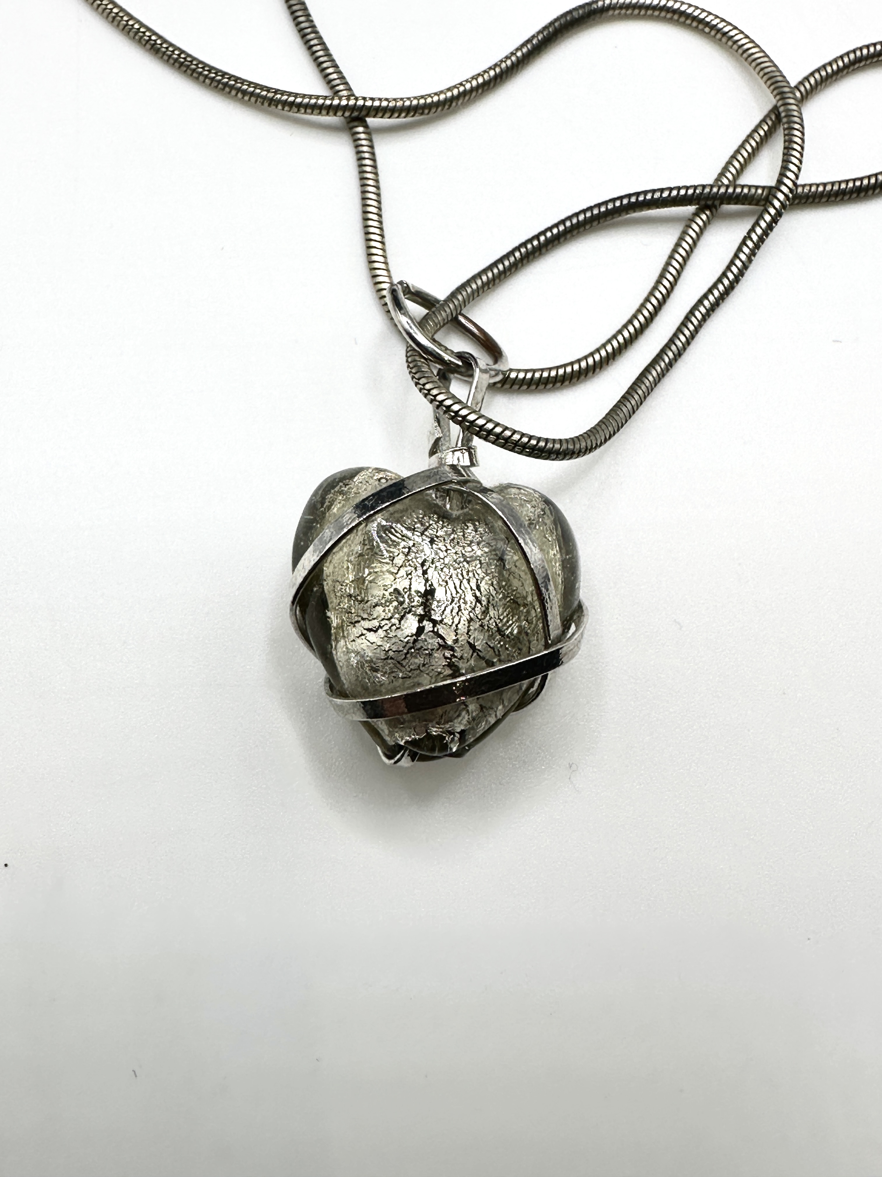 A single necklace confirmed to be constructed of 925 silver. The piece features a snake chain supporting a heart-shaped pendant. The pendant consists of a molded material, likely glass or resin, internally decorated with fractured or foiled metallic inclusions, resulting in a highly reflective, crinkled silvery-gold appearance. This central heart form is secured by a minimalist wire-wrapped cage setting leading to the bail.