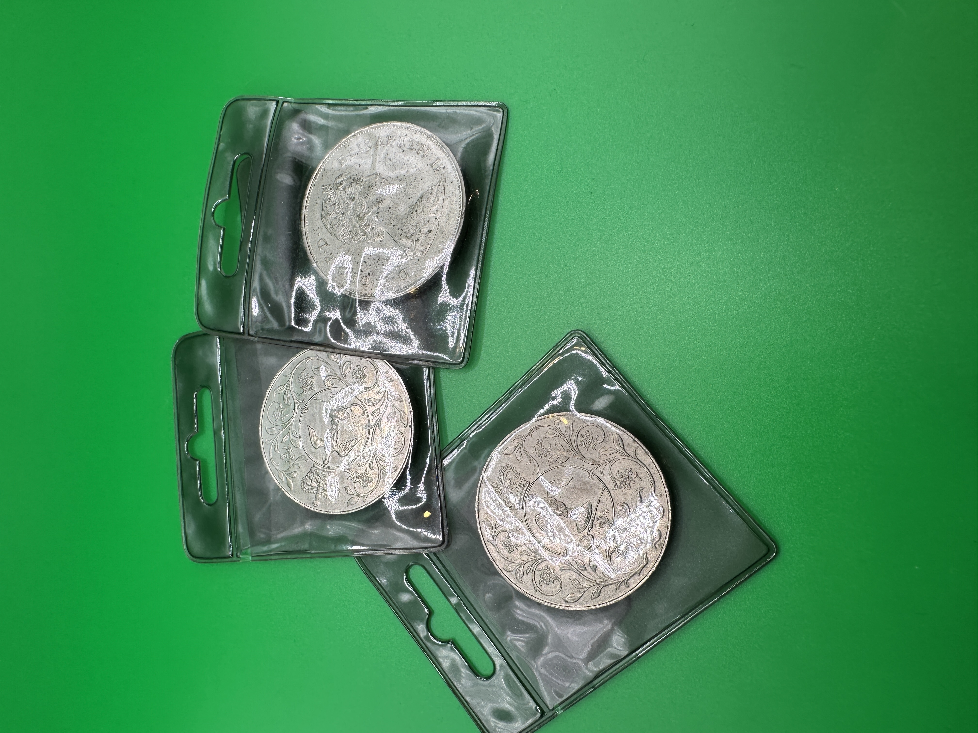 This lot comprises three large-format commemorative medallions, each individually sealed in clear plastic retail packaging. The medallions feature a silver-toned finish. The obverse of one visible example displays a portrait of Queen Elizabeth II in profile. The reverse sides feature detailed engraving work, including elaborate floral motifs and a central depiction of a bird in flight. The exact metal composition and origin are unverified.