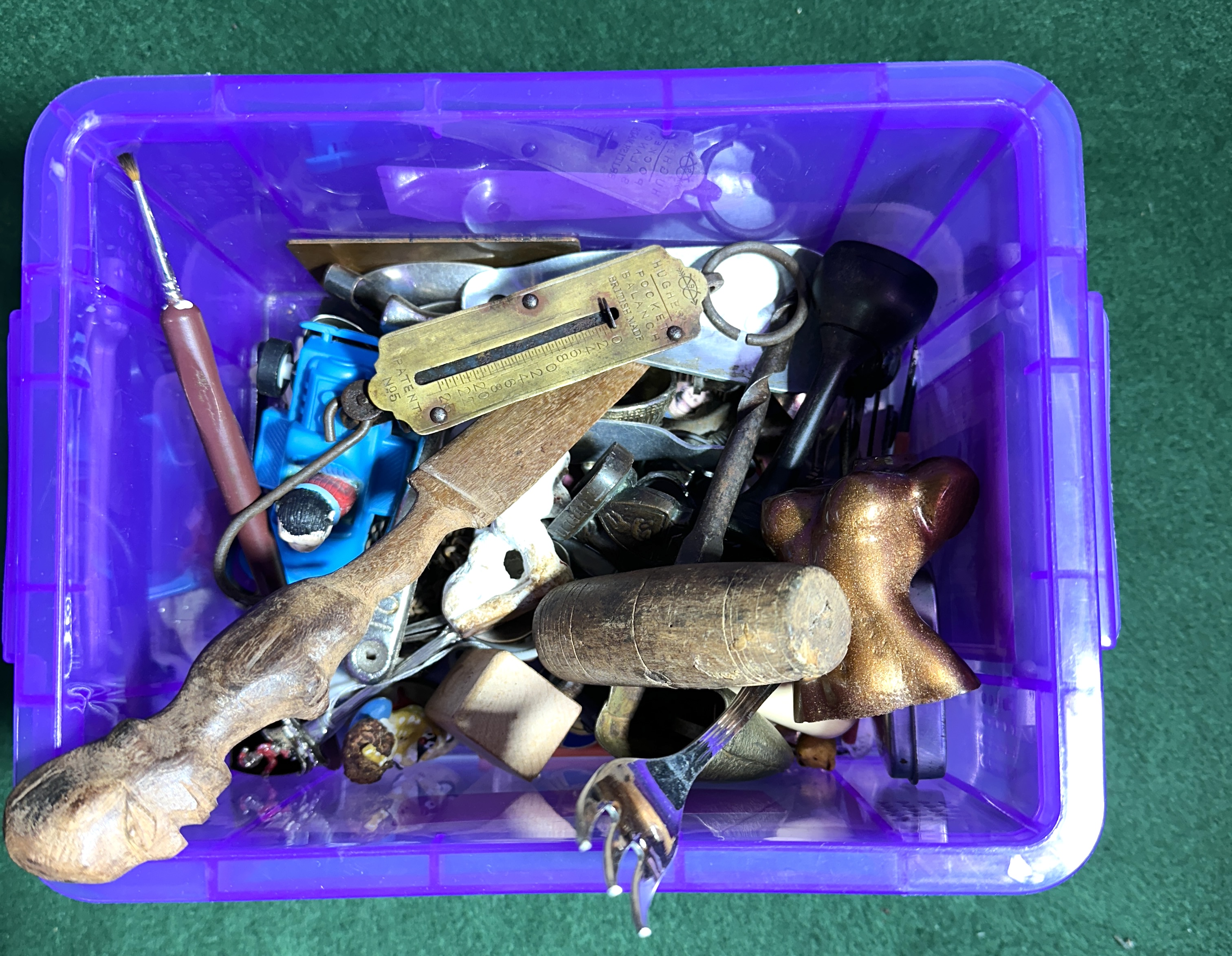 A collection of 16 miscellaneous objects contained within a purple plastic storage bin. The lot includes various materials such as brass, wood, steel, and plastic/resin. Key identifiable items include a brass pocket steelyard scale marked PATENT N*95, HUGHES, and partial text reading BRITISH POCKET BALAN. Also present is a heavily worn cylindrical wooden mallet head, a rough-textured wooden-handled implement, a rusty spiral drill bit or chisel, and a glittering copper-toned resin figurine depicting a stylized torso. Further items include a chrome-plated three-pronged fork, a small blue plastic toy fragment, a paintbrush, and various smaller metal fittings and novelty items.