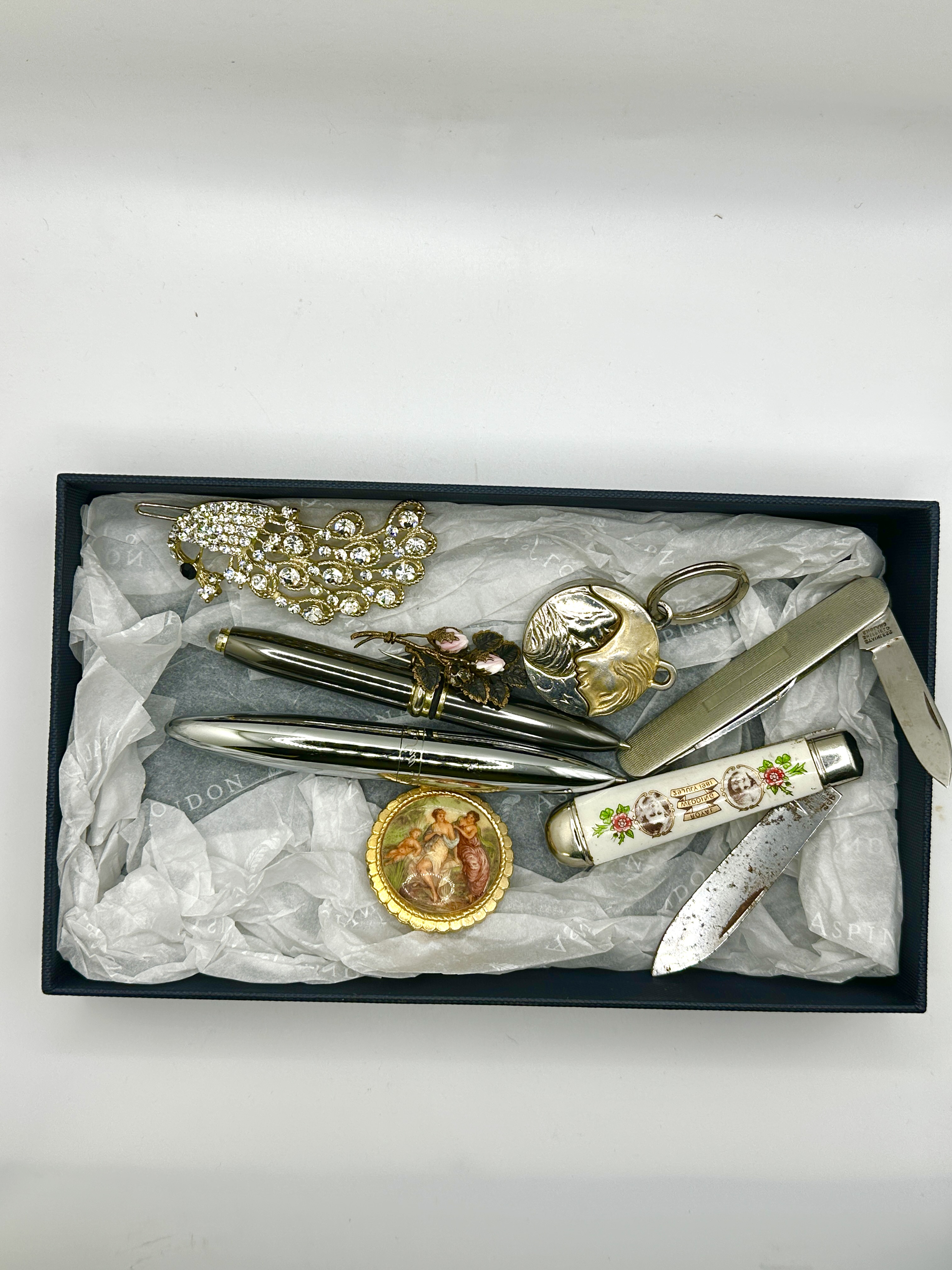 A collection of seven personal accessories presented in a dark rectangular box lined with crumpled white tissue paper bearing partial markings including LONDON and ASPINAL. The assortment includes two chrome-finished ballpoint pens, one of which is adorned with a small applied pink floral spray. Also included is a gold-toned figural costume brooch encrusted with clear and black rhinestones, and a round gold-toned miniature object framed with a scalloped edge and depicting a classical scene of figures, likely an enamel or printed insert. The collection features a silver- and gold-toned figural key ring or fob. Two folding pocket knives are present; one knife has plain silver-toned metal scales, and the second commemorative knife has a white handle decorated with portraits, roses, and reversed text reading ROYAL WEDDING 1881 JULY.