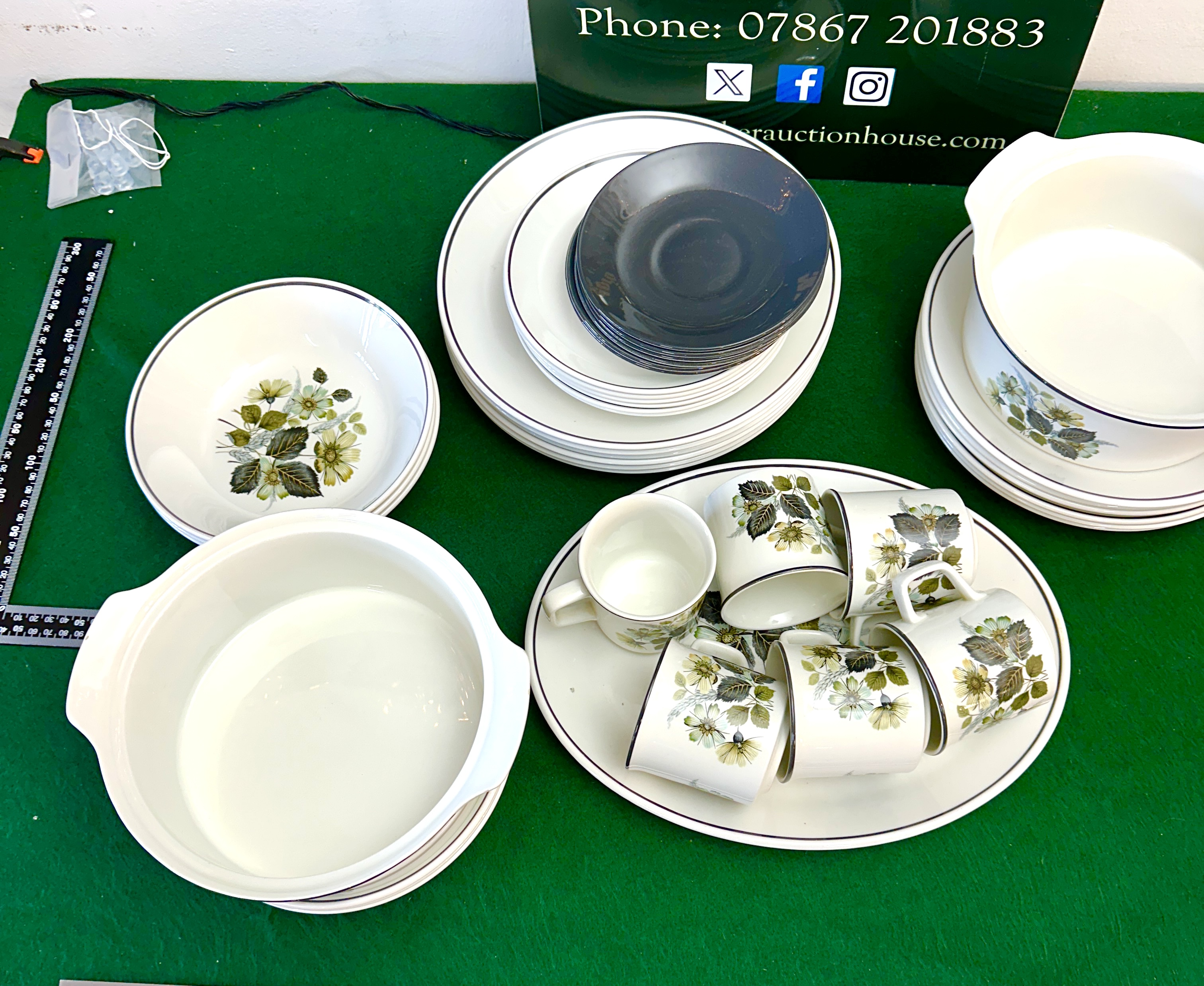A large collection of 44 pieces of vintage dinnerware and serving items constructed from white ceramic or porcelain. The items feature a dark rim border and are decorated with a repetitive transfer-printed botanical design executed in shades of yellowish-green, yellow, and deep brown. The collection comprises a total of 44 items, including 23 plates of various sizes (eight large dinner plates, seven medium plates, and eight small dark-colored plates). Serving items include one large oval casserole base, one oval casserole lid or underplate, one large circular casserole base, one circular casserole lid or underplate, and one medium patterned serving bowl. The collection also includes seven handled mugs displayed on one large oval serving platter, along with three additional underplates for the oval casserole and five additional underplates for the circular casserole. No manufacturer’s marks or pattern names are visible.