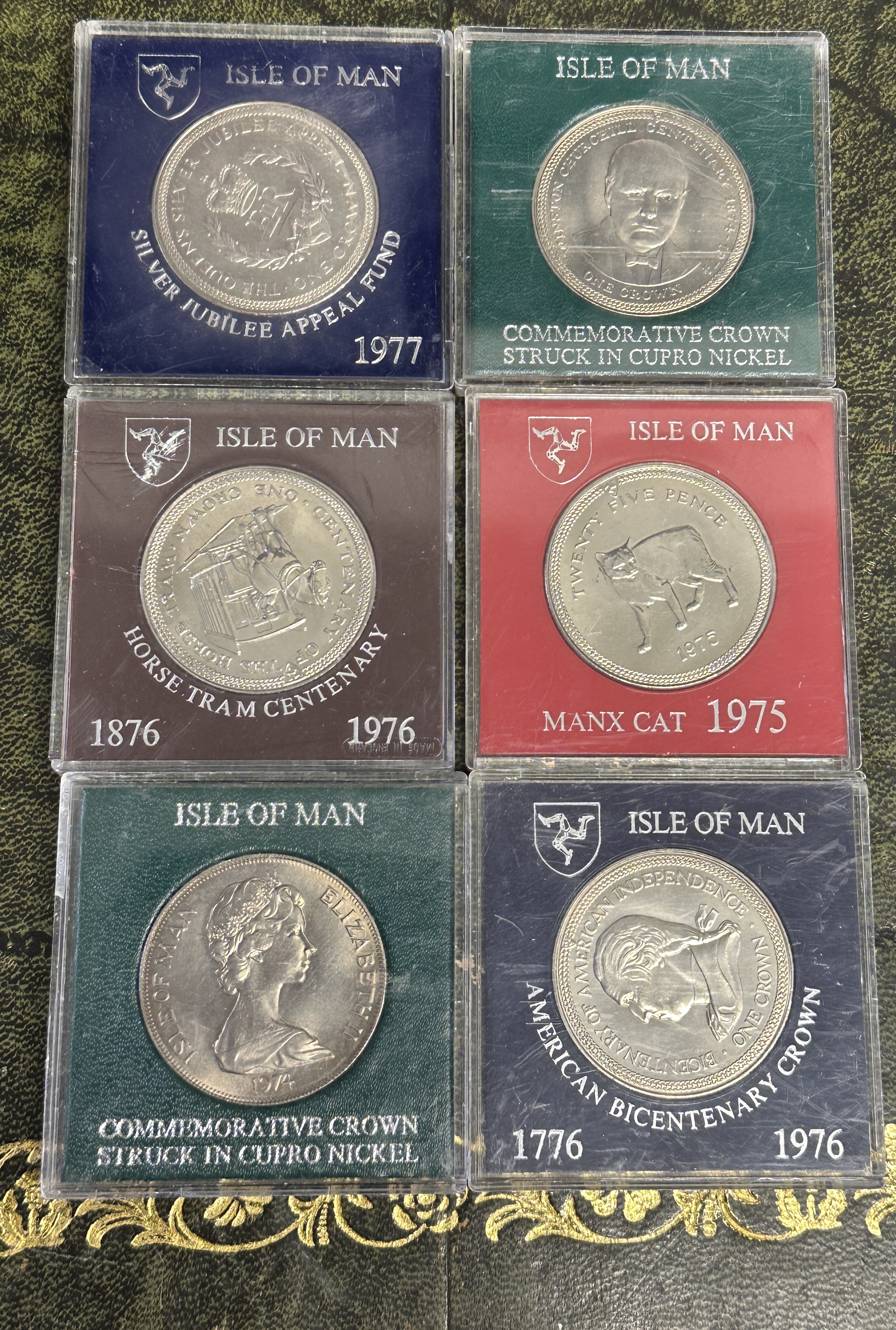 A collection of six Isle of Man commemorative coins, primarily crown-sized issues, struck in cupro nickel and dating from 1975 through 1977. Each coin is housed in its original square clear plastic display case with a colored card insert (blue, green, brown, red, teal, and dark blue). The collection includes various commemorative themes: the Silver Jubilee Appeal Fund 1977, the Horse Tram Centenary 1876 1976, the Manx Cat 1975 (a five pence denomination), and the American Bicentenary Crown 1776 1976. The obverse of the majority of the coins features the profile of Queen Elizabeth II, while one coin features a different male portrait. Several coins are explicitly designated as ‘STRUCK IN CUPRO NICKEL’ on the packaging.