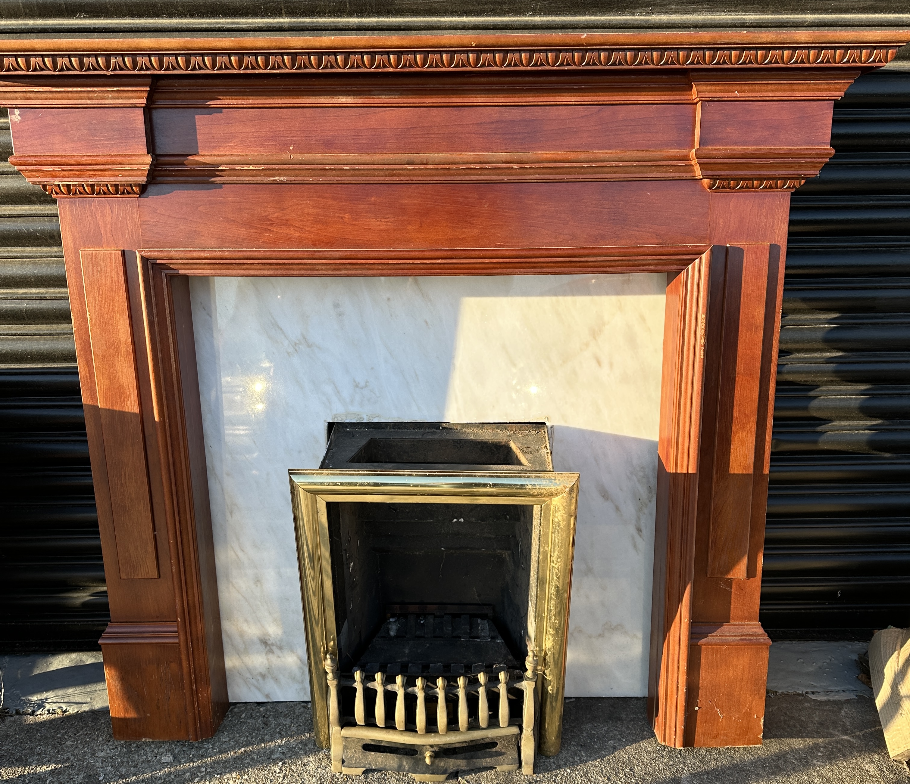 A complete salvaged architectural fireplace assembly comprising a wooden mantelpiece, a marble surround, and a cast iron fire insert with a brass fender. The mantel is constructed of reddish-brown stained wood, likely hardwood or veneer, executed in a traditional style reminiscent of late 19th or early 20th century American or Edwardian design. The cornice features detailed egg-and-dart carving along the frieze, supported by paneled jambs. The internal slips of the surround are polished white or cream-colored marble displaying natural grey and tan veining. Fitted within the opening is a black cast iron fire box and grate. The fire box is fronted by a polished brass surround that incorporates a decorative fender element featuring seven vertical brass balusters.